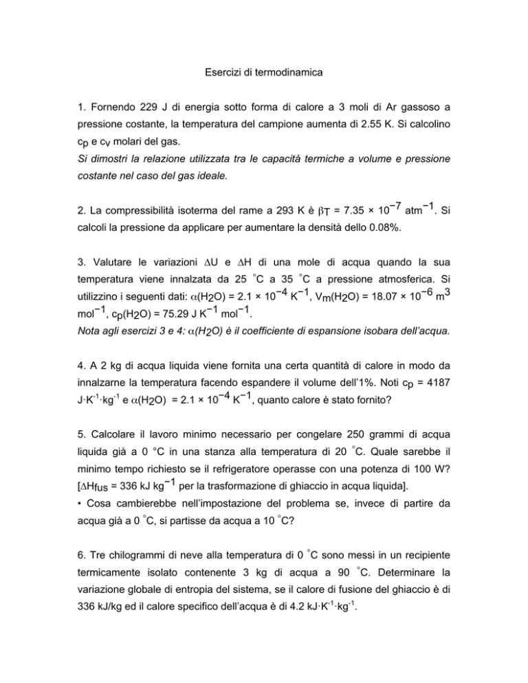 Esercizi di termodinamica 1. Fornendo 229 J di energia sotto forma di calore a 3 moli di Ar gassoso a pressione costante, la temperatura del campione aumenta di 2.55 K. Si calcolino cp e cv molari del gas. Si dimostri la relazione utilizzata tra le capacità termiche a volume e pressione costante nel caso del gas ideale. 2. La compressibilità isoterma del rame a 293 K è βT = 7.35 × 10−7 atm−1. Si calcoli la pressione da applicare per aumentare la densità dello 0.08%. 3. Valutare le variazioni ∆U e ∆H di una mole di acqua quando la sua temperatura viene innalzata da 25 ◦C a 35 ◦C a pressione atmosferica. Si utilizzino i seguenti dati: α(H2O) = 2.1 × 10−4 K−1, Vm(H2O) = 18.07 × 10−6 m3 mol−1, cp(H2O) = 75.29 J K−1 mol−1. Nota agli esercizi 3 e 4: α(H2O) è il coefficiente di espansione isobara dell’acqua. 4. A 2 kg di acqua liquida viene fornita una certa quantità di calore in modo da innalzarne la temperatura facendo espandere il volume dell’1%. Noti cp = 4187 J·K-1·kg-1 e α(H2O) = 2.1 × 10−4 K−1, quanto calore è stato fornito? 5. Calcolare il lavoro minimo necessario per congelare 250 grammi di acqua liquida già a 0 °C in una stanza alla temperatura di 20 ◦C. Quale sarebbe il minimo tempo richiesto se il refrigeratore operasse con una potenza di 100 W? [∆Hfus = 336 kJ kg−1 per la trasformazione di ghiaccio in acqua liquida]. • Cosa cambierebbe nell’impostazione del problema se, invece di partire da acqua già a 0 ◦C, si partisse da acqua a 10 ◦C? 6. Tre chilogrammi di neve alla temperatura di 0 ◦C sono messi in un recipiente termicamente isolato contenente 3 kg di acqua a 90 ◦C. Determinare la variazione globale di entropia del sistema, se il calore di fusione del ghiaccio è di 336 kJ/kg ed il calore specifico dell’acqua è di 4.2 kJ·K-1·kg-1. 7. Calcolare la variazione di U, H, A e G durante l’evaporazione di 20 g di etanolo (PM = 46.07) al suo punto di ebollizione alla pressione di 1 bar (Teb = 351.4 K) noto il calore latente di evaporazione di 837.4 kJ kg-1. Suggerimenti: la variazione di volume conseguente all’evaporazione di ∆n moli di etanolo, è approssimabile al volume di vapore prodotto. Si assuma che l’etanolo vapore abbia comportamento ideale. 8. Calcolare il lavoro di tipo PV e il calore assorbito da 5 moli di acqua per passare in fase vapore durante l’ebollizione alla pressione di 1 bar, nota la corrispondente variazione di entropia molare ∆Seb = 109.0 J K-1 mol-1. Suggerimenti: la variazione di volume conseguente all’evaporazione delle 5 moli di acqua è approssimabile al volume di vapore prodotto. Si assuma che l’acqua in forma di vapore abbia comportamento ideale. 9. Si dia l’espressione di ∆S per 1 mole di gas ideale sottoposto alla trasformazione (p1, V1) → (p2, V2). Quanto vale ∆S per una mole di gas ideale sottoposta ad una espansione isoterma in cui il volume raddoppia? Quanto vale ∆S per una mole di gas ideale sottoposta a dimezzamento del volume e raddoppio della temperatura assoluta? 10. Un pezzo di ferro di 2 Kg a 500 ◦C viene immerso in acqua a 100 ◦C in equilibrio con il suo vapore alla pressione di 1 bar. Calcolare la variazione totale di entropia. (Il calore specifico del ferro è pari a 450 J kg-1 K-1). Risultato: ∆Stot = 309 J K-1. 11. Un campione di 10 kg di acqua a 20 ◦C è convertito in ghiaccio a −10◦C ponendolo a contatto con un termostato a −10◦C. Calcolare la variazione di entropia per il sistema costituito dal termostato e dal campione. Il calore di fusione del ghiaccio è di 334 kJ kg-1, mentre i calori specifici dell’acqua e del ghiaccio sono rispettivamente 4.18 kJ kg-1 K-1 e 2.09 kJ kg-1 K-1. Risultati: ∆SH2O=−15.94 kJ K−1, ∆STerm.=+16.67 kJ K−1, ∆Stot=+700 JK−1 12. Calcolare la variazione di entropia quando 100 g di etanolo (cp = 111.46 J K-1 mol-1, PM = 46.07 g/mole) a 60 ◦C sono mescolati a 150 g di etanolo a 10 ◦C in un recipiente termicamente isolato. Risultato: ∆S = 2.0 J K−1 13. Due campioni di 1 kg di acqua (cp = 4.18 kJ kg-1 K-1) a temperature diverse vengono mescolati a pressione costante, e all’interno di un contenitore che non consente scambio di calore con l’esterno, per ottenere dell’acqua alla temperatura di 25 ◦C . Qual è la temperatura iniziale dei due campioni se la variazione di entropia nel mescolamento è ∆S = 11.8 J/K? Risultato: T1 = 9.2 ◦C , T2 = 40.8 ◦C (o viceversa) 14. Mediante misure di densità sono stati ottenuti, alla temperatura di 298 K, i valori del volume di una soluzione di etanolo in acqua che sono stati riportati in tabella al variare della concentrazione molale di etanolo: m (etanolo) (mol/kg) V (mL) 0.0000 1003.0 2.0000 1130.0 4.0000 1190.0 6.0000 1330.0 8.0000 1380.0 10.000 1600.0 12.000 1680.0 14.000 1710.0 16.000 1900.2 18.000 2120.0 20.000 2210.0 Determinare la curva di fitting dell’andamento del volume della soluzione in funzione della molalità di etanolo e il volume parziale molare dell’etanolo. Esercizi di cinetica chimica 1. La concentrazione di atomi di trizio (3H, isotopo radioattivo dell’idrogeno) nell’aria è circa di 5 × 10−15 moli/litro. Il suo tempo di dimezzamento t è di 12 1/2 anni, circa. Quanto tempo è richiesto affinché si abbia una riduzione del 90% della concentrazione di trizio in assenza di processi di formazione dello stesso? [Nota: il decadimento radioattivo segue una cinetica del primo ordine] 2. La costante di velocità per la decomposizione di SO2Cl2 gassoso è di 6.09×10−5 min−1 a 552 K. Calcolare la costante di velocità a 600 K sapendo che l’energia di attivazione per il processo è di 210 kJ/mol. 3. Il tempo di dimezzamento di una reazione di dissociazione di una certa sostanza, che segue una cinetica del primo ordine, è di 100 minuti a 323 K e 15 minuti a 353 K. Calcolare l’energia di attivazione della reazione di dissociazione. 4. A 600 K è stata seguita la variazione nel tempo della pressione pa