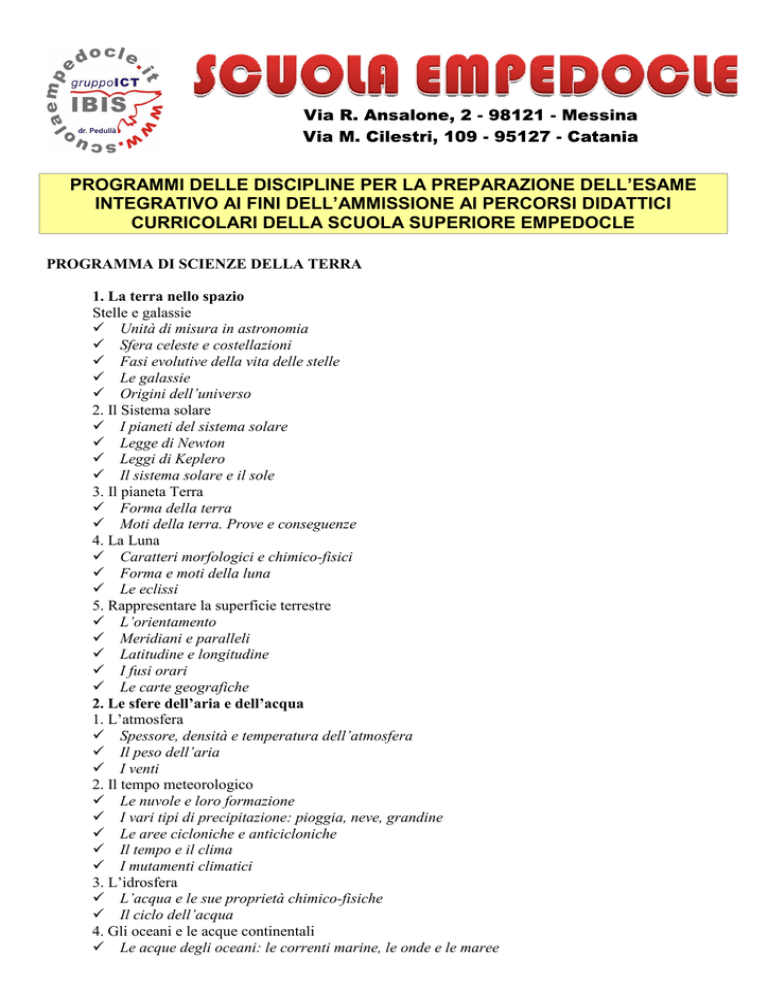 PROGRAMMI DELLE DISCIPLINE PER LA PREPARAZIONE DELL’ESAME INTEGRATIVO AI FINI DELL’AMMISSIONE AI PERCORSI DIDATTICI CURRICOLARI DELLA SCUOLA SUPERIORE EMPEDOCLE PROGRAMMA DI SCIENZE DELLA TERRA 1. La terra nello spazio Stelle e galassie Unità di misura in astronomia Sfera celeste e costellazioni Fasi evolutive della vita delle stelle Le galassie Origini dell’universo 2. Il Sistema solare I pianeti del sistema solare Legge di Newton Leggi di Keplero Il sistema solare e il sole 3. Il pianeta Terra Forma della terra Moti della terra. Prove e conseguenze 4. La Luna Caratteri morfologici e chimico-fisici Forma e moti della luna Le eclissi 5. Rappresentare la superficie terrestre L’orientamento Meridiani e paralleli Latitudine e longitudine I fusi orari Le carte geografiche 2. Le sfere dell’aria e dell’acqua 1. L’atmosfera Spessore, densità e temperatura dell’atmosfera Il peso dell’aria I venti 2. Il tempo meteorologico Le nuvole e loro formazione I vari tipi di precipitazione: pioggia, neve, grandine Le aree cicloniche e anticicloniche Il tempo e il clima I mutamenti climatici 3. L’idrosfera L’acqua e le sue proprietà chimico-fisiche Il ciclo dell’acqua 4. Gli oceani e le acque continentali Le acque degli oceani: le correnti marine, le onde e le maree Le acque continentali: fiumi, laghi e ghiacciai Le falde acquifere 3. La sfera delle rocce 1. Le rocce della litosfera Involucri rocciosi del globo terrestre I diversi tipi di rocce della crosta: rocce ignee, sedimentarie e metamorfiche Il ciclo delle rocce 2. I minerali I minerali: composizione chimica e caratteri chimici e fisici Il reticolo cristallino I silicati Diamante e grafite 3. Il modellamento della superficie terrestre Degradazione delle rocce L’azione modellante dei corsi d’acqua, dei ghiacciai, del vento e del mare Le frane e il rischio idrogeologico 4. Le dinamiche della terra 1. I vulcani Il calore interno della terra Vulcani, magmi e lave Diversi tipi di magmi associati a diversi tipi di attività vulcanica Gli edifici vulcanici Forme secondarie dell’attività vulcanica Il rischio vulcanico 2. I terremoti Origine e causa di un terremoto Onde sismiche, sismografi e i sismogrammi Come misurare la forza di un terremoto: scala Percalli e scala Richter Il rischio sismico: prevenzione e difesa 3. La tettonica delle placche Le dimensioni e i movimenti delle placche I margini divergenti, convergenti e trascorrenti Formazione delle montagne 5. La storia della vita sulla terra 1. I fossili Classificazione dei fossili Datazione dei fossili 2. Le ere geologiche 6. Le risorse del pianeta 1. Le risorse naturali e il loro sfruttamento Risorse rinnovabili e non Metalli abbondanti, rari e rarissimi Le risorse energetiche e il loro sfruttamento PROGRAMMA DI BIOTECNOLOGIE MEDICHE, ALIMENTARI E OGM 1. BIOETICA E BIOTECNOLOGIE Le questioni etiche sollevate dalle biotecnologie: esseri umani animali e ambiente Bioetica e diritto Biotecnologie ed esseri umani Il Progetto Genoma Umano La Clonazione Gli xenotrapianti Biotecnologie animali Etica e animali: benessere o diritti? Gli animali transgenici tra sperimentazione e zootecnia Biotecnologie e ambiente Filosofie dell'ambiente, filosofie dell'ecologia Il valore delle specie e della biodiversità 2. Regolazione della scienza e diritto delle biotecnologie: Incertezza, valutazione dei rischi e principio di precauzione DISCIPLINE GIURIDICHE ED ECONOMICHE 1. Le Regole Giuridiche e i presupposti del diritto 2. Le fonti del diritto 3. La norma giuridica (Interpretazione ed Efficacia) 4. Forme di Stato e Forme di Governo 5. I Principi Fondamentali della Costituzione 6. La Costituzione Repubblicana 7. L'Ordinamento della Repubblica 8. Il Parlamento e gli atti Normativi 9. Il Governo 10. Il Presidente della Repubblica 11. La Magistratura 12. Il Sistema economico: I soggetti e la relazione tra gli stessi 13. I Sistemi economici nel tempo 14. La Famiglia: i consumi e il risparmio BIOCHIMICA, BIOLOGIA MOLECOLARE, MICROBIOLOGIA • • • • • • • • • • • • • • • • • • Struttura e proprietà dell’acqua Struttura delle proteine Funzioni enzimatiche Principi di bioenergetica: reazioni endo ed esoergoniche Glicolisi, ciclo di Krebs, fosforilazione ossidativa Fermentazione ATP Struttura di DNA e RNA Concetto di gene Meccanismo di replicazione del DNA Trascrizione e traduzione Il codice genetico La cellula batterica Coniugazione, trasformazione e traduzione nei batteri Plasmidi: struttura e funzione Struttura dei virus Funzionamento dei virus a DNA e ad RNA Ciclo litico e lisogenico