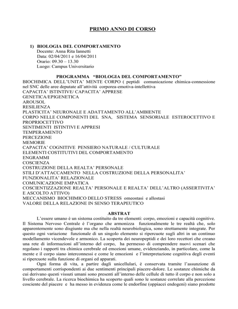PRIMO ANNO DI CORSO 1) BIOLOGIA DEL COMPORTAMENTO Docente: Anna Rita Iannetti Data: 02/04/2011 e 16/04/2011 Orario: 09.30 – 13.30 Luogo: Campus Universitario PROGRAMMA “BIOLOGIA DEL COMPORTAMENTO” BIOCHIMICA DELL’UNITA’ MENTE CORPO ( peptidi comunicazione chimica-connessione nel SNC delle aree deputate all’attività corporea-emotiva-intellettiva CAPACITA’ ISTINTIVE/ CAPACITA’ APPRESE GENETICA/EPIGENETICA AROUSOL RESILIENZA PLASTICITA’ NEURONALE E ADATTAMENTO ALL’AMBIENTE CORPO NELLE COMPONENTI DEL SNA, SISTEMA SENSORIALE ESTEROCETTIVO E PROPRIOCETTIVO SENTIMENTI ISTINTIVI E APPRESI TEMPERAMENTO PERCEZIONE MEMORIE CAPACITA’ COGNITIVE PENSIERO NATURALE / CULTURALE ELEMENTI COSTITUTIVI DEL COMPORTAMENTO ENGRAMMI COSCIENZA COSTRUZIONE DELLA REALTA’ PERSONALE STILI D’ATTACCAMENTO NELLA COSTRUZIONE DELLA PERSONALITA’ FUNZIONALITA’ RELAZIONALE COMUNICAZIONE EMPATICA COSCIENTIZZAZIONE REALTA’ PERSONALE E REALTA’ DELL’ALTRO (ASSERTIVITA’ E ASCOLTO ATTIVO) MECCANISMO BIOCHIMICO DELLO STRESS omeostasi e allostasi VALORE DELLA RELAZIONE IN SENSO TERAPEUTICO ABSTRAT L’essere umano è un sistema costituito da tre elementi: corpo, emozioni e capacità cognitive. Il Sistema Nervoso Centrale è l’organo che armonizza funzionalmente le tre realtà che, solo apparentemente sono disgiunte ma che nella realtà neurobiologica, sono strettamente integrate. Per questo ogni variazione funzionale di un singolo elemento si ripercuote sugli altri in un continuo modellamento vicendevole e armonico. La scoperta dei neuropeptidi e dei loro recettori che creano una rete di informazioni all’interno del corpo, ha permesso di comprendere nuovi scenari che regolano i rapporti tra chimica cerebrale ed emozioni umane, evidenziando, in particolare, come la mente e il corpo siano interconnessi e come le emozioni e l’interpretazione cognitiva degli eventi si ripercuote sulla funzione di organi ed apparati. Ogni forma di vita, a partire dagli unicellulari, è conservata tramite l’assunzione di comportamenti corrispondenti ai due sentimenti principali piacere-dolore. Le sostanze chimiche da cui derivano questi vissuti umani sono presenti all’interno delle cellule di tutto il corpo e non solo a livello cerebrale. La ricerca biochimica ha scoperto quali sono le sostanze correlate alla percezione cosciente del piacere e ha messo in evidenza come le endorfine (oppiacei endogeni) siano prodotte nel SNC in relazione a numerose esperienze che vanno dall’attività motoria all’assunzione di cibo o al gioco delle carte ecc. Anche il dolore ha le sue sostanze di riferimento come per esempio la sostanza P e la norepinefrina. La straordinarietà della scoperta però non risiede nel fatto che il nostro corpo è capace di produrre sostanze simili a quelle che, in un’accezione negativa, noi consideriamo droghe, ma sta nel fatto che queste stesse sostanze sono prodotte da altre cellule del corpo oltre che dai neuroni e che le ritroviamo nelle altre forme di vita compreso gli unicellulare come la Tetrahymena. Evidentemente per tutte le forme di vita, dalle più semplici alle più complesse,la sopravvivenza è sostenuta da uguali comportamenti fondamentali e quindi le sostanze chimiche da cui questi comportamenti hanno origine sono presenti in maniera ubiquitaria in ogni essere vivente. Le capacità cognitive rendono possibile la consapevolezza dell’azione e anche il blocco dell’innesco reattivo automatico, per cui all’essere umano si attribuisce la capacità di “intendere e volere”. La sensibilità del “sistema uomo” come reattività istintuale alle sollecitazioni ambientali è legata alle caratteristiche individuali di eccitabilità del SNA e dei nuclei emotivi profondi (arousal) . Il primo predispone il corpo all’azione, modulando le variazioni funzionali di organi ed apparati, il secondo attiva il comportamento che il corpo è pronto a compiere. Questi due elementi congiunti costituiscono il così detto temperamento, importante elemento per la comprensione della estrema variabilità della risposta individuale ad uno stesso stimolo ambientale. Il temperamento è innato,la sua influenza è massima anche nella costruzione di tutti gli elementi derivanti da un processo di apprendimento. Il pensiero naturale contribuisce al potenziamento della reattività istintuale corporea-emotiva che, se inceppata come risposta fissa di allarme (fissità attivazione simpatica e emozioni corrispondenti , in poche parole meccanismo dello stress) può risultare disfunzionale costituendo esso stesso punto di partenza del meccanismo patologico. Attraverso il pensiero consapevole si può interpretare lo stimolo diversamente da come viene percepito dal pensiero naturale e questo rende possibile agire sulla modulazione (varia l’arousal) di tutte e tre le componenti creando i presupposti all’interruzione degli automatismi disfunzionali . Tutti i fenomeni facenti parte dell’esistenza umana sono riferibili all’azione di sostanze chimiche che legandosi a specifici siti recettoriali attivano il corpo, producono emozioni e danno la possibilità di formulare il pensiero. La coscienza estesa è una capacità appresa, deriva da un allenamento specifico che ci rende capaci di riconoscere l’attivazione corporea e il corrispondente stato emotivo e di poterlo verbalizzare tramite la costruzione del pensiero che “racconta” a noi stessi, ed eventualmente ad altri, l’esperienza vissuta. In un sistema socio-culturale in cui anche solo l’elencazione dei sentimenti risulta difficoltosa, appare evidente quanto sia scarsamente agita sia la coscienza del “SE’” sia la possibilità di riconoscere le “realtà” degli altri. Ma questi, purtroppo, sono gli elementi su cui fonda la relazione interpersonale profonda che, nell’accettazione incondizionata e accudente di un altro essere umano, attivano la chimica dell’amore e creano il presupposto ambientale più efficace al ripristino del benefico in