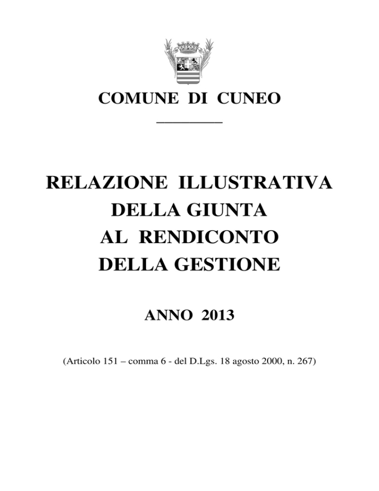 COMUNE DI CUNEO ________ RELAZIONE ILLUSTRATIVA DELLA GIUNTA AL RENDICONTO DELLA GESTIONE ANNO 2013 (Articolo 151 – comma 6 - del D.Lgs. 18 agosto 2000, n. 267) INDICE PREMESSE GENERALI - Introduzione ............................................................................... pag. - Analisi degli scostamenti............................................................. pag. - Criteri di valutazione.................................................................... pag. - Conclusioni e dati generali su popolazione, territorio e servizi .... pag. 1 2 3 3 1) LE QUESTIONI GENERALI - Servizi amministrativi e demografici ............................................ pag. 5 2) GLI ELEMENTI ECONOMICI - Servizi finanziari .......................................................................... pag. - Economato .................................................................................. pag. - Tributi .......................................................................................... pag. - Patrimonio e attività di piano ...................................................... pag. 11 13 13 16 3) LA PERSONA - Cultura, Biblioteche, Musei e spettacoli, Università..................... pag. - Sport, Manifestazioni e Turismo, Pari opportunità…… .............. pag. - I servizi e le attività socio-educative ........................................... pag. 21 27 28 4) IL TERRITORIO - Lavori pubblici ............................................................................. pag. 48 - Ambiente e Territorio .................................................................. pag. 65 Politiche energetiche .................................................................. pag. 66 Trasporti ...................................................................................... pag. 73 Protezione civile .......................................................................... pag. 84 Parco fluviale .............................................................................. pag. 89 Edilizia, Pianificazione urbanistica e strategica, sistemi informativi territoriali...................................................................................... pag. 115 5) LE ATTIVITA’ PRODUTTIVE - Attività produttive......................................................................... pag. 125 6) L’ORGANIZZAZIONE - Settore Personale ....................................................................... pag. - Servizio controllo di gestione....................................................... pag. - Settore Elaborazione Dati ........................................................... pag. - Polizia Municipale ....................................................................... pag. - Quartieri ...................................................................................... pag. - Settore Legale............................................................................. pag. 126 128 128 130 136 137 RELAZIONE TECNICA................................................................. pag. 142 PREMESSE GENERALI INTRODUZIONE Il rendiconto della gestione composto dal conto del bilancio, conto economico e conto del patrimonio rappresenta il momento finale di rilevazione dei risultati finanziari della gestione intrapresa nell’azione di implementazione dei programmi e dei progetti contenuti nella relazione previsionale e programmatica allegata al bilancio di previsione annuale. La funzione di rendicontazione, un tempo considerata secondaria rispetto a quella di programmazione intrapresa nell’impostazione del bilancio di previsione, sta acquistando negli ultimi anni un’importanza sempre più rilevante. La rivalutazione del suo ruolo deriva dalla consapevolezza acquisita sulle difficoltà e sulle problematiche a cui si può giungere per il tramite di una rendicontazione tendenziosa improntata a nascondere la realtà finanziaria anziché a rilevarne in modo asettico gli scostamenti, affinché si possano intraprendere quelle azioni correttive necessarie alla piena realizzazione degli obiettivi programmati. La tutela della veridicità dei risultati finanziari rappresenta la principale forma di tutela della buona fede dei propri cittadini, che confidano in una gestione delle risorse collettive, non solo in modo efficace, ma altresì efficiente ed economico. Per non tradire la fiducia che la collettività locale ripone nei propri rappresentanti, diventa importante e fondamentale la difesa della veridicità del bilancio come valore da perseguire in modo perenne, in particolare per ciò che riguarda il documento che fotografa la situazione finanziaria in cui l’ente si trova ad operare. Proprio per ciò l’approvazione del rendiconto della gestione passata rappresenta un momento strategico nell’esercizio della funzione di controllo, demandata all’organo consiliare dell’ente, sulla veridicità dei dati illustrati, per meglio tutelare la fiducia della collettività amministrata ma, altresì, per gettare fondamenta solide e reali necessarie ad impostare una seria e proficua programmazione sul futuro benessere della collettività stessa. ANALISI DEGLI SCOSTAMENTI Il bilancio di previsione 2013 è stato oggetto di 7 variazioni complessive per un totale generale di poco più di 4 milioni di euro, che hanno portato le previsioni dagli 81,7 milioni iniziali agli 85,7 milioni finali, con un modesto incremento del 4,96% se confrontato con il 24,28% dell’esercizio precedente. La parte corrente del bilancio è aumentata dell’1,30% per quanto riguarda l’entrata e del 5,81% per quanto riguarda la spesa, mentre al contrario la parte in conto capitale è aumentata del 12,85% nell’entrata e del 5,41% nella spesa. La dicotomia è dovuta all’incremento dell’utilizzo di proventi delle concessioni edilizie per la spesa corrente, resa possibile solo dal mese di luglio dopo l’approvazione della deroga legislativa. Infatti, in totale la previsione della spesa corrente è stata incrementata 