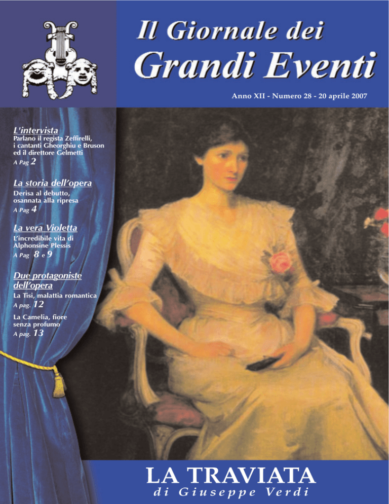 Anno XII - Numero 28 - 20 aprile 2007 L'intervista Parlano il regista Zeffirelli, i cantanti Gheorghiu e Bruson ed il direttore Gelmetti A Pag 2 La storia dell’opera Derisa al debutto, osannata alla ripresa A Pag 4 La vera Violetta L’incredibile vita di Alphonsine Plessis A Pag 8 e9 Due protagoniste dell’opera La Tisi, malattia romantica A pag. 12 La Camelia, fiore senza profumo A pag. 13 LA TRAVIATA d i G i u s e p p e Ve r d i La Traviata 2 Parlano Zeffirelli, Gheorghiu, Bruson e Gelmetti «Questo allestimento farà storia» L la Gheorghiu, una delle ’attesa per questa migliori Violette a livello Traviata, nuovo alleinternazionale. Ad affianstimento con la regia carla tre giovani soprano di di Franco Zeffirelli - come grande avvenire Irina Lungia da mesi si è letto dai gu, Myrtò Papatanasiu ed giornali - è grande. Da NoAnna Rita Talento. «Abbiavembre esauriti tutti i bimo un cast di giovani straorglietti ed anche quelli per le dinario – dice Zeffirelli – un due repliche aggiuntive fuori abbonamento sono andati a ruba in poche ore. «E’ la mia ottava Traviata», sottolinea Zeffirelli. «Ne ho sposate tante e le ho amate tutte, ma questa volta nell’età matura ho trovato quella che si avvicina alla perfezione», dice l’84enne regista fiorentino. «Traviata è un ti- Angela Gheorghiu e Franco Zeffirelli tolo per il quale c’è insieme che fa venire la voglia sempre stata attesa e ci si va di vederle tutte. Come si vede, come ad un pellegrinaggio. le voci straniere cominciano a C’è una sorte di reverenziale dominare in questa forma rispetto verso questa prostitud’arte che era prettamente itata che si sacrifica per l’amore. liana. Purtroppo abbiamo un Se ci fosse la possibilità, credo governo che non fa nulla per che sarebbe beatificata, sarebaiutare la musica lirica, i giobe la Santa martire dell’amovani, i teatri. Da Oltrecortina re». «Questa Traviata è più abbiamo, invece un contributo vicina delle altre a quella del di voci fondamentale, del quamio debutto con questo titolo le qualsiasi impresario non nel 1958. La penso come un potrebbe fare a meno. Mi sono flash back ed anche Verdi cochiesto come avvenisse la pemincia l’opera con una musinetrazione nei piccoli villaggi. ca greve, triste, che contiene la Maria Guleghina, me lo ha storia». Nelle dieci recite si spiegato: sentono i dischi, imialterneranno 4 soprano. tano e poi c’è una grande rete Prima voce – anche se per di concorsi. Noi non siamo casole due recite – sarà Ange- ~ ~ La Copertina ~ ~ John William Waterhouse (1849 -1817) Miss Margaret Henderson - Coll. Privat. Il G iornale dei G randi Eventi Direttore responsabile Andrea Marini Direzione Redazione ed Amministrazione Via Courmayeur, 79 - 00135 Roma e-mail: [email protected] Editore A. M. Stampa Tipografica Renzo Palozzi Via Vecchia di Grottaferrata, 4 - 00047 Marino (Roma) Registrazione al Tribunale di Roma n. 277 del 31-5-1995 © Tutto il contenuto del Giornale è coperto da diritto d’autore Le fotografie sono realizzate in digitale con fotocamera Kodak Easyshare V705 Visitate il nostro sito internet www.giornalegrandieventi.it dove potrete leggere e scaricare i numeri del giornale piti in Patria. A me per esempio il Metropolitan di New York mi ha gia mandato un invito per il 27 marzo 2008 perché farà una serata sulle regie liriche di Zeffirelli degli ultimi 20 anni». Interviene il soprano Angela Gheorghiu, reduce dal Met, dove è stata impegnata proprio in una Traviata firmata dal maestro: «I registi dovrebbero studiare il lavoro di Zeffirelli e prenderne esempio. Vi assicuro che all’estero per le sue scene, anche dopo 40 anni, quando si apre il sipario, c’è l’applauso». Parlando del ruolo, la cantante dice: «Ho avuto pochi giorni per lavorare qui a Roma, ma mi sono resa conto di essere in un allestimento da sogno. Di Traviata non ne ho fatte tante, solo quando conoscevo tutti i dettagli. Violetta è un personaggio che tutti vorrebbero essere». Altro grande protagonista di questa Traviata, ha detto Zeffirelli è il baritono Renato Bruson: «un genio assoluto del melodramma. E’ un mostro nel cogliere il sottile, che è più importante del clamoroso». «Il 28 aprile di 45 anni fa, all’inizio della carriera, debuttava sul palcoscenico del Teatro dell’Opera di Roma con I Puritani », dice Gianluigi Gelmetti, direttore principale del Teatro e sul podio per questo allestimento. «Proprio sabato 28 gli faremo una grande festa a sorpresa». «Zeffirelli – dice Bruson – è l’unico che rispetta il personaggio di Violetta, la fa vivere tra i suoi mobili, i suoi arredi che solo 3 settimane dopo la sua morte (lo dice anche Dumas) furono messi all’asta. Non quegli allestimenti minimalisti per un’opera che vuole lo sfarzo nel quale viveva la protagonista». «Sul piano musicale, come al solito ho cercato di rispettare lo spartito», dice Gelmetti «Ho solo ridotto un po’ le maschere del Balletto Spagnolo voluto da Zeffirelli. Le tre giovani Violette saranno le Violette del futuro…vedrete!». Andrea Marini Il Giornale dei Grandi Eventi I prossimi titoli della Stagione 2007 al Teatro Costanzi 16 - 22 Maggio LA FILLE DU RÉGIMENT Direttore Interpreti di Gaetano Donizetti Bruno Campanella Carmela Remigio, Aldo Caputo, Alberto Rinaldi, Anna Procleme 15 - 23 Giugno MANON LESCAUT di Giacomo Puccini Donato Renzetti Norma Fantin, Marco Berti Direttore Interpreti Stagione Estiva alle Terme di Caracalla 17 - 28 Luglio NABUCCO di Giuseppe Verdi Antonio Pirolli Carlo Guelfi, Andrea Gruber, Samuel Ramey Direttore Interpreti 27 Luglio - 9 Agosto TURANDOT di Giacomo Puccini Alain Lombard Antonello Palombi , Giovanna Casolla, Mina Tasca, Cristina Ferri, Michail Ryssov Direttore Interpreti 8 - 14 Agosto PAGLIACCI di Ruggero Leoncavallo Hirofumi Yoshida Vincenzo La Scola, Maria Carola, Carlo Guelfi, Domenico Balzani Direttore Interpreti 27 Novembre - 2 Dicembre MOSÈ IN EGITTO Direttore Interpreti di Gioachino Rossini Anto