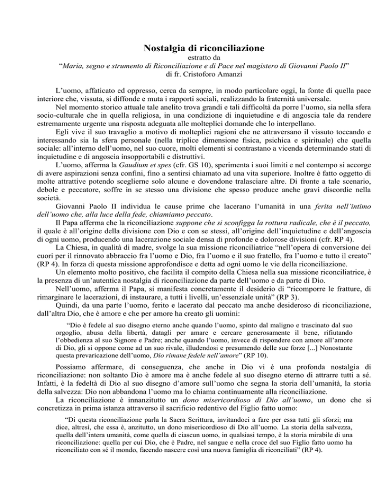 Nostalgia di riconciliazione estratto da “Maria, segno e strumento di Riconciliazione e di Pace nel magistero di Giovanni Paolo II” di fr. Cristoforo Amanzi L’uomo, affaticato ed oppresso, cerca da sempre, in modo particolare oggi, la fonte di quella pace interiore che, vissuta, si diffonde e muta i rapporti sociali, realizzando la fraternità universale. Nel momento storico attuale tale anelito trova grandi e tali difficoltà da porre l’uomo, sia nella sfera socio-culturale che in quella religiosa, in una condizione di inquietudine e di angoscia tale da rendere estremamente urgente una risposta adeguata alle molteplici domande che lo interpellano. Egli vive il suo travaglio a motivo di molteplici ragioni che ne attraversano il vissuto toccando e interessando sia la sfera personale (nella triplice dimensione fisica, psichica e spirituale) che quella sociale: all’interno dell’uomo, nel suo cuore, molti elementi si contrastano a vicenda determinando stati di inquietudine e di angoscia insopportabili e distruttivi. L’uomo, afferma la Gaudium et spes (cfr. GS 10), sperimenta i suoi limiti e nel contempo si accorge di avere aspirazioni senza confini, fino a sentirsi chiamato ad una vita superiore. Inoltre è fatto oggetto di molte attrattive potendo sceglierne solo alcune e dovendone tralasciare altre. Di fronte a tale scenario, debole e peccatore, soffre in se stesso una divisione che spesso produce anche gravi discordie nella società. Giovanni Paolo II individua le cause prime che lacerano l’umanità in una ferita nell’intimo dell’uomo che, alla luce della fede, chiamiamo peccato. Il Papa afferma che la riconciliazione suppone che si sconfigga la rottura radicale, che è il peccato, il quale è all’origine della divisione con Dio e con se stessi, all’origine dell’inquietudine e dell’angoscia di ogni uomo, producendo una lacerazione sociale densa di profonde e dolorose divisioni (cfr. RP 4). La Chiesa, in qualità di madre, svolge la sua missione riconciliatrice “nell’opera di conversione dei cuori per il rinnovato abbraccio fra l’uomo e Dio, fra l’uomo e il suo fratello, fra l’uomo e tutto il creato” (RP 4). In forza di questa missione approfondisce e detta ad ogni uomo le vie della riconciliazione. Un elemento molto positivo, che facilita il compito della Chiesa nella sua missione riconciliatrice, è la presenza di un’autentica nostalgia di riconciliazione da parte dell’uomo e da parte di Dio. Nell’uomo, afferma il Papa, si manifesta concretamente il desiderio di “ricomporre le fratture, di rimarginare le lacerazioni, di instaurare, a tutti i livelli, un’essenziale unità” (RP 3). Quindi, da una parte l’uomo, ferito e lacerato dal peccato ma anche desideroso di riconciliazione, dall’altra Dio, che è amore e che per amore ha creato gli uomini: “Dio è fedele al suo disegno eterno anche quando l’uomo, spinto dal maligno e trascinato dal suo orgoglio, abusa della libertà, datagli per amare e cercare generosamente il bene, rifiutando l’obbedienza al suo Signore e Padre; anche quando l’uomo, invece di rispondere con amore all’amore di Dio, gli si oppone come ad un suo rivale, illudendosi e presumendo delle sue forze [...] Nonostante questa prevaricazione dell’uomo, Dio rimane fedele nell’amore” (RP 10). Possiamo affermare, di conseguenza, che anche in Dio vi è una profonda nostalgia di riconciliazione: non soltanto Dio è amore ma è anche fedele al suo disegno eterno di attrarre tutti a sé. Infatti, è la fedeltà di Dio al suo disegno d’amore sull’uomo che segna la storia dell’umanità, la storia della salvezza: Dio non abbandona l’uomo ma lo chiama continuamente alla riconciliazione. La riconciliazione è innanzitutto un dono misericordioso di Dio all’uomo, un dono che si concretizza in prima istanza attraverso il sacrificio redentivo del Figlio fatto uomo: “Di questa riconciliazione parla la Sacra Scrittura, invitandoci a fare per essa tutti gli sforzi; ma dice, altresì, che essa è, anzitutto, un dono misericordioso di Dio all’uomo. La storia della salvezza, quella dell’intera umanità, come quella di ciascun uomo, in qualsiasi tempo, è la storia mirabile di una riconciliazione: quella per cui Dio, che è Padre, nel sangue e nella croce del suo Figlio fatto uomo ha riconciliato con sé il mondo, facendo nascere così una nuova famiglia di riconciliati” (RP 4). Tutta la vita di Cristo è stata orientata alla volontà del Padre ma nella croce vediamo il culmine di tale adesione, la fiducia piena nel momento estremo dove, piegata la natura umana alla volontà divina, al dolore fisico si aggiungono, nella sfera degli affetti, le lacerazioni più profonde. Al rifiuto dell’uomo Gesù ha risposto vivendo e mostrando la giusta relazione con il Padre: l’abbandono filiale, fiducioso, alla Sua volontà. Così, Cristo, nuovo Adamo, ha realizzato il desiderio di riconciliazione del Padre, e dalla croce continua ad invitare tutti gli uomini, di tutti i tempi, a seguirlo: chi accetta l’appello a lasciarsi riconciliare con Dio “entra nell’economia della riconciliazione” e fa l’esperienza del Cristo nostra pace. In questa stessa economia svolge un ruolo importante lo Spirito Santo, che è Signore e dà la vita. Egli è il dono del Padre e del Figlio che attualizza nei cuori degli uomini la riconciliazione, perché sorgente di unità e di pace ed è Colui che vivifica la Chiesa perché diventi la Chiesa dei viventi, «segno e strumento dell’intima unione con Dio e dell’unità di tutto il genere umano» (LG 1). E’ proprio la Chiesa, vivificata dallo Spirito, che opera perché si realizzi la comunione con Dio e l’unità di tutti gli uomini. E ciò in Cristo il quale con il suo sacrificio è divenuto nostra Riconciliazione e nostra Pace (cf Ef 2,14-16): “Nelle mani e sulla bocca degli apostoli, suoi messaggeri, il Padre ha posto misericordiosamente un ministero di riconciliazione, che essi a
