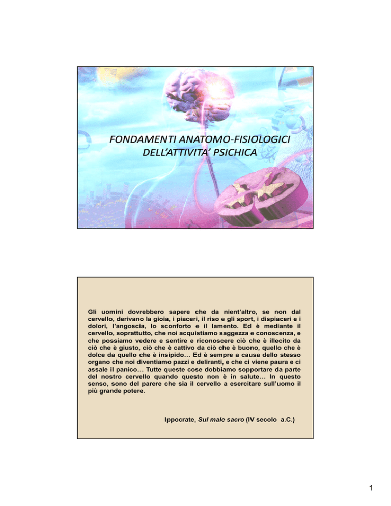 FONDAMENTI ANATOMO‐FISIOLOGICI DELL’ATTIVITA’ PSICHICA Gli uomini dovrebbero sapere che da nient’altro, se non dal cervello, derivano la gioia, i piaceri, il riso e gli sport, i dispiaceri e i dolori, l’angoscia, lo sconforto e il lamento. Ed è mediante il cervello, soprattutto, che noi acquistiamo saggezza e conoscenza, e che possiamo vedere e sentire e riconoscere ciò che è illecito da ciò che è giusto, ciò che è cattivo da ciò che è buono, quello che è dolce da quello che è insipido… Ed è sempre a causa dello stesso organo che noi diventiamo pazzi e deliranti, e che ci viene paura e ci assale il panico… Tutte queste cose dobbiamo sopportare da parte del nostro cervello quando questo non è in salute… In questo senso sono del parere che sia il cervello a esercitare sull senso, sull’uomo uomo il più grande potere. Ippocrate, Sul male sacro (IV secolo a.C.) 1 L’EVOLUZIONE DEL CERVELLO UMANO… ¾ Formazione del pianeta Terra: 5 miliardi di anni fa ¾ Comparsa della vita sulla Terra: 3,5 miliardi di anni fa ¾ Cervello dei Primati: 20 milioni di anni fa ¾ Cervello umano nella sua forma attuale: 100.000 anni Un po’ di storia sulle origini delle neuroscienze Testimonianza di un’operazione chirurgica preistorica eseguita sul cervello Questo cranio umano, risalente a più di 7000 anni fa, venne aperto chirurgicamente quando il soggetto era ancora vivo. Le frecce indicano i siti di trapanazione. Il cranio mostra segni di guarigione dopo l’operazione, ad indicare che la procedura veniva eseguita su soggetti vivi e non si trattava di un mero rituale dopo la morte. 2 Due pagine del “papiro chirurgico” di Edwin Smith, il primo testo scritto della storia in cui sia documentata la parola “cervello”, riportata in basso a destra (1700 a.C.) Il concetto di cervello nell’Antica Grecia Ippocrate (460-379 a.C., ritenuto il padre della medicina occidentale)) il cervello era la sede dell’intelligenza Aristotele ((384-322 a.C., filosofo g greco)) il cuore era il centro dell’intelletto 3 Il concetto di cervello durante l’impero romano Galeno (130-200 d.C.), importante figura all’interno della medicina romana, abbracciò la tesi di Ippocrate. pp Nei suoi studi sull’anatomia cerebrale di animali, egli osservò la presenza, all’interno del cervello, di ventricoli, ossia cavità piene di liquido. Secondo Galeno, le sensazioni venivano registrate ed i movimenti del corpo avviati a partire dallo spostamento degli umori da o verso i ventricoli del cervello attraverso i nervi, che si riteneva fossero tubi vuoti, al pari dei vasi sanguigni. Tale concezione del cervello permase fino al 1500 Due immagini del cervello umano in un disegno del Rinascimento, tratto dal De Humani corporis fabrica di Andrea Vesallio (1543), grande anatomista 4 Cartesio (1596(1596-1650) Fu un accanito sostenitore del dualismo, convinto che cervello e mente fossero costituiti da materia differente ed interagissero grazie alla ghiandola pineale che si trova alla base del cervello. Il cervello secondo Cartesio. Nervi cavi si prolungano dagli occhi verso i ventricoli del cervello. La mente influenza la risposta motoria esercitando un controllo sulla ghiandola pineale. Questa lavora come una valvola per dirigere i movimenti degli spiriti animali attraverso i nervi che gonfiano i muscoli… Durante il 17° e 18° secolo, molti scienziati si discostarono dalla visione di Galeno, Galeno che faceva convergere tutto sui ventricoli, iniziando a dare un’occhiata più da vicino al sistema nervoso. Entro la fine del 18° secolo, il sistema nervoso era stato dissezionato completamente e la sua anatomia macroscopica p descritta in dettaglio. 5 Due immagini settecentesche della superficie cerebrale. Si noti in entrambe le illustrazioni di un evidente pattern delle circonvoluzioni e dei solchi cerebrali. Il passo successivo… G l Galvani i (1737 (1737-1798): 1798) i nervii come fili elettrici l tt i i 6 Quesito: Le funzioni cerebrali scaturiscono dal funzionamento integrato di tutto il cervello, oppure dal funzionamento indipendente delle sue diverse parti? La teoria “frenologica” contro la teoria dei “campi associati” A sinistra: Franz Joseph Gall, uno degli studiosi che agli inizi del XIX secolo fondarono la frenologia. A destra: l’emisfero destro del cervello, tratto da Gall e Spurzheim, 1810. 7 Mappa frenologica risalente i l t agli li inizi i i i del d l XIX secolo IIntorno t all 1820, 1820 i frenologi, f l i capeggiati i ti dal d l neuroanatomico t i austriaco ti F Franz Joseph Gall, ebbero l’intuizione che le funzioni mentali dovessero avere una base biologica e, in particolare, che fossero opera del cervello. Gall affermò che il cervello era costituito da non meno di 35 aree distinte, a ciascuna delle quali attribuì una funzione mentale diversa. Secondo i frenologi, i diversi tratti comportamentali possono essere in relazione alle dimensioni delle differenti parti del cranio: tale “scienza” venne denominata personologia anatomica. Le mappe frenologiche secondo Gall e Spurzheim. Alcune delle funzioni localizzate: Tendenze e Sentimenti 2 Amore fisico 3 Amore parentale 6 Combattività 7 Segretezza 10 Cautela 12 Auto-stima 13 Benevolenza 14 Riverenza 15 Costanza 17 Speranza 19 Idealismo 20 Allegria 22 Individualismo Capacità percettive 23 Forma 24 Grandezza 26 Colore 17 Localizzazione 28 Ordine 29 Calcolo 31 Tempo 32 Senso musicale 33 Linguaggio Capacità di astrazione 34 Capacità di stabilire confronti 35 Capacità di stabilire relazioni di causa-effetto 8 A sinistra: analisi dei presidenti Washington,Jackson, Taylor e McKinley (1898). Al centro: mappa frenologica delle caratteristiche personali, rilevata a livello del cranio; tratta dall’ American Phrenological Journal, 1850. A destra: pubblicazione della Fowler & Wells Company riguardante la compatibilità per il matrimonio in base ai criteri frenologici (1888). A sinistra: Pierre Jean Marie Flourens (1794-1867), che p