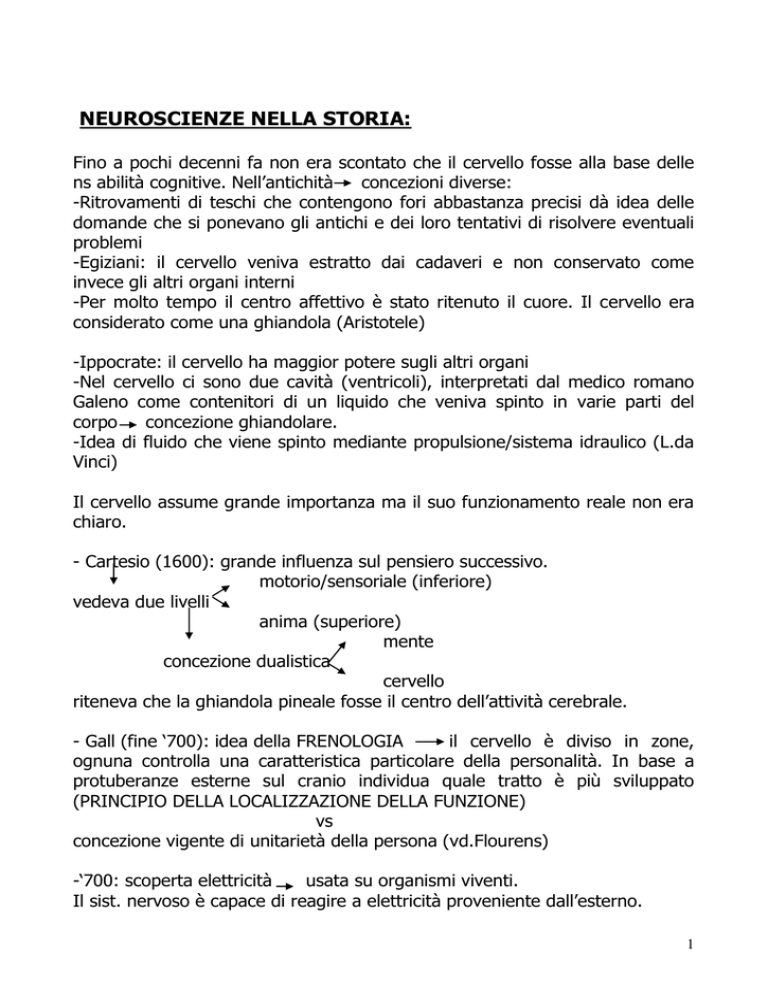 NEUROSCIENZE NELLA STORIA: Fino a pochi decenni fa non era scontato che il cervello fosse alla base delle ns abilità cognitive. Nell’antichità concezioni diverse: -Ritrovamenti di teschi che contengono fori abbastanza precisi dà idea delle domande che si ponevano gli antichi e dei loro tentativi di risolvere eventuali problemi -Egiziani: il cervello veniva estratto dai cadaveri e non conservato come invece gli altri organi interni -Per molto tempo il centro affettivo è stato ritenuto il cuore. Il cervello era considerato come una ghiandola (Aristotele) -Ippocrate: il cervello ha maggior potere sugli altri organi -Nel cervello ci sono due cavità (ventricoli), interpretati dal medico romano Galeno come contenitori di un liquido che veniva spinto in varie parti del corpo concezione ghiandolare. -Idea di fluido che viene spinto mediante propulsione/sistema idraulico (L.da Vinci) Il cervello assume grande importanza ma il suo funzionamento reale non era chiaro. - Cartesio (1600): grande influenza sul pensiero successivo. motorio/sensoriale (inferiore) vedeva due livelli anima (superiore) mente concezione dualistica cervello riteneva che la ghiandola pineale fosse il centro dell’attività cerebrale. - Gall (fine ‘700): idea della FRENOLOGIA il cervello è diviso in zone, ognuna controlla una caratteristica particolare della personalità. In base a protuberanze esterne sul cranio individua quale tratto è più sviluppato (PRINCIPIO DELLA LOCALIZZAZIONE DELLA FUNZIONE) vs concezione vigente di unitarietà della persona (vd.Flourens) -‘700: scoperta elettricità usata su organismi viventi. Il sist. nervoso è capace di reagire a elettricità proveniente dall’esterno. 1 Esperimenti di Galvani: DELL’ELETTRICITA’ IL SIST. NERVOSO SEGUE LE LEGGI - Jackson (1850): descrizione di episodi epilettici riguardanti il sist. motorio contrazione muscolare che può restare localizzata o estendersi in tutto il corpo. Se le funzioni fossero distribuite nel cervello, l’attacco avrebbe interessato tutto il corpo; invece procedeva x zone (epilessia jacksoniana) - Broca: studio su un paziente incapace di parlare le funzioni sono localizzate. Il paziente era incapace di produzione linguistica, non di comprensione. All’esame autoptico: danno nella parte frontale (area di Broca) - Wernicke: studia afasia x quanto riguarda comprensione del linguaggio lesione nel lobo temporale trovate due aree correlate al linguaggio che, una volta lese, presentano sindromi diverse, speculari. Esperimenti di stimolazione elettrica: a seconda della zona stimolata, all’esterno si hanno movimenti diversi. Progressi ottenuti grazie all’introduzione di nuove tecniche. - Brodmann (inizio ‘900): cervello suddiviso in aree diverse, numerate, sulla base di esame istologico. - VS Lashley: esperimenti su ratti con lesioni in diverse zone del cervello concluse che non c’erano effetti, o se c’erano dipendevano dalla grandezza e non dalla zona della lesione. Si sbagliava!!!!!! - Anni ’70: visione dell’interno del cervello quando l’uomo svolge attività motorie, quando è sottoposto a stimoli esterni, quando è impegnato in attività cognitive. Sistemi di neuroimmagine: il sangue si sposta verso l’area più attiva in un certo compito. Una funzione è suddivisa tra un numero finito di aree collegate tra loro a formare un circuito. A seconda della funzione un’area è più attiva di un’altra. No separazione netta tra funzioni dell’uomo e dell’animale. I comportamenti simili possono derivare da OMOLOGIA (parti simili) o da ANALOGIA (stessa tecnica, parti diverse) 2 EVOLUZIONE DEL CERVELLO: Il nostro cervello è il risultato di un’evoluzione durata millenni di varie classi di vertebrati. Diverse parti si sono evolute diversamente a seconda dell’uso. Uccelli/Mammiferi più sviluppati il telencefalo e il cervelletto (connessi ad abilità sensoriali/motorie) Il cervello ha dimensioni diverse a seconda della specie. Uomo: sempre considerato in cima alla scala evolutiva. Oggi si preferisce parlare di “albero”evolutivo. Ci si chiedeva se le abilità cognitive umane fossero legate al fatto che il cervello umano è il più grosso NO Si tentò di rapportare il peso del cervello al peso corporeo a parità di peso corporeo, a seconda della classe di vertebrati presa in considerazione, il peso del cervello è diverso. L’uomo ha l’indice di cefalizzazione (quindi evoluzione cerebrale) maggiore. Animali a sangue caldo: omeotermia (capacità di mantenere la temperatura corporea) il cervello può lavorare al meglio in ogni condizione di temperatura funzioni cerebrali più elevate Correlazione tra STRUTTURE e DIMENSIONE del cervello. LO STUDIO NEUROSCIENTIFICO: Si è notevolmente differenziato negli ultimi 20/30 anni. 4 tipi di specializzazione: - NEUROLOGO: diagnosticare/curare malattie del sist. nervoso - PSICHIATRA: diagnosticare patologie più complesse (disturbi dell’umore e della personalità) - NEUROCHIRURGO: intervenire su cervello/midollo spinale in caso di tumore, aneurisma… - NEUROPATOLOGO: vedere cambiamenti di tessuto connessi a una determinata malattia 3 ELETTRICITA’: Tappa fondamentale x la fisiologia: scoperta di ELETTRICITA’ ANIMALE. Le tecniche di misurazione di elettricità xmettono di misurare attività del sist. nervoso. Si può usare elettricità sui sistemi biologici. Galvani exp: gambe di rana separate dal corpo, con ancora attaccato nervo sciatico (coinvolto in contrazione muscoli x movimento della gamba). E’ possibile applicare elettrodi x stimolare il nervo e far contrarre la zampa. Ma dopo aver appoggiato un troncone sezionato di nervo sciatico al tronco sano dell’altro e viceversa, le 2 zampe si contraggono senza applicazione di elettricità dall’esterno. Tra la parte sezionata e quella sana, all’interno del nervo si genera una differenza di potenziale. Proprietà di ECCITABILITA’ ELETTRICA possedute dal sist. nervoso, endocrino e muscolare. Nervi: fibre nervose che 
