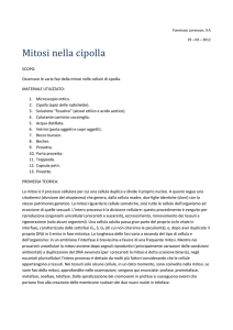 SPERIMENTIAMO:LA MITOSI Il 3 Marzo 2016,noi ragazzi della 3^I,abbiamo compiuto un esperimento per guardare al microscopio,alcune fasi della mitosi. Per eseguirlo ci siamo serviti di alcuni elementi: • CIPOLLA CON RADICI • CONTENITORE • ACQUA DISTILLATA • ACIDO CLORIDRICO AL 10/ • COLORANTE BLU DI METILENE • PINZETTE,FORBI,CARTA ASSORBENTE, BECKER,CONTAGOCCE ,VETRINI PORTAOGGETTI E COPRIOGGETTI. 1.Abbiamo messo la cipolla in un contenitore con l’acqua al buio per una settimana. 2.Dopo una settimana abbiamo tagliato gli apici, a circa 3mm dall’estremità. 5.Li abbiamo presi con le pinzette e sciacquati nell acqua distillata. 4.Abbiamo messo gli apici per 10 minuti nell’acido cloridrico. 6.In seguito,abbiamo messo gli 7.Abbiamo schiacciato tra i apici sul vetrino e con il contagoccie li abbiamo colorati con il blu di metilene. due vetrini gli apici,formando una poltiglia. 8.Abbiamo regolato il microscopio a 200 gradi e abbiamo visto alcune fasi della mitosi,in particolare la TELOFASE.