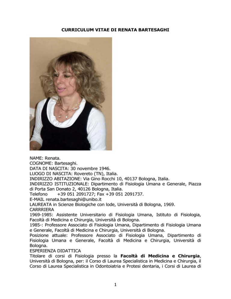 CURRICULUM VITAE DI RENATA BARTESAGHI NAME: Renata. COGNOME: Bartesaghi. DATA DI NASCITA: 30 novembre 1946. LUOGO DI NASCITA: Rovereto (TN), Italia. INDIRIZZO ABITAZIONE: Via Gino Rocchi 10, 40137 Bologna, Italia. INDIRIZZO ISTITUZIONALE: Dipartimento di Fisiologia Umana e Generale, Piazza di Porta San Donato 2, 40126 Bologna, Italia. Telefono +39 051 2091727; Fax +39 051 2091737. E-MAIL [email protected] LAUREATA in Scienze Biologiche con lode, Università di Bologna, 1969. CARRRIERA 1969-1985: Assistente Universitario di Fisiologia Umana, Istituto di Fisiologia, Facoltà di Medicina e Chirurgia, Università di Bologna. 1985-: Professore Associato di Fisiologia Umana, Dipartimento di Fisiologia Umana e Generale, Facoltà di Medicina e Chirurgia, Università di Bologna. Posizione attuale: Professore Associato di Fisiologia Umana, Dipartimento di Fisiologia Umana e Generale, Facoltà di Medicina e Chirurgia, Università di Bologna. ESPERIENZA DIDATTICA Titolare di corsi di Fisiologia presso la Facoltà di Medicina e Chirurgia, Università di Bologna, per: il Corso di Laurea Specialistica in Medicina e Chirurgia, il Corso di Laurea Specialistica in Odontoiatria e Protesi dentaria, i Corsi di Laurea di 1 Primo Livello in Ostetricia, Tecnico di Laboratorio Biomedico, Igiene Dentale, la Scuola di Specializzazione in Chirurgia Vascolare e la Scuola di Specializzazione in Malattie dell’Apparato Respiratorio. Titolare del Corso di Fisiologia Umana presso la Facoltà di Scienze Matematiche, Fisiche e Naturali, Università di Bologna, per il Corso di Laurea in Biotecnologie. Titolare di Corsi di Fisiologia presso la Facoltà di Psicologia, Università di Bologna, per il Corso di Laurea in Psicologia. Membro del Collegio dei Docenti del Dottorato in Neuroscienze, Università di L’Aquila e del Collegio dei Docenti del Dottorato in Scienze Biomediche, della Scuola di Dottorato in Scienze Mediche e Chirurgiche dell’Università di Bologna. POSIZIONI ACCADEMICHE E' stata componente della Commissione Affari Ordinari della Facoltà di Medicina e Chirurgia negli anni accademici 1988-95. Nel periodo 2001 2004 è stata responsabile di Facoltà per la valutazione della didattica. Nel periodo 1998-2004 è stata componente della Giunta di Dipartimento del Dipartimento di Fisiologia Umana e Generale. Nel periodo 2000-07 è stata Coordinatore di Semestre nel Corso di Laurea in Medicina e Chirurgia e nel periodo 2005-2007 ha fatto parte della Giunta dei Coordinatori di Semestre del Corso di Laurea in Medicina e Chirurgia. Nel periodo 2000-2002 è stata componente della Commissione Didattica della Facoltà di Medicina e Chirurgia. Nel periodo 2002-2004 è stata componente e segretario della Commissione Didattica della Facoltà di Medicina e Chirurgia. E’ stata rieletta componente della Commissione Didattica della Facoltà di Medicina e Chirurgia per il triennio 2008-2011. E' componente del Consiglio di Presidenza della Facoltà di Medicina e Chirurgia per il triennio 2010-2013. E’ vicedirettore del Dipartimento di Fisiologia Umana e Generale per il triennio 2009-2012. TEMATICHE DI RICERCA E' autore di articoli pubblicati su importanti riviste internazionali di cui funge anche da revisore. E' responsabile del gruppo di ricerca "Neurofisiologia e Neurobiologia" presso il Dipartimento di Fisiologia Umana e Generale. L’attività di ricerca del laboratorio è indirizzata principalmente ad argomenti di neurofisiologia integrativa e neurobiologia. Una prima linea di ricerca ha lo scopo di ottenere informazioni sul modello di elaborazione del segnale lungo le reti neurali ippocampali, con particolare riferimento al loop corteccia entorinale-ippocampo-corteccia entorinale, un circuito critico per le funzioni di memoria e apprendimento ippocampo-dipendenti. La ricerca, condotta nella cavia (Cavia porcellus), si avvale di tecniche elettrofisiologiche con registrazioni multiple e simultanee di campi di potenziale e attività unitaria dalle diverse strutture ippocampali e paraippocampali e analisi della funzione sinaptica (funzione input-output, current source density analysis, plasticità sinaptica a breve e a lungo termine). Vengono usati input di tipo diverso e/o con caratteristiche diverse per mettere in luce modelli diversi di trasferimento del segnale, possibilmente correlati a stati comportamentali diversi. Una seconda linea di ricerca è mirata ad accertare gli effetti a lungo termine dell’ambiente nel corso delle prime fasi della vita sulla organizzazione dei circuiti ippocampali implicati nella memoria a lungo termine. Gli effetti esercitati sui circuiti ippocampali dalle condizioni ambientali nelle prime fasi della vita sono analizzati con più approcci, che implicano l’impiego di tecniche elettrofisiologiche, di biologia cellulare e morfometriche. Questi approcci convergenti sono mirati ad accertare se 2 e in che misura l’ambiente alteri la funzione sinaptica delle reti ippocampali e ad identificare modificazioni plastiche (formazione di sinapsi, rimodellamento dendritico, neurogenesi) e meccanismi cellulari alla base di tali alterazioni. Una terza linea di ricerca è mirata ad identificare i meccanismi alla base dell’ipotrofia cerebrale nella sindrome di Down (DS), una malattia genetica caratterizzata da grave ritardo mentale. In un modello transgenico di DS (topo Ts65Dn) e in campioni di tessuto cerebrale provenienti da feti umani con DS stiamo studiando le alterazioni del processo di neurogenesi nell’ippocampo e nel cervelletto, due strutture fortemente ipotrofiche nei pazienti con DS, e nella zona subventricolare, una importante regione neurogenetica che durante la vita embrionale produce cellule neuronali e gliali destinate alla corteccia cerebrale. Nel modello murino stiamo cercando di dissecare i meccanismi molecolari alla base delle alterazioni della neurogenesi che caratterizzano il cervello Down. Nel tentativo di trovare terapie efficaci, potenzialmente utilizzabili dall’Uomo, ci st