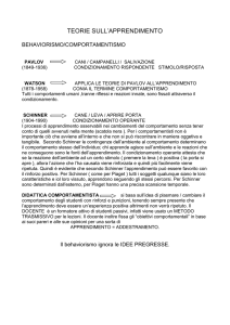 Ministero della Pubblica Istruzione UFFICIO SCOLASTICO REGIONALE PER LA CAMPANIA Direzione Generale Via Ponte della Maddalena 55 - 80142 Napoli Segreteria Direttore Generale - 0815576624 - 356 – Fax 0815576569 <[email protected]> POLO QUALITÀ DI NAPOLI - istituito con D.M. 230/00 Sito internet www.qualitascuola.com e-mail [email protected] TEORIE DELL'APPRENDIMENTO 1 La conoscenza della psicologia dello sviluppo aiuta il docente a comprendere i turbamenti dell'allievo, le sue azioni ed il suo comportamento. Gli psicologi, nel tratteggiare le fasi evolutive del bambino si avvalgono del principio della crescita fisica, della maturazione e dell'apprendimento. Per crescita fisica si intendono tutti quei mutamenti che interessano il corpo, sia nella forma che nella dimensione, mentre per maturazione si suole definire lo sviluppo degli istinti e di qualsiasi altro comportamento non appreso. Questi due aspetti biologici sono influenzati dall'ereditarietà e dall'ambiente.. Per quanto concerne il periodo dell'apprendimento, esso risulta connesso non solo al condizionamento, che in tal caso non è altro che una modifica del comportamento, ma anche dagli effetti dell'istruzione scolastica e dall'influsso della realtà circostante. La psicologia dello sviluppo si è orientata nelle seguenti scuole di pensiero : 1) Comportamentismo. 2) Psicodinamico. 3) Cognitivimo. 4) Umanistico. Il comportamentismo definisce l'apprendimento una modifica del comportamento che deriva dall'esperienza. Esse si basano sul condizionamento classico o rispondente di cui il massimo rappresentante è Pavlov, e sul condizionamento operativo o strumentale, definito anche skinneriano. L'assunto centrale del condizionamento rispondente o classico è che l'associazione appresa tra un segnale di debole intensità ed uno di forte intensità sia sufficiente allo stimolo più debole che può così evocare le stesse risposte in origine controllate dallo stimolo più forte. Ne deriva, pertanto, che uno stimolo che genera una risposta riflessa viene definito incondizionato prima di essere appreso. Uno stimolo ripetuto, immediatamente successivo allo stimolo appreso, che ha la capacità di evocare una risposta, diviene uno stimolo condizionato. Nel condizionamento operativo o strumentale, di cui il maggiore esponente è Skinner, l'apprendimento è descritto solo "in relazione al comportamento osservabile". Il comportamento, quindi, può essere modificato organizzando forme di condizionamento progressivo. In campo didattico Skinner ha esplicitato la sua teoria del condizionamento strumentale elaborando un modello di istruzione programmata, secondo il quale, occorre suddividere le discipline in brevi unità didattiche che rendono più immediata la risposta dell'allievo. Tali sequenze rappresentano per l'allievo degli stimoli positivi e gli consentono di "autovalutare" il proprio iter di apprendimento nel momento in cui il docente interviene per correggere a caldo l'errore. Ne consegue, quindi, che l'insegnante deve essere un erogatore di stimoli positivi che aiutano il discente a regolare il proprio processo di apprendimento. Tale teoria didattica, in realtà, è un procedimento individualizzato attraverso il quale l'allievo acquisisce le conoscenze e matura la sua personalità secondo un ritmo di apprendimento adeguato alle sue possibilità. Il cognitivismo fonda i suoi studi sui processi mentali contrapponendo agli stimoli ambientali dei comportamentisti l'attività umana. Lo psicologo cognitivista considera la persona un generatore di informazioni, un sistema dinamico di potenzialità perché ogni essere umano è unico e di conseguenza lo stimolo della sua personalità non è 2 sottoposta a leggi comuni. La teoria sullo sviluppo cognitivo di Piaget, che può essere considerato il precursore della psicologia cognitiva di cui Bruner e Vygotsky rappresentano i maggiori esponenti, si articola in una successione rigida di quattro stadi ognuno dei quali, però, presenta una certa discontinuità. Questi stadi sono presenti in ogni bambino anche se non si susseguono con lo stesso ritmo. Secondo Piaget l'intelligenza è frutto dei processi di assimilazione e accomodamento attraverso i quali il bambino comprende ed interpreta le esperienze rapportandole a ciò che conosce (assimilazione) e, nel contempo, le esperienze modificano le sue conoscenze (accomodamento). Per assimilazione, si definisce l'uso che il bambino fa dell'ambiente in relazione alle proprie strutture cognitive, mentre per accomodamento si intende la modifica delle strutture mentali del soggetto che conosce l'ambiente. Piaget definisce lo sviluppo cognitivo “una successione di modifiche nelle operazioni mentali e di perfezionamenti nelle strutture figurative, oltre che nella riorganizzazione periodica di tutto il sistema di strutture." Nell'ambito del processo evolutivo, come è stato accennato, lo psicologo ginevrino individua 4 stadi: 1) Stadio dell'intelligenza senso-motoria, da 0 a 2 anni che si divide in: a) fase delle reazioni circolari primarie in cui il bambino prova piacere nel ripetere le azioni che attirano la sua attenzione; b) fase delle reazioni circolari secondarie dove ha inizio la causalità nel senso che il bambino determina delle azioni che causano altre azioni; c) fase della coordinazione di schemi secondari in cui si sviluppa la consapevolezza della permanenza dell'oggetto; d) fase delle reazioni circolari terziarie nella quale il bambino osserva ed esplora gli oggetti secondo varie angolazioni e si nota un comportamento per tentativi ed errori, simile al ragionamento. 2) Stadio dell'intelligenza pre-operatoria da 2 a 7 anni in cui si individua una fase preconcettuale (2-4 anni) e una fase del pensiero intuitivo. In questo periodo il bambino raggiunge una notevole padronanza del linguaggio, che usa, però, in modo opportuno, conta solo l'aspetto delle cose ed esprime le proprie idee in modo simbolico. 3) Stadio delle operazioni concrete dai 7 agli 11 ann