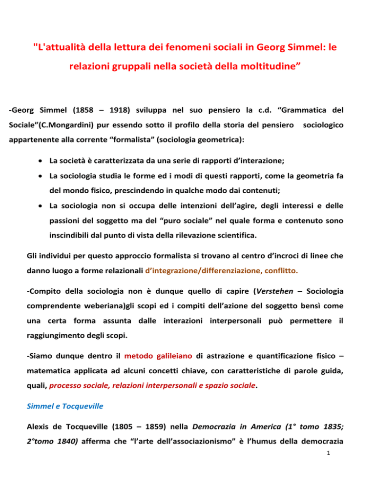 "L'attualità della lettura dei fenomeni sociali in Georg Simmel: le relazioni gruppali nella società della moltitudine” -Georg Simmel (1858 – 1918) sviluppa nel suo pensiero la c.d. “Grammatica del Sociale”(C.Mongardini) pur essendo sotto il profilo della storia del pensiero sociologico appartenente alla corrente “formalista” (sociologia geometrica): La società è caratterizzata da una serie di rapporti d’interazione; La sociologia studia le forme ed i modi di questi rapporti, come la geometria fa del mondo fisico, prescindendo in qualche modo dai contenuti; La sociologia non si occupa delle intenzioni dell’agire, degli interessi e delle passioni del soggetto ma del “puro sociale” nel quale forma e contenuto sono inscindibili dal punto di vista della rilevazione scientifica. Gli individui per questo approccio formalista si trovano al centro d’incroci di linee che danno luogo a forme relazionali d’integrazione/differenziazione, conflitto. -Compito della sociologia non è dunque quello di capire (Verstehen – Sociologia comprendente weberiana)gli scopi ed i compiti dell’azione del soggetto bensì come una certa forma assunta dalle interazioni interpersonali può permettere il raggiungimento degli scopi. -Siamo dunque dentro il metodo galileiano di astrazione e quantificazione fisico – matematica applicata ad alcuni concetti chiave, con caratteristiche di parole guida, quali, processo sociale, relazioni interpersonali e spazio sociale. Simmel e Tocqueville Alexis de Tocqueville (1805 – 1859) nella Democrazia in America (1° tomo 1835; 2°tomo 1840) afferma che “l’arte dell’associazionismo” è l’humus della democrazia 1 repubblicana e dunque si può fare un’equazione: democrazia politica=f (numero delle associazioni). -Il numero delle Associazioni connota una forza associativa che in Tocqueville è definita come Civicness. Possiamo dunque stabilire una sorta di parallelismo fra Simmel e Tocqueville nella lettura da parte dell’uno della società come una serie di forme interattive gruppali, da parte dell’altro come la democrazia repubblicana sia l’esito di un alto tasso di partecipazione civica ma al tempo stesso come la presenza di espressioni civiche legittimi la forza di rappresentanza delle istituzioni democratiche. Il tema di Simmel sulle interazioni gruppali offre una lettura interessante e moderna del rapporto individuo – società. Il soggetto non è vincolis solutus ma la sua vita sociale si esprime attraverso rapporti interpersonali. Questi rapporti possono assumere la forma di gruppi o cerchie sociali. Queste ultime rispetto ai primi sono caratterizate da elementi di maggiore volatività ed indeterminatezza ma hanno pur sempre una configurazione di carattere sociale che consente di poterle classificare. Oltre Simmel: Moltitudine e Capitale Sociale Per società della moltitudine intendiamo il contesto nel quale non vi sono più strutture della rappresentanza forti. La moltitudine costituisce quel nuovo bacino sociale privo di attori forti ma popolato da una molteplicità di soggetti tra loro molto diversi e dotati di propri linguaggi. Il punto è capire come si intercettano i sussurri della moltitudine cioè del passaggio dal chi rappresenta “chi” a chi rappresenta “per”(A.Bonomi). L’apparente contraddizione, come vedremo, è che paradossalmente la società del “secolo breve” ci ha consegnato un tessuto associativo molto ricco quantitativamente e molto eterogeneo come tipologia di attività. Se dovessimo 2 dunque adottare le categorie di lettura di Tocqueville e di Simmel, dovremmo avere un tasso di civicness particolarmente elevato. In altri termini la società della moltitudine è una società particolarmente fiorente di interazioni interpersonali e di gruppi formali oltre che informali. Tuttavia nella società della moltitudine l’individuo appare sempre più isolato, non rappresentato, alienato da relazioni virtuali ed a tempo. Gli studi di Robert. D. Putnam (1941) Il sociologo americano Robert Putnam riprende la parola chiave di Simmel interazione interpersonale (gruppale) per inserirla in un quadro epistemico più adeguato alle linee di sviluppo della società contemporanea. L’asse fondamentale di questa nuova cornice epistemica è quello costituito dalla parola chiave capitale sociale. Simmel nel suo pensiero configura una prodromica teoria delle reti. Putnam si pone il problema che nella società contemporanea non è sufficiente che l’individuo sia titolare di una certa quantità di appartenenza a gruppi ovvero a flussi relazionali ma l’analisi sociologica ci deve poter dire qualcosa anche sulla natura di queste relazioni, sulla loro tipizzazione. La relazione per Putnam o lascia il soggetto nel proprio perimetro (bonding) ovvero lo aiuta ad incontrare altri attori sociali (bridging) per creare relazioni di carattere fiduciario e cooperativo. Il limite della posizione di Putnam è che anch’egli in sostanza resta nell’orbita di Tocqueville, identificando il capitale sociale come una presenza civica determinata fondamentalmente dalla quantità di associazioni presenti in un dato contesto che, proprio perché numerose, hanno una probabilità elevata di elevare il tasso di fiducia e di cooperazione civica fra gli attori sociali. Gli studi di Putnam hanno alimentato il dibattito fra economisti, sociologi e politologi perché il concetto di capitale sociale, come humus della democrazia, diventa un indicatore 3 interessante a livello territoriale sullo stato di salute dei sottosistemi sociali coinvolti nell’analisi sociologica. Dal capitale associativo al capitale associazionale La domanda che ci poniamo è se il concetto di capitale sociale dal punto di vista ermeneutico ci dica qualcosa di nuovo rispetto alla dimensione civica (civicness) di Tocqueville, posizione teorica dalla quale siamo partiti per leggere la modernità di Simmel. Questa parola chiave può avere una valenza ermeneutica esplicativa 