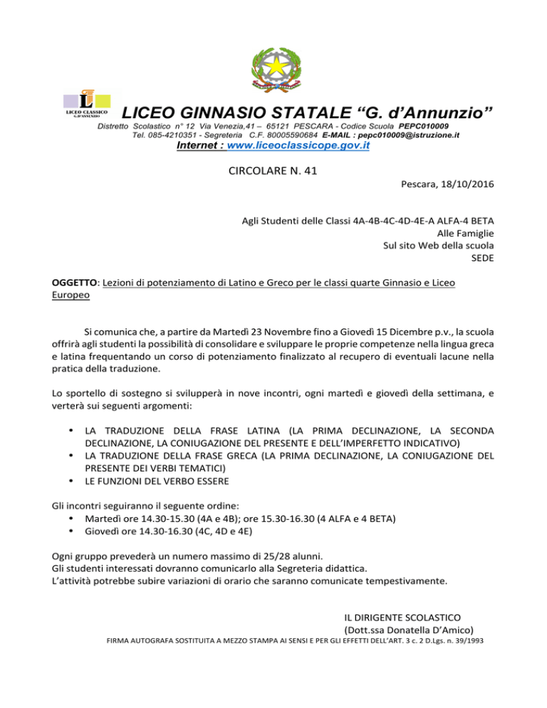 LICEO GINNASIO STATALE “G. d’Annunzio” Distretto Scolastico n° 12 Via Venezia,41 – 65121 PESCARA - Codice Scuola PEPC010009 Tel. 085-4210351 - Segreteria C.F. 80005590684 E-MAIL : [email protected] Internet : www.liceoclassicope.gov.it CIRCOLAREN.41 Pescara,18/10/2016 AgliStudentidelleClassi4A-4B-4C-4D-4E-AALFA-4BETA AlleFamiglie SulsitoWebdellascuola SEDE OGGETTO:LezionidipotenziamentodiLatinoeGrecoperleclassiquarteGinnasioeLiceo Europeo Sicomunicache,apartiredaMartedì23NovembrefinoaGiovedì15Dicembrep.v.,lascuola offriràaglistudentilapossibilitàdiconsolidareesvilupparelepropriecompetenzenellalinguagreca elatinafrequentandouncorsodipotenziamentofinalizzatoalrecuperodieventualilacunenella praticadellatraduzione. Lo sportello di sostegno si svilupperà in nove incontri, ogni martedì e giovedì della settimana, e verteràsuiseguentiargomenti: • LA TRADUZIONE DELLA FRASE LATINA (LA PRIMA DECLINAZIONE, LA SECONDA DECLINAZIONE,LACONIUGAZIONEDELPRESENTEEDELL’IMPERFETTOINDICATIVO) • LA TRADUZIONE DELLA FRASE GRECA (LA PRIMA DECLINAZIONE, LA CONIUGAZIONE DEL PRESENTEDEIVERBITEMATICI) • LEFUNZIONIDELVERBOESSERE Gliincontriseguirannoilseguenteordine: • Martedìore14.30-15.30(4Ae4B);ore15.30-16.30(4ALFAe4BETA) • Giovedìore14.30-16.30(4C,4De4E) Ognigruppoprevederàunnumeromassimodi25/28alunni. GlistudentiinteressatidovrannocomunicarloallaSegreteriadidattica. L’attivitàpotrebbesubirevariazionidiorariochesarannocomunicatetempestivamente. ILDIRIGENTESCOLASTICO (Dott.ssaDonatellaD’Amico) FIRMAAUTOGRAFASOSTITUITAAMEZZOSTAMPAAISENSIEPERGLIEFFETTIDELL’ART.3c.2D.Lgs.n.39/1993