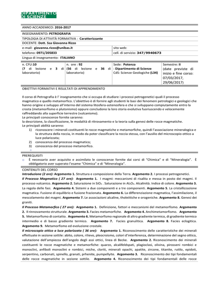 ANNO ACCADEMICO: 2016-2017 INSEGNAMENTO: PETROGRAFIA TIPOLOGIA DI ATTIVITÀ FORMATIVA : Caratterizzante DOCENTE: Dott. Ssa Giovanna Rizzo e-mail: [email protected] telefono: 0971/205833 Lingua di insegnamento: ITALIANO n. CFU:10 (7 di lezione laboratorio) e 3 sito web: cell. di servizio: 347/9940673 n. ore : 92 Sede: Potenza di (56 di lezione e 36 di : Dipartimento di Scienze laboratorio) CdS: Scienze Geologiche (L34) Semestre: II (date previste di inizio e fine corso: 07/03/2017, 29/06/2017) OBIETTIVI FORMATIVI E RISULTATI DI APPRENDIMENTO Il corso di Petrografia è l’ insegnamento che si occupa di studiare i processi petrogenetici quali il processo magmatico e quello metamorfico. L’obiettivo è di fornire agli studenti le basi dei fenomeni petrologici e geologici che hanno origine e sviluppo all’interno del sistema litosfera-astenosfera e che si sviluppano compiutamente entro la crosta (metamorfismo e plutonismo) oppure concludono la loro storia evolutiva fuoriuscendo e velocemente raffreddando alla superficie terrestre (vulcanismo). Le principali conoscenze fornite saranno: la descrizione, la classificazione, le modalità di ritrovamento e la teoria sulla genesi delle rocce magmatiche. Le principali abilità saranno: 1) riconoscere i minerali costituenti le rocce magmatiche e metamorfiche, quindi l’associazione mineralogica e la struttura della roccia, in modo da poter classificare la roccia stessa, con l’ausilio del microscopio ottico a luce polarizzata; 2) conoscenza del processo magmatico; 3) conoscenza del processo metamorfico. o PREREQUISITI o È necessario aver acquisito e assimilato le conoscenze fornite dai corsi di “Chimica” e di “Mineralogia”. È obbligatorio aver superato l’esame “Chimica” e di “Mineralogia”. CONTENUTI DEL CORSO Introduzione (2 ore): Argomento 1. Struttura e composizione della Terra. Argomento 2. I processi petrogenetici. Il Processo Magmatico ( 27 ore): Argomento 1. I magmi: meccanismi di risalita e messa in posto dei magmi. Il processo vulcanico. Argomento 2. Saturazione in SiO2 . Saturazione in Al2O3. Alcalinità. Indice di colore. Argomento 3. La regola delle fasi. Argomento 4. Sistemi a due componenti e a tre componenti. Argomento 5. La cristallizzazione magmatica. Fusione di equilibrio e fusione frazionata. Argomento 6. La differenziazione magmatica, l’assimilazione, il mescolamento dei magmi. Argomento 7. Le associazioni alcaline, tholeiitiche e orogeniche. Argomento 8. Genesi dei graniti. Il Processo Metamorfico ( 27 ore): Argomento 1. Definizione, fattori e meccanismi del metamorfismo. Argomento 2. Il rinnovamento strutturale. Argomento 3. Facies metamorfiche. Argomento 4. Anchimetamorfismo. Argomento 5. Metamorfismo di contatto. Argomento 6. Metamorfismo regionale di altro gradiente termico, di gradiente termico intermedio e di basso gradiente termico. Argomento 7. Facies granulitica. Argomento 8. Facies eclogitica. Argomento 9. Metamorfismo ed evoluzione crostale. Il microscopio ottico a luce polarizzata ( 36 ore): Argomento 1. Riconoscimento delle caratteristiche dei minerali effettuate in sezione sottile: abito, colore, rilievo, pleocroismo, colori d’interferenza, determinazione del segno ottico, valutazione dell’ampiezza dell’angolo degli assi ottici, linea di Becke. Argomento 2. Riconoscimento dei minerali costituenti le rocce magmatiche e metamorfiche: quarzo, alcalifeldspati, plagioclasi, olivina, pirosseni rombici e monoclini, anfiboli monoclini e rombici, miche, cloriti, minerali opachi, apatite, zircone, titanite, rutilo, epidoti, serpentino, carbonati, spinello, granati, prhenite, pumpellyite. Argomento 3. Riconoscimento dei tipi fondamentali delle rocce magmatiche in sezione sottile. Argomento 4. Riconoscimento dei tipi fondamentali delle rocce metamorfiche in sezione sottile. METODI DIDATTICI Il Corso è organizzato nel seguente modo: Lezioni in aula su tutti gli argomenti del corso (56 ore); Esercitazioni nel laboratorio di microscopia didattica (36 ore); Escursioni didattiche. MODALITÀ DI VERIFICA DELL’APPRENDIMENTO L’obiettivo della prova d’esame è verificare il livello di raggiungimento degli obiettivi formativi indicati sopra. L’esame è diviso in due parti: Una prova scritta nella quale lo studente dovrà redigere due relazioni su due campioni di roccia in sezione sottile, mediante il microscopio ottico, con l’obiettivo di classificare la roccia. Una prova orale nella quale verrà valutata la conoscenza e la capacità di collegare i diversi argomenti trattati durante il corso. Il voto finale è dato dalla somma dei due punteggi. Si procederà alla prova orale solo dopo il superamento della prova scritta. TESTI DI RIFERIMENTO E DI APPROFONDIMENTO, MATERIALE DIDATTICO ON-LINE Appunti forniti dal Docente al termine di ogni argomento trattato: Testi di riferimento D’Amico C., Innocenti F. & Sassi F.P. – Magmatismo e Metamorfismo – UTET, Torino, 1987. Morbidelli L. – Le rocce e i loro costituenti. BARDI EDITORE, 2003 Wilson B.M. – Igneous Petrogenesis. Chapman Hall, London, 1986. Deer W.A., Howie R.A., Zussman J. – Introduzione ai minerali che costituiscono le rocce. Zanichelli, 1994. Mackenzie W.S., Donaldson C.H., Guilford C. – Atlante delle rocce magmatiche e delle loro tessiture. Zanichelli Peccerillo A., Perugini D. – Introduzione alla Petrografia ottica. Morlacchi, 2003. Yardley B.W.D., Mackenzie W.S., Guilford C. - Atlante delle rocce metamorfiche e delle loro microstrutture. Zanichelli Zezza U. – Petrografia microscopica. La Goliardica Pavese,1996. METODI E MODALITÀ DI GESTIONE DEI RAPPORTI CON GLI STUDENTI Orario di ricevimento il lunedi dalle ore 17-18; martedi dalle ore 17-18; mercoledi dalle ore 17-19; giovedi dalle ore 16-18. Oltre all’orario di ricevimento settimanale, il Docente è disponibile per un contatto con gli studenti, mediante la propria mail. DATE DI ESAME PREVISTE1 26/07/2017; 27/09/2017; 25/10/2017; 29/11/2017; 12/12/2017 SEMINARI DI ESPER