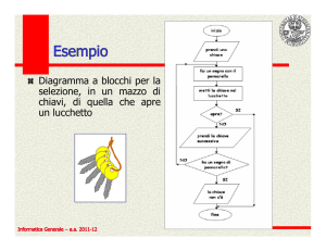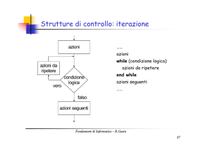 Esempio di algoritmo • Scrivere l’algoritmo che esegue la somma di due numeri start start read X read X read Y read Y Z := X + Y write Z Z := X + Y end write Z end Informatica di Base -- R.Gaeta 82 Esempio: massimo tra due numeri Dati due numeri, dire qual è il massimo tra i due. start start read X read X read Y read Y vero X>Y max := X if (X > Y) then max := X falso max := Y else max := Y write max end end if write max end Informatica di Base -- R.Gaeta 83 Esempio di algoritmo: calcolo radici start start read a,b,c read a,b,c delta := b*b-4*a*c if (delta < 0) then delta:=b*b-4*a*c vero write “nessuna radice” falso delta < 0 else r1 := (-b+sqrt(delta))/2*a r1 := (-b + sqrt(delta))/2*a write "nessuna radice" r2 := (-b-sqrt(delta))/2*a r2 := (-b - sqrt(delta))/2*a write r1,r2 write r1,r2 vero delta = 0 write "radici coincidenti" if (delta = 0) then write “radici coincidenti” falso else write "radici distinte" write “radici distinte” end if end if end end Informatica di Base -- R.Gaeta 84 Esercizio: massimo di una sequenza • Si supponga di fornire in input ad un programma un numero indefinito di interi positivi. L’inserimento verrà terminato dall’utente quando questi inserirà uno zero (0). Il programma deve restituire il valore massimo tra quelli introdotti. Disegnare il diagramma di flusso di tale programma. Informatica di Base -- R.Gaeta 85 Strutture di controllo: iterazione …… azioni azioni while (condizione logica) azioni da ripetere azioni da ripetere vero condizione logica end while azioni seguenti …… falso azioni seguenti Informatica di Base -- R.Gaeta 86 Strutture di controllo: iterazioni annidate azioni …… azioni while (condizione logica esterna) azioni iterazione interna da ripetere while (condizione logica interna) azioni iterazione interna da ripetere azioni iterazione esterna da ripetere vero end while condizione logica interna falso vero azioni iterazione esterna da ripetere end while azioni seguenti condizione logica esterna falso …… azioni seguenti Informatica di Base -- R.Gaeta 87