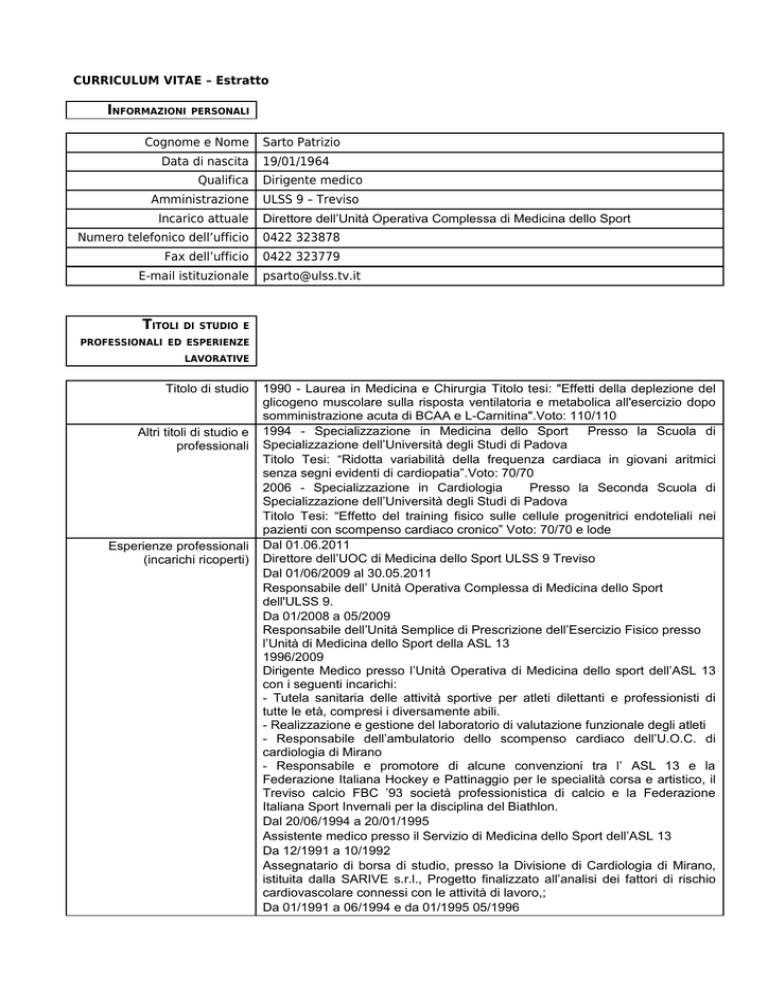CURRICULUM VITAE – Estratto INFORMAZIONI PERSONALI Cognome e Nome Data di nascita Sarto Patrizio 19/01/1964 Qualifica Dirigente medico Amministrazione ULSS 9 – Treviso Incarico attuale Direttore dell’Unità Operativa Complessa di Medicina dello Sport Numero telefonico dell’ufficio 0422 323878 Fax dell’ufficio 0422 323779 E-mail istituzionale TITOLI [email protected] DI STUDIO E PROFESSIONALI ED ESPERIENZE LAVORATIVE Titolo di studio Altri titoli di studio e professionali Esperienze professionali (incarichi ricoperti) 1990 - Laurea in Medicina e Chirurgia Titolo tesi: "Effetti della deplezione del glicogeno muscolare sulla risposta ventilatoria e metabolica all'esercizio dopo somministrazione acuta di BCAA e L-Carnitina".Voto: 110/110 1994 - Specializzazione in Medicina dello Sport Presso la Scuola di Specializzazione dell’Università degli Studi di Padova Titolo Tesi: “Ridotta variabilità della frequenza cardiaca in giovani aritmici senza segni evidenti di cardiopatia”.Voto: 70/70 2006 - Specializzazione in Cardiologia Presso la Seconda Scuola di Specializzazione dell’Università degli Studi di Padova Titolo Tesi: “Effetto del training fisico sulle cellule progenitrici endoteliali nei pazienti con scompenso cardiaco cronico” Voto: 70/70 e lode Dal 01.06.2011 Direttore dell’UOC di Medicina dello Sport ULSS 9 Treviso Dal 01/06/2009 al 30.05.2011 Responsabile dell’ Unità Operativa Complessa di Medicina dello Sport dell'ULSS 9. Da 01/2008 a 05/2009 Responsabile dell’Unità Semplice di Prescrizione dell’Esercizio Fisico presso l’Unità di Medicina dello Sport della ASL 13 1996/2009 Dirigente Medico presso l’Unità Operativa di Medicina dello sport dell’ASL 13 con i seguenti incarichi: - Tutela sanitaria delle attività sportive per atleti dilettanti e professionisti di tutte le età, compresi i diversamente abili. - Realizzazione e gestione del laboratorio di valutazione funzionale degli atleti - Responsabile dell’ambulatorio dello scompenso cardiaco dell’U.O.C. di cardiologia di Mirano - Responsabile e promotore di alcune convenzioni tra l’ ASL 13 e la Federazione Italiana Hockey e Pattinaggio per le specialità corsa e artistico, il Treviso calcio FBC ’93 società professionistica di calcio e la Federazione Italiana Sport Invernali per la disciplina del Biathlon. Dal 20/06/1994 a 20/01/1995 Assistente medico presso il Servizio di Medicina dello Sport dell’ASL 13 Da 12/1991 a 10/1992 Assegnatario di borsa di studio, presso la Divisione di Cardiologia di Mirano, istituita dalla SARIVE s.r.l., Progetto finalizzato all’analisi dei fattori di rischio cardiovascolare connessi con le attività di lavoro,; Da 01/1991 a 06/1994 e da 01/1995 05/1996 Capacità linguistiche Altro (partecipazione a convegni e seminari, pubblicazioni, collaborazione a riviste, ecc., ed ogni altra informazione che il dirigente ritiene di dover pubblicare Servizio come medico frequentatore, presso la Divisione di Cardiologia dell' U.O.C. di Mirano (VE), con rapporto di collaborazione quotidiana. Incarico: gestione clinica, diagnostica e riabilitativa del paziente affetto da cardiopatia ischemica; gestione clinica, diagnostica e riabilitativa del paziente affetto da scompenso cardiaco cronico. Presso il Servizio di Medicina dello Sport dell' U.S.S.L N°13;Incarico: tutela sanitaria delle attività sportive e valutazione funzionale dell'atleta. Dal 07/2010 Responsabile Sanitario della società professionistica di Calcio Padova S.p.a militante nel campionato di serie B. Dal 2001 a 02/2002 Medico federale della FISI. Incarico: gestione sanitaria della nazionale olimpica di Biathlon e medico federale ai Giochi Olimpici invernali di SALT LAKE CITY; 2002 Responsabile Sanitario del Programma Olimpico dell’atleta Antonella Bellutti (medaglia d’oro nella specialità Gara a Punti Pista Olimpiadi di Sidney). 1999/2009 Medico della società professionistica di calcio Treviso Foot-Ball ‘93 militante nel campionato di serie B. 1996/2003 Coordinatore Sanitario del settore corsa della Federazione Italiana Hockey e Pattinaggio. Incarico: Coordinatore medico delle squadre nazionali Juniores e Seniores per quanto riguarda raduni nazionali, meeting internazionali, campionati europei e mondiali; Responsabile Sanitario della Nazionale Italiana di Pattinaggio a Rotelle ai Campionati Mondiali negli anni 95-96-97 svoltisi rispettivamente a Perth (Australia), Padova, Mar Del Plata (Argentina). 1996 /2003 Medico sociale di varie società ciclistiche INGLESE Ha partecipato in qualità di Relatore o Formatore ad oltre 50 Congressi Nazionali e a Corsi di Formazione per Laureati in Scienze Motorie. Dal 16/12/2010 Responsabile del “Corso di Formazione per Laureati in Scienze Motorie per la Promozione dell’ Attività Fisica del Cardiopatico Cronico” Dal 15/04/2010 Responsabile del progetto aziendale “Il Malato Cronico in Palestra certificata” 2005 Ideatore del progetto: “UN APPROCCIO MULTIDISCIPLINARE PER LA PREVENZIONE DELLE MALATTIE CARDIOVASCOLARI” In tale progetto per la prima volta è stato creato un percorso “terapeutico sul territorio” reso possibile grazie alla collaborazione con alcune palestre dove opera personale adeguatamente formato alla somministrazione dell’esercizio fisico e addestrato anche alla rianimazione cardiopolmonare con l’uso del defibrillatore. Dal 2003 ad oggi Consulente per Techogym. 1994/1996 Responsabile, per la Divisione di Cardiologia di Mirano ULSS 13, dello studio Multicentrico ELVD SCOMPENSO: effetto del training fisico nei pazienti affetti da insufficienza cardiaca cronica. I risultati pubblicati nella rivista Circulation nel 2003, ed hanno dimostrato, per la prima volta che l’attività fisica proposta nei pazienti affetti da scompenso cardiaco cronico e disfunzione ventricolare sinistra non peggiorava il rimodellamento ventricolare sinistro. 1993/1999 Componente della Commissione Medica della Federazione Italiana Hockey e Pattinaggio Autoriz