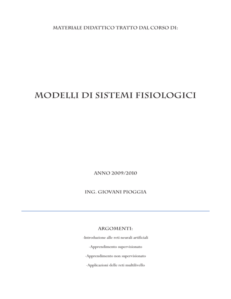 -Introduzione alle reti neurali artificiali -Apprendimento supervisionato -Apprendimento non supervisionato -Applicazioni delle reti multilivello RETI NEURALI ARTIFICIALI INTRODUZIONE Osservando la natura risultano evidenti le difficoltà che dobbiamo affrontare nel tentativo di imitarla. Inoltre le tecniche a nostra disposizione risultano inadeguate rispetto a ciò che la natura è in grado di fare. La possibilità di riconoscere un eventuale predatore è essenziale alla sopravvivenza della preda e deve avvenire in un tempo sufficientemente piccolo per rendere efficace la fuga. Se si tiene conto del ritmo biologico e dei tempi di elaborazione a disposizione, si vede che l’algoritmo naturale messo in gioco dal sistema nervoso raggiunge lo scopo del riconoscimento in poche decine di passi. D’altra parte, risulta altrettanto evidente che non è la capacità di elaborazione a nostra disposizione la ragione del nostro insuccesso. E’ sufficiente un semplice calcolo, anche se grossolano, per renderci conto di ciò. Infatti se consideriamo una valutazione comparativa fra la capacità di elaborazione in bit/sec del sistema nervoso centrale (SNC) di un animale di piccola taglia ed un odierno personal computer si ottiene la tabella 1. SNC PC Elementi di base 109 [neuroni] 107 [transistori] Ritmo di elaborazione 10 [operazioni/sec] 5109 [operazioni/sec] Numero medio di collegamenti 103 [sinapsi per neurone] 2 [per transistore] 4 [bit] 0.5 [bit] 41013 [bit/sec] 51015 [bit/sec] Informazione transitante per collegamento Capacità di elaborazione Tabella 1 – Valutazione comparativa delle capacità di calcolo fra il SNC di un animale di piccola taglia ed un odierno personal computer 1 Quindi apparentemente la capacità di elaborazione che abbiamo a disposizione, considerando un normale PC, è maggiore di quella biologica; evidentemente non è questa la caratteristica del SNC che dobbiamo imitare. Dal punto di vista dell'imitazione fisica (hardware) è stato sperimentato, in alcuni casi particolari quali la retina e la coclea artificiali, l'impiego di meccanismi vicini a quelli biologici a costo energetico basso o addirittura nullo. E' interessante, tuttavia, avere presenti i limiti fisici che le tecnologie impongono, soprattutto in termini di richiesta di energia e potenza ed in confronto al contesto biologico. Gli elementi da tenere presenti nei riguardi di quest'ultimo sono l'energia necessaria per il cambiamento di stato di un neurone, che è dell'ordine di 10-16 Joule e la potenza richiesta mediamente dal cervello umano per effettuare un numero di operazioni stimato nell'ordine di 1016 op./sec è quindi dell'ordine di 1 Watt; intendendo per operazione il semplice cambiamento di stato. Queste cifre vanno confrontate con la richiesta di energia di un microprocessore attuale per effettuare un'operazione aritmetica (cambio di stato di circa 104 transistori) valutata in 10-8 Joule. Quindi la potenza richiesta nel caso più sfavorevole per implementare la capacità di elaborazione del cervello umano (1016 op./sec) ammonterebbe a 100 MWatt. Ciò è ottenibile sia con la tecnologia elettronica in via di sviluppo fino al limite fisico prevedibile sia con la tecnologia elettronica detta "neuromorfica" orientata allo sfruttamento di meccanismi fisici a basso o nullo consumo energetico. Quest'ultima potrebbe permettere al limite fisico un consumo di potenza di 10 MWatt. Da queste considerazioni nasce subito una domanda: cosa bisogna propriamente imitare? A questo proposito svolge un ruolo determinante la sensibilità e quindi la specializzazione di chi imita, per la scelta dell'aspetto da privilegiare tra i molti presenti quali: x il funzionamento parallelo di molte semplici e simili unità x il comportamento non lineare degli elementi di base x la distribuzione della memoria sulle connessioni x la plasticità x l'adattamento 2 L'aspetto, tuttavia, che caratterizza nettamente il sistema nervoso è la capacità di acquisire esperienza da esempi. Questa è la caratteristica peculiare da imitare, tenendo conto dell'esistenza di due situazioni diverse nell'apprendimento: presenza o assenza di un supervisore. Tale fattore ha un'influenza determinante ed ha radici biologiche: in assenza di supervisione esplicita, esiste sempre un'azione di guida con obiettivi pratici importanti quali ad esempio la sopravvivenza. Dall'imitazione del sistema nervoso ne scaturiscono quindi algoritmi, usualmente implementati su calcolatori, noti come "reti neurali artificiali". Una rete neurale può essere definita come segue: "Rete di elementi semplici interconnessi in parallelo in larga misura e la cui organizzazione gerarchica è progettata in modo da interagire con gli oggetti del mondo reale in modo simile al sistema nervoso biologico". II campo tipico di applicazione delle reti neurali è quello dell'individuazione in sistemi complessi di legami ingresso-uscita, spesso nei casi in cui i dati a disposizione sono molto numerosi e per lo più contenenti poca informazione e di cui non si conosce la struttura ma solo esempi. L'esempio caratteristico è quello del riconoscimento. Per dare un'idea dei campi di utilizzazione si riporta successivamente un elenco non esaustivo di applicazioni note. E' importante tenere presente che una rete neurale non è certamente adatta a risolvere qualsiasi problema ed in molti casi è preferibile usare algoritmi già disponibili e che operano in modo soddisfacente. Applicazioni: x Sistemi intelligenti basati su ingressi da segnali di origine sensoriale (ad es. visiva, acustica, olfattiva, tattile): rivelazione, verifica e identificazione di caratteri e oggetti (codici a barre, caratteri stampati o scritti a mano, impronte digitali, firme, facce, difetti di prodotti, oggetti meccanici, minerali, etc.); riconoscimento di odori e composti (sistema olfattivo artificiale, lingua elettronica); movimento di oggetti e guida (sicurezza, automazione della fabbrica, sistemi di navigazione, robot mobili, lo