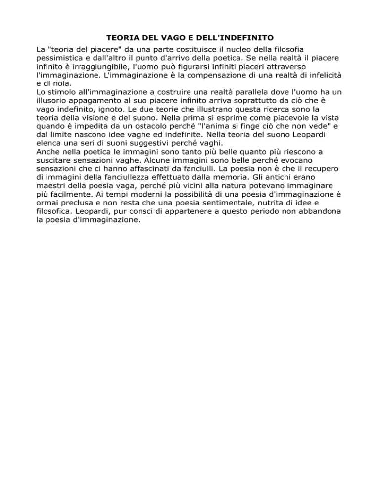 TEORIA DEL VAGO E DELL'INDEFINITO La "teoria del piacere" da una parte costituisce il nucleo della filosofia pessimistica e dall'altro il punto d'arrivo della poetica. Se nella realtà il piacere infinito è irraggiungibile, l'uomo può figurarsi infiniti piaceri attraverso l'immaginazione. L'immaginazione è la compensazione di una realtà di infelicità e di noia. Lo stimolo all'immaginazione a costruire una realtà parallela dove l'uomo ha un illusorio appagamento al suo piacere infinito arriva soprattutto da ciò che è vago indefinito, ignoto. Le due teorie che illustrano questa ricerca sono la teoria della visione e del suono. Nella prima si esprime come piacevole la vista quando è impedita da un ostacolo perché "l'anima si finge ciò che non vede" e dal limite nascono idee vaghe ed indefinite. Nella teoria del suono Leopardi elenca una seri di suoni suggestivi perché vaghi. Anche nella poetica le immagini sono tanto più belle quanto più riescono a suscitare sensazioni vaghe. Alcune immagini sono belle perché evocano sensazioni che ci hanno affascinati da fanciulli. La poesia non è che il recupero di immagini della fanciullezza effettuato dalla memoria. Gli antichi erano maestri della poesia vaga, perché più vicini alla natura potevano immaginare più facilmente. Ai tempi moderni la possibilità di una poesia d'immaginazione è ormai preclusa e non resta che una poesia sentimentale, nutrita di idee e filosofica. Leopardi, pur consci di appartenere a questo periodo non abbandona la poesia d'immaginazione.