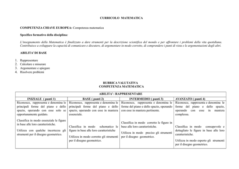 CURRICOLO MATEMATICA COMPETENZA CHIAVE EUROPEA: Competenza matematica Specifico formativo della disciplina: L’insegnamento della Matematica è finalizzato a dare strumenti per la descrizione scientifica del mondo e per affrontare i problemi della vita quotidiana. Contribuisce a sviluppare la capacità di comunicare e discutere, di argomentare in modo corretto, di comprendere i punti di vista e le argomentazioni degli altri. ABILITA’ DI BASE 1. 2. 3. 4. Rappresentare Calcolare e misurare Argomentare e spiegare Risolvere problemi RUBRICA VALUTATIVA COMPETENZA MATEMATICA ABILITA’ : RAPPRESENTARE INIZIALE ( punti 1) Riconosce, rappresenta e denomina le principali forme del piano e dello spazio, operando con esse solo se opportunamente guidato. Classifica in modo essenziale le figure in base alle loro caratteristiche. Utilizza con qualche incertezza gli strumenti per il disegno geometrico. BASE ( punti 2) Riconosce, rappresenta e denomina le principali forme del piano e dello spazio, operando con esse in maniera essenziale. Classifica in modo schematico le figure in base alle loro caratteristiche Utilizza in modo corretto gli strumenti per il disegno geometrico. INTERMEDIO ( punti 3) Riconosce, rappresenta e denomina le forme del piano e dello spazio, operando con esse in maniera pertinente. Classifica in modo corretto le figure in base alle loro caratteristiche. Utilizza in modo preciso gli strumenti per il disegno geometrico. AVANZATO ( punti 4) Riconosce, rappresenta e denomina le forme del piano e dello spazio, operando con esse in maniera complessa. Classifica in modo consapevole e dettagliato le figure in base alle loro caratteristiche. Utilizza in modo esperto gli strumenti per il disegno geometrico. ABILITA’: CALCOLARE E MISURARE INIZIALE ( punti 1) Legge e scrive, riconosce, confronta, rappresenta i numeri ed esegue algoritmi in modo essenziale, ma con qualche incertezza e talvolta necessita di guida. BASE ( punti 2) Legge e scrive, riconosce, confronta, rappresenta i numeri ed esegue algoritmi in modo sostanzialmente corretto. INTERMEDIO ( punti 3) Legge e scrive, riconosce, confronta, rappresenta i numeri ed esegue algoritmi con sicurezza e in modo generalmente accurato. AVANZATO ( punti 4) Legge e scrive, riconosce, confronta, rappresenta i numeri ed esegue algoritmi con metodo sicuro e in modo critico, accurato e in completa autonomia. ABILITA’: ARGOMENTARE E SPIEGARE INIZIALE ( punti 1) Opportunamente guidato, raccoglie e classifica dati, ricavando alcune semplici informazioni. Considera il punto di vista altrui. BASE ( punti 2) Effettua semplici indagini, raccoglie, classifica ed organizza dati, ricavando alcune informazioni. INTERMEDIO ( punti 3) Effettua indagini, raccoglie, classifica ed organizza dati, li interpreta, ricavando informazioni complete. AVANZATO ( punti 4) Effettua indagini, raccoglie, classifica ed organizza dati, li interpreta in modo critico, ricavando ed elaborando informazioni complete. Si confronta con il punto di vista altrui. Formula ipotesi e si confronta con il punto di vista altrui. Costruisce ragionamenti, formulando ipotesi, sostenendo le proprie idee e confrontandosi con il punto di vista altrui. ABILITA’ : RISOLVERE SITUAZIONI PROBLEMATICHE INIZIALE ( punti 1) BASE ( punti 2) INTERMEDIO ( punti 3) Opportunamente guidato individua il Legge e comprende semplici testi che Legge e comprende testi che percorso risolutivo di una semplice coinvolgono aspetti matematici. coinvolgono aspetti logici e matematici situazione problematica. mantenendo il controllo sia sul processo risolutivo, sia sui risultati. Individua percorsi risolutivi di una Individua percorsi risolutivi di un situazione problematica in modo problema in modo corretto ed in sostanzialmente corretto. autonomia. Legenda: AVANZATO ( punti 4) Legge e comprende testi complessi che coinvolgono aspetti logici e matematici mantenendo il controllo sia sul processo risolutivo, sia sui risultati. Individua più strategie risolutive di un problema in modo corretto ed in piena autonomia. Percentuale Punteggio Voto Fino al 49 % 6 Dal 50 % al 65 % 7 Dal 66% al 85 % 8 Dall’ 86% al 90 % 9 Dal 91% al 100 % 10 ABILITA’ DI BASE ORDINE DI SCUOLA infanzia scuola primaria RAPPRESENTARE ABILITA’: Conoscenze essenziali : Conoscenze ciò che l’alunno è in grado di fare ciò che l’alunno sa potenziate: 3 anni ▪ rappresentare esperienze vissute e situazioni con il corpo, con le parole e con termini topologici. simboli semplici, attribuendo loro un significato pertinente 4 anni ▪ rappresentare esperienze vissute e situazioni con il corpo, con le parole e con termini topologici. simboli semplici, attribuendo loro un significato pertinente e un ordine logico semplici simboli. (muoversi nello spazio scegliendo ed eseguendo i percorsi più idonei per semplici percorsi. raggiungere una meta anche sulla base di indicazioni verbali;utilizzare correttamente termini di pertinenza matematica e geometrica quali tanti/pochi/nessun/grande/piccolo…; disegnare oggetti e persone 5 anni ▪ rappresentare esperienze vissute e situazioni con il corpo, con le parole e termini topologici. consimboli semplici, attribuendo loro un significato pertinente; percorsi, traiettorie, i concetti relativi alle caratteristiche spaziali: sopra‐sotto, vicino‐lontano, davanti‐ simmetrie. dietro, alto-basso, grande‐piccolo, di lato; un percorso in base a determinate relazioni topologiche. indicazioni verbali Classe prima Relazioni topologiche in situazioni concrete rappresentare esperienze vissute e situazioni con il corpo, con le parole e consimboli semplici, attribuendo loro un significato pertinente (insiemi di oggetti con diagrammi di Venn; il codice numerico corrispondente alla quantità; i concetti relativi alle caratteristiche spaziali: sopra-sotto, vicino-ontano, davantidietro, alto basso, grande-piccolo, di lato; un percorso in base a determinate indicazioni verbali o a mappe; eventi temporali); utilizzare c