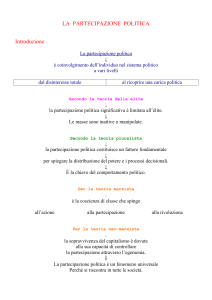 LA PARTECIPAZIONE POLITICA Introduzione La partecipazione politica ↓ è coinvolgimento dell’individuo nel sistema politico a vari livelli dal disinteresse totale al ricoprire una carica politica Secondo la teoria delle élite ↓ la partecipazione politica significativa è limitata all’élite. ↓ Le masse sono inattive o manipolate. Secondo la teoria pluralista ↓ la partecipazione politica costituisce un fattore fondamentale ↓ per spiegare la distribuzione del potere e i processi decisionali. ↓ È la chiave del comportamento politico. Per la teoria marxista ↓ è la coscienza di classe che spinge all’azione alla partecipazione alla rivoluzione Per la teoria neo-marxista ↓ la sopravvivenza del capitalismo è dovuta alla sua capacità di controllare la partecipazione attraverso l’egemonia. ⇓ La partecipazione politica è un fenomeno universale Perché si riscontra in tutte le società. La partecipazione politica è stata analizzata sotto tre aspetti: ↓ 1°) modo di partecipazione ↓ è l’aspetto formale o informale che essa assume; 2°) intensità della partecipazione ↓ è l’indice degli individui che partecipano a particolari attività politiche e con che frequenza lo fanno; 3°) qualità della partecipazione ↓ è il grado di efficacia conseguito dalla partecipazione ↓ cioè il suo impatto su coloro che detengono il potere sulla formulazione delle politiche ↓↓↓ Entrambi e tre gli aspetti variano a seconda delle opportunità e delle risorse. Forme di partecipazione In un libro pubblicato è stato divisa la popolazione nord-americana in tre gruppi i gladiatori gli spettatori gli apatici coloro che sono attivi in politica (5-7%) sono impegnati in politica a livello minimo (≈ 60%) si disinteressano di politica (≈ 33%) Un altro studio americano sulla partecipazione politica propone un quadro più complesso ↓ 1- coloro che sono totalmente passivi; 2- coloro che votano solamente; 3- i localisti, la cui unica attività politica è limitata ai problemi e alla politica locali; 4- i parrocchiali, il cui unico interesse è rivolto a ciò che li riguarda personalmente; 5- i contendenti, che si occupano di politica solo in relazione a problemi particolari ↓ sui quali si impegnano con campagne di vario tipo; 6- gli attivisti globali, coloro che sono coinvolti in tutte le questioni politiche. ⇓ Scopo di una scala gerarchica della partecipazione politica è quello di delineare ↓ differenti tipi di partecipazione di rilevare ↓ che più alto è il livello di attività ↓ minore il numero di coloro che partecipano ↓↓ Questo tipo di scala gerarchica è applicabile ↓ a tutti i tipi di sistema politico. ↓ Il significato e l’importanza di ciascun livello variano da un sistema politico all’altro. ⇓ GERARCHIA DELLA PARTECIPAZIONE POLITICA: 1°) RICOPRIRE UNA CARICA POLITICA O AMMINISTRATIVA Al vertice della scala gerarchica ↓ si collocano coloro che occupano vari tipi d’incarichi ↓ all’interno del sistema politico e amministrativo a vari livelli. ↓ Questi soggetti sono caratterizzati dall’esercizio di un potere politico formale ↓ che li distingue dagli altri che partecipano alla politica ↓ ma che non implica che altri individui o gruppi non esercitino di fatto potere o non abbiano influenza. ⇓ 2°) ASPIRARE AD UNA CARICA POLITICA O AMMINISTRATIVA Subito al di sotto di questi si collocano ↓ coloro che aspirano a ricoprire una carica politica o amministrativa. ⇓ 3°) PARTECIPAZIONE ATTIVA IN UN’ORGANIZZAZIONE POLITICA O SEMI-POLITICA Seguono poi i militanti di organizzazioni politiche o semi-politiche ↓ cioè partiti politici, gruppi di pressione o interesse ↓ che dal punto di vista politico possono essere definiti come agenti di mobilitazione ↓ attraverso cui gli individui possono partecipare ad alcune forme di attività politica. PARTITI E GRUPPI DI PRESSIONE Differenza fondamentale tra partiti gruppi di pressione sono organizzazioni che cercano di promuovere difendere un ampio campo di attività rappresentare interessi o posizioni limitate e/o specifiche I partiti e i gruppi di pressione godono di un sostegno che può essere specifico Diffuso cioè che deriva soltanto da pochi individui o gruppi sociali da un ampio e differenziato numero di individui o gruppi. ⇓ Gli obiettivi dei gruppi di pressione possono essere: ↓ a) introduzione, revoca o modifica di particolari leggi o norme; b) protezione degli interessi di determinati gruppi; c) promozione di ideologie, credenze, principi, idee particolari; d) abolizione della pena capitale (obiettivo particolarmente limitato). ⇓ Il grado in cui i gruppi sono coinvolti in attività politica ↓ varia considerevolmente da gruppi operanti completamente a gruppi che operano raramente all’interno della sfera politica ↓ esempio un gruppo contro il nucleare Automobile Club ⇓ Per organizzazione politica si intende ↓ i partiti e i gruppi di pressione ↓ la cui ragion d’essere è principalmente politica. Per organizzazione semi-politica si intende ↓ quei gruppi di pressione e altre organizzazioni ↓ le cui funzioni sono solo parzialmente od occasionalmente politiche. ⇓ 4°) PARTECIPAZIONE A RIUNIONI PUBBLICHE E DIMOSTRAZIONI Alcuni individui possono essere convinti a partecipare ↓ a qualche tipo di dimostrazione o incontro pubblico. Questa forma di partecipazione può essere spontanea organizzata da partiti politici gruppi di pressione come espressione della propria attività politica. Tali attività sono saltuarie non continuative sotto il profilo dell’impegno. Ciononostante in termini gerarchici ↓ si tratta di una forma di partecipazione più attiva ↓ rispetto all’adesione passiva ad una organizzazione politica o semi-politica ↓ anche se coinvolge meno individui. ⇓ 5°) PARTECIPAZIONE PASSIVA IN UN’ORGANIZZAZIONE POLITICA O SEMI-POLITICA La partecipazione ai partiti o ai gruppi di pressione ↓ può assumere una forma attiva o passiva ↓ il co
