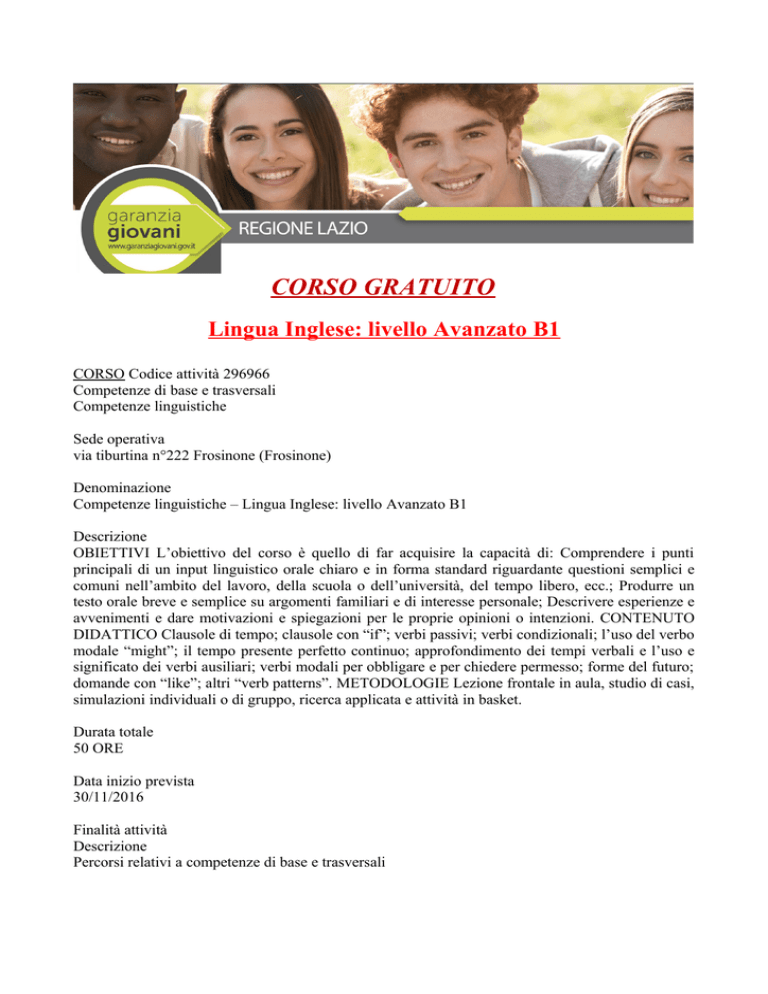 CORSO GRATUITO Lingua Inglese: livello Avanzato B1 CORSO Codice attività 296966 Competenze di base e trasversali Competenze linguistiche Sede operativa via tiburtina n°222 Frosinone (Frosinone) Denominazione Competenze linguistiche – Lingua Inglese: livello Avanzato B1 Descrizione OBIETTIVI L’obiettivo del corso è quello di far acquisire la capacità di: Comprendere i punti principali di un input linguistico orale chiaro e in forma standard riguardante questioni semplici e comuni nell’ambito del lavoro, della scuola o dell’università, del tempo libero, ecc.; Produrre un testo orale breve e semplice su argomenti familiari e di interesse personale; Descrivere esperienze e avvenimenti e dare motivazioni e spiegazioni per le proprie opinioni o intenzioni. CONTENUTO DIDATTICO Clausole di tempo; clausole con “if”; verbi passivi; verbi condizionali; l’uso del verbo modale “might”; il tempo presente perfetto continuo; approfondimento dei tempi verbali e l’uso e significato dei verbi ausiliari; verbi modali per obbligare e per chiedere permesso; forme del futuro; domande con “like”; altri “verb patterns”. METODOLOGIE Lezione frontale in aula, studio di casi, simulazioni individuali o di gruppo, ricerca applicata e attività in basket. Durata totale 50 ORE Data inizio prevista 30/11/2016 Finalità attività Descrizione Percorsi relativi a competenze di base e trasversali