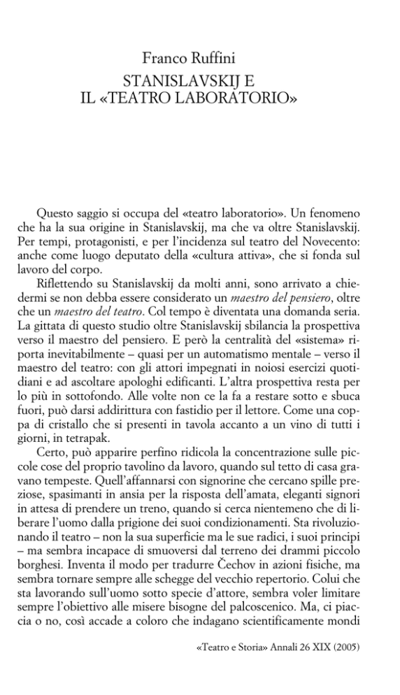 Franco Ruffini STANISLAVSKIJ E IL «TEATRO LABORATORIO» Questo saggio si occupa del «teatro laboratorio». Un fenomeno che ha la sua origine in Stanislavskij, ma che va oltre Stanislavskij. Per tempi, protagonisti, e per l’incidenza sul teatro del Novecento: anche come luogo deputato della «cultura attiva», che si fonda sul lavoro del corpo. Riflettendo su Stanislavskij da molti anni, sono arrivato a chiedermi se non debba essere considerato un maestro del pensiero, oltre che un maestro del teatro. Col tempo è diventata una domanda seria. La gittata di questo studio oltre Stanislavskij sbilancia la prospettiva verso il maestro del pensiero. E però la centralità del «sistema» riporta inevitabilmente – quasi per un automatismo mentale – verso il maestro del teatro: con gli attori impegnati in noiosi esercizi quotidiani e ad ascoltare apologhi edificanti. L’altra prospettiva resta per lo più in sottofondo. Alle volte non ce la fa a restare sotto e sbuca fuori, può darsi addirittura con fastidio per il lettore. Come una coppa di cristallo che si presenti in tavola accanto a un vino di tutti i giorni, in tetrapak. Certo, può apparire perfino ridicola la concentrazione sulle piccole cose del proprio tavolino da lavoro, quando sul tetto di casa gravano tempeste. Quell’affannarsi con signorine che cercano spille preziose, spasimanti in ansia per la risposta dell’amata, eleganti signori in attesa di prendere un treno, quando si cerca nientemeno che di liberare l’uomo dalla prigione dei suoi condizionamenti. Sta rivoluzionando il teatro – non la sua superficie ma le sue radici, i suoi principi – ma sembra incapace di smuoversi dal terreno dei drammi piccolo borghesi. Inventa il modo per tradurre Čechov in azioni fisiche, ma sembra tornare sempre alle schegge del vecchio repertorio. Colui che sta lavorando sull’uomo sotto specie d’attore, sembra voler limitare sempre l’obiettivo alle misere bisogne del palcoscenico. Ma, ci piaccia o no, così accade a coloro che indagano scientificamente mondi «Teatro e Storia» Annali 26 XIX (2005) 144 FRANCO RUFFINI nuovi nascosti sotto il mondo conosciuto. Hanno bisogno di esempi e cavie piccole e banali. Con l’animo preso dalla meraviglia e dall’orrore per vulcani e geyser, si chinano sui fornelli casalinghi a vigilare sull’acqua che si sta scaldando. Però nell’attesa – nella preparazione e nella precognizione – dell’istante in cui esploderà l’ebollizione. L’acqua in bollore è acqua molto calda: ma è un’altra cosa. 1. Estremisti e salto nello sguardo Teatro in stato di ebollizione può essere definito il teatro laboratorio. Non può fare a meno del teatro – e del lavoro per portarlo ad alta temperatura – ma è un’altra cosa. Del «teatro laboratorio», l’esordio con il nome proprio è stato l’American Laboratory Theatre, fondato a New York nel 1924 da Ričard Boleslavskij e Marija Uspenskaja, seguaci di Stanislavskij transfughi in America. La consacrazione è avvenuta con il Teatr Laboratorium di Jerzy Grotowski, inaugurato nel 1962 a Opole, in Polonia, e poi dal 1964 trasferito a WrocÍaw. L’eredità più conosciuta è il Nordisk Teaterlaboratorium di Eugenio Barba, che dal 1964 ha la sua sede a Holstebro, in Danimarca. Con nomi e protagonisti diversi, il teatro laboratorio ha traversato il teatro del Novecento, e vi è tuttora presente, come una delle realtà più significative. Anzi, come un’autentica realtà rivoluzionaria. Si è chiamato «atelier», «theatre workshop», o più genericamente «scuola». Più spesso, senza comparire in alcuna forma nel titolo, è stato presente nella tradizione implicita di tanti teatri. Il nome originario, però, è stato «studio», e il primo è stato il Primo Studio del Teatro d’Arte di Mosca, fondato da Stanislavskij nel 1912. Molti dei suoi allievi – Michail Čechov e Evgenij Vachtangov, tra i più famosi – fondarono a loro volta degli Studi 1. 1 Dall’American Laboratory Theatre è nato, nel 1931, il Group Theatre e, da quello, nel ’47, l’Actors’ Studio. Il Teatr Laboratorium ha chiuso definitivamente nel 1984, mentre il Nordisk Teaterlaboratorium è tuttora attivo. Atelier si è chiamato, per primo, quello di Charles Dullin, fondato a Parigi nel 1921. Vi hanno lavorato, tra gli altri, Antonin Artaud, Jean-Louis Barrault ed Etienne Decroux. Il Theatre Workshop più noto è quello di Joan Littlewood, attivo negli anni ’50 a Manchester. Tra le numerose Scuole, ricordiamo quella di Jacques Copeau, che iniziò la sua attività nel 1920-21. Tra i teatri laboratorio a prescindere dal nome, ricordiamo per tutti il Living Theatre di Judith Malina e Julian Beck, fondato a New York nel 1947. Quanto ai teatri laboratorio malgrado il nome diverso, scelto dopo Grotowski, ci si STANISLAVSKIJ E IL «TEATRO LABORATORIO» 145 Si discute sulla realtà storica e storiografica del teatro laboratorio. In particolare: se ci sia continuità tra la prima e la seconda metà del secolo; se debba essere considerato come uno spazio di ricerca affiancato a teatri più istituzionali; se, soprattutto dopo la consacrazione di Grotowski, il nome adottato debba essere visto come una discriminante; quali pratiche pedagogiche – si pensi in particolare al training – possano esserne ritenute costitutive 2. Problemi, tutti, di grande interesse, ma dei quali qui non ci occupiamo. Nelle pagine che seguono ci occuperemo dei teatri laboratorio – furono più d’uno – di Stanislavskij. Ma prima, seguendo Stanislavskij, della natura del teatro laboratorio in generale. Cos’è un teatro laboratorio, a prescindere da date, nome e modi di operare: è un «centro studi» per lo spettacolo, un teatro d’avanguardia, una scuola avanzata per la formazione degli attori? Artaud era notoriamente estraneo alla sperimentazione o all’avanguardia o alla pedagogia, e ancor più lo divenne negli ultimi anni. Durante il tempo della follia e del manicomio, degli elettroshock e