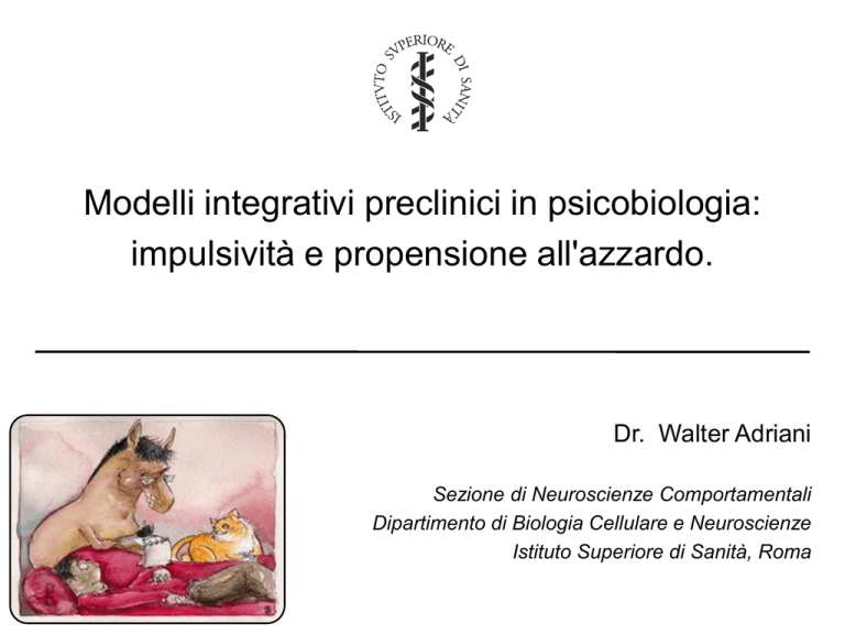 Modelli integrativi preclinici in psicobiologia: impulsività e propensione all'azzardo. Dr. Walter Adriani Sezione di Neuroscienze Comportamentali Dipartimento di Biologia Cellulare e Neuroscienze Istituto Superiore di Sanità, Roma Impulsività E’ un concetto che può essere definito in vari modi: Incapacità di saper aspettare o di inibire comportamenti inappropriati Tendenza ad agire senza prevedere le possibili conseguenze Insensibilità alle conseguenze avverse generate dal proprio agire Le due principali categorie d’impulsività sono: Impulsività motoria: incapacità di resistere a un forte impulso, a una pulsione o a una tentazione Impulsività cognitiva: scelta, fra opzioni, presa senza considerare alternative e/o conseguenze Il comportamento esageratamente impulsivo è un sintomo clinico significativo in una serie di patologie psichiatriche, caratterizzate da un controllo inibitorio inappropriato : Disturbo da deficit di attenzione / iperattività (ADHD) Disturbi ossessivo-compulsivi Abuso di sostanze (alcool, fumo, nuove droghe “smart”) Gioco d‟azzardo patologico Breve panoramica sulla patologia Disturbo da deficit dell’attenzione / iperattività (ADHD) E‟ il più comune tra i disturbi neuro-comportamentali in bambini e adolescenti La prevalenza stimata è del 4-7% negli USA e dell‟ 1-3% in Europa É circa 4 volte più frequente nei maschi che nelle femmine C‟è una elevata co-morbidità con altri disturbi neuropsichiatrici Nell‟80% dei bambini con ADHD, i sintomi permangono nell‟adolescenza; nel 30-50% di questi casi, essi persistono anche in età adulta. Bambini ADHD Adulti ed adolescenti ADHD Deficit dell‟attenzione Deficit dell‟attenzione Impulsività Impulsività Eccessiva attività motoria Propensione al rischio Rendimento scolastico basso Gioco d‟azzardo patologico Difficoltà di relazionarsi con i coetanei Abuso di alcool e droghe Bassa autostima dovuta a fallimenti ripetuti Personalità antisociale Breve panoramica sulla patologia Gioco d’azzardo patologico (GAP) Colpisce lo 0.2-5.3% degli adulti nella popolazione mondiale Inizia sempre più ad essere un problema anche tra gli adolescenti 3.5-8.0% degli adolescenti rientra nei criteri diagnostici del GAP C‟è co-morbidità con una serie di altri disturbi e con l‟abuso di sostanze Nel DSM-V: da “Disturbo del controllo degli impulsi, non classificato altrove” a “Disturbo correlato a sostanza” Il GAP come una “dipendenza senza sostanza”: tolleranza, crisi di astinenza, perdita di controllo sul comportamento Sintomi psicologici Sintomi fisiologici Impatto sulla società • Alterazione dell‟umore • Ansia correlata a sintomi fisici • Alterata autostima • Insonnia • Aumento della impulsività • Mal di testa • Problemi finanziari, sociali, e legali (inclusi: fallimento, divorzio, perdita del lavoro, galera) • Comportamenti superstiziosi • Infarti (dovuti a stress e a sovraeccitazione da gioco d‟azzardo) • Tentativi di suicidio • Abuso di sostanze Per misurare l‟impulsività Test e scale di personalità: Barratt Impulsiveness Scale (BIS) Eysenck Impulsiveness Scale (EIS) UPPS Impulsive Behaviour Scale Paradigmi comportamentali (in ambito clinico e sperimentale, inclusi modelli animali): Marshmallow Test (solo negli umani) Delay Discounting / Delay Intolerance Ritardo nella consegna della ricompensa Go/No-Go Task Stop-Signal Reaction Time (SSRT) Task Differential Reinforcement of Low Response Rate Task (DRL) Inibizione della risposta Per misurare la propensione all‟azzardo Test e scale di personalità : South Oaks Gambling Screen (SOGS) South Oaks Gambling Screen Revised for Adolescents (SOGS-RA) Gambling Attitudes and Beliefs Survey (GABS) Canadian Problem Gambling Index (CPGI) Paradigmi comportamentali (in ambito clinico e sperimentale, inclusi modelli animali): Iowa Gambling Task (IGT) Balloon Analogue Risk Task (BART) (solo negli umani) Probability Discounting Task (PDT) Aree cerebrali coinvolte nella impulsività e propensione all‟azzardo Corteccia pre-frontale Elaborazione e attuazione delle risposte comportamentali più evolute Inibizione attiva delle risposte sottocorticali Striato dorsale Apprendimento di nuove procedure e di strategie abitudinarie Formarsi e stabilirsi di “riti” e abitudini Comportamenti semi-automatici innati e/o acquisiti Striato ventrale (nucleus accumbens) Gratificazione correlata alla ricompensa Valutazione del valore della ricompensa Sostiene e motiva le pulsioni che portano al raggiungimento degli obiettivi Sistemi neurochimici di trasmissione Sistema Dopaminergico Sistema Serotoninergico Neurotrasmettitore: Dopamina, DA Neurotrasmettitore: Serotonina, 5-HT Origine: Ventral tegmentum; Substantia nigra Origine: Raphe nuclei (mesencefalo) Target: Nucleus accumbens; Striato dorsale Target: Corteccia pre-frontale Sistemi neurochimici di trasmissione Neurotrasmettitore: Dopaminae Neurotrasmettitore: Serotonina Il sistema della gratificazione nei disturbi di controllo degli impulsi Sistema di rinforzo e ricompensa Circuito costituito da neuroni dopaminergici che, dall‟ Area Tegmentale Ventrale (VTA), vanno ad innervare il Nucleus Accumbens e parte della Corteccia pre-frontale Questo importante sistema neurochimico è chiamato sistema meso-limbico e agisce in parallelo con quello meso-corticale Altro sistema, implicato nell‟apprendimento procedurale, è quello nigro-striatale Alterata percezione della ricompensa vs. alterata sensibilità al rinforzo Corteccia pre-frontale (mediale e orbitale) e area ventro-striatale (Nucleus Accumbens): regolano i processi motivazionali, di gratificazione e di “aspettativa” (valore attribuito a rinforzi futuri) I circuiti cortico-striatali dorso-mediale e dorso-laterale regolano le azioni semi-automatiche Entrambi i sistemi, dipendenti dall‟attività della dopamina, sono attivati dagli psicostimolanti Il sistema della ricompensa nell‟adolescenza Le proiezioni meso-limbiche e 