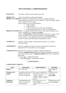 IL PREDICATO NOMINALE P. N. DOMANDE DI RIPASSO 1. Qual è il secondo «pilastro» della struttura della frase? 2. Che cosa intendiamo per «predicare»? IL PREDICATO NOMINALE Un nome, o un aggettivo, potrà «predicare»? • Mia madre una bellissima donna. • Quel ragazzo studioso. Il verbo ESSERE dà la funzione predicativa a nomi e aggettivi. • Mia madre è una bellissima donna. • Quel ragazzo è studioso. IL PREDICATO NOMINALE È È È È NUOVO Aggettivo UN RAGAZZO Nome QUELLO Pronome IN FORMA Locuzione COPULA= IL VERBO ESSERE CHE SVOLGE LA FUNZIONE DI UNIRE NOME DEL PREDICATO LA COPULA Naturalmente ricordiamo che il verbo essere può trovarsi coniugato in tutti i tempi! Massimiliano era felice. L’arbitro fu soddisfatto. Occhio ai tempi composti! Enrico VIII è stato un grande sovrano. Io sarei stato felice per lei, ma… ATTENZIONE! Il verbo essere può ingannarci quando fa da ausiliare ad un verbo composto: in quel caso non è copula, perché accompagna non un aggettivo, ma un participio. Il tram è passato. La ragazza era assistita dai soccorritori. Questi, come vedremo, sono predicati verbali! IL NOME DEL PREDICATO Si lega strettamente al soggetto della frase, perché esprime una sua qualità, una proprietà, un modo di essere. La regina è autoritaria. Elisabetta II è la regina Come si vede, la copula «essere» unisce, come un ponte, soggetto e nome del predicato. IL NOME DEL PREDICATO Se è un aggettivo, può essere comparativo, superlativo relativo assoluto. Alberto è più bravo di te. Alberto è il più Alberto è bravissimo. bravo al grado superlativo del corso. I VERBI COPULATIVI Questi verbi, al posto di «essere» svolgono la funzione di copula in una frase, esattamente come lui: Luigi sembra stanco. Luigi diventa direttore Luigi rimane immobile Luigi è stanco. Luigi è direttore. Luigi è immobile VERBI COPULATIVI Esprimono un modo di essere, o un processo: SEMBRARE, APPARIRE, PARERE (III p. «pare») DIVENTARE, DIVENIRE, RISULTARE RIMANERE, RESTARE IL COMPLEMENTO PREDICATIVO • Mauro è eletto presidente. • Matteo è considerato un genio. • Alessandro era chiamato «il Grande». • L’assemblea elegge Mauro presidente. • Gli amici considerano Matteo un genio. • I Greci chiamavano Alessandro «il Grande». Cosa succede da un gruppo di frasi all’altro? IL COMPLEMENTO PREDICATIVO • Verbi elettivi: eleggere, nominare, proclamare, incoronare, ecc. Carlo Magno è proclamato imperatore PREDICATIVO DEL SOGGETTO Il popolo proclama Carlo Magno imperatore PREDICATIVO DELL’OGGETTO IL COMPLEMENTO PREDICATIVO • Verbi appellativi: chiamare, dire, soprannominare, denominare, ecc. Emmanuele è chiamato «Manu» da tutti. PREDICATIVO DEL SOGGETTO Tutti chiamano Emmanuele «Manu». PREDICATIVO DELL’OGGETTO IL COMPLEMENTO PREDICATIVO • Verbi estimativi: considerare, reputare, giudicare, ecc… stimare, ritenere, Sono giudicato da tutti un bravo studente. PREDICATIVO DEL SOGGETTO Tutti mi giudicano un bravo studente. PREDICATIVO DELL’OGGETTO