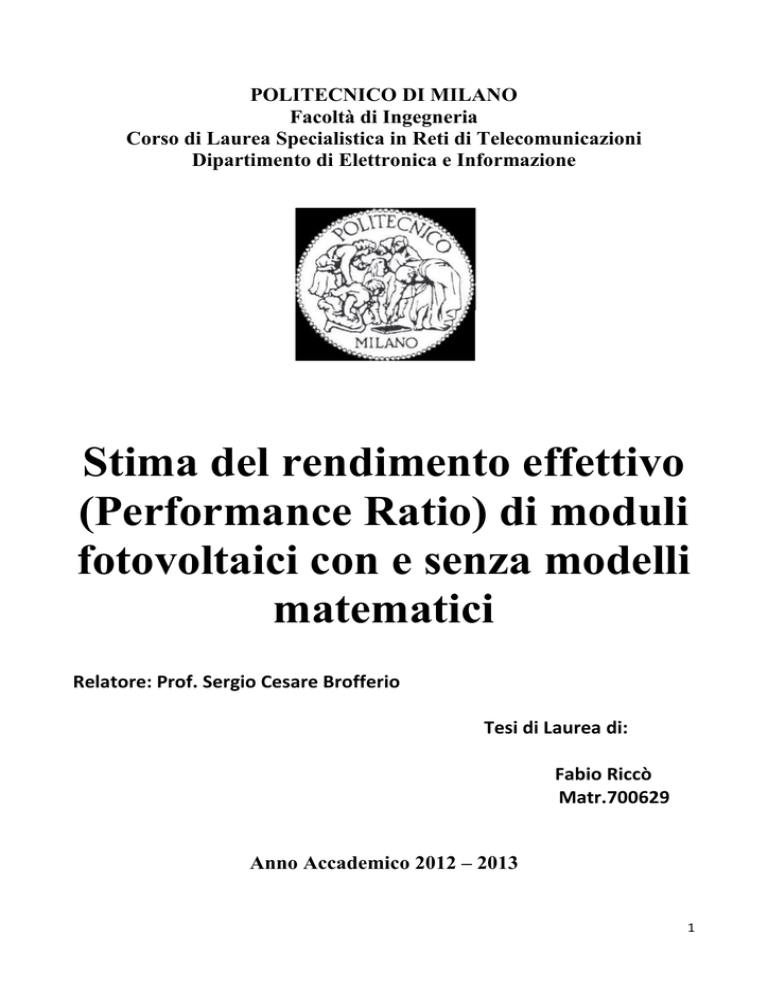 POLITECNICO DI MILANO Facoltà di Ingegneria Corso di Laurea Specialistica in Reti di Telecomunicazioni Dipartimento di Elettronica e Informazione Stima del rendimento effettivo (Performance Ratio) di moduli fotovoltaici con e senza modelli matematici Relatore: Prof. Sergio Cesare Brofferio Tesi di Laurea di: Fabio Riccò Matr.700629 Anno Accademico 2012 – 2013 1 Indice Introduzione. . . . . . . . . . . . . . . . . . . . . . . . . . . . . . . . . . . . . . . . . . . . . . . . . . . . . . . . . . . . . Capitolo 1 : Le Reti Neurali . . . . . . . . . . . . . . . . . . . . . . . . . . . . . . . . . . . . . . . . . . . . . . . . . 1.1 1.2 1.3 1.4 1.5 Teoria di base sulle reti neurali Le Reti Neurali Artificiali (ANN) Benefici e vantaggi Caratterisctiche Possibili architetture di rete Capitolo 2 : I pannelli fotovoltaici 2.1 La cella fotovoltaica 2.2 I moduli fotovoltaici 2.3 Costruzioni del modulo in silicio 2.4 Prestazioni del modulo 2.5 Tecnologie realizzative a confronto 2.6 Varianti proprietarie 2.7 Tolleranza 2.8 Certificazioni 2.9 Costi 2.10 Prodotti in commercio 2.11 Riciclaggio del pannello 2.12 Ricerca e innovazioni Capitolo 3 : Descrizione e svolgimento del progetto 3.1 Terminologia 3.2 Metodo LMSE (Least Mean Square Error) 3.3 Rete MLP (Multi-Layer Perceptron) 3.4 Risultati ottenuti 3.5 Conclusioni 2 Indice delle figure Capitolo1 1.1 Schema del neurone biologico 1.2 Confronto tra neurone e rete neurale 1.3 Schema di una Single Layer Feed Forward Network 1.4 Schema di una Multi Layer Feed Forward Network 1.5 Schema di una Recurrent Network Capitolo 2 2.1 Struttura della cella fotovoltaica 2.2 Circuito equivalente relativo all’equazione del diodo ideale 2.3 Funzionamento del modulo fotovoltaico 2.4 Struttura del pannello fotovoltaico 2.5 Modulo a film sottile Capitolo 3 3.1 Schema di funzionamento dell’algoritmo di addestramento 3.2 Funzionamento della tecnica di Back Propagation 3.3 Andamento dell’errore quadratico nella rete senza nodi nascosti (Gm,Tm) 3.4 Andamento dell’errore quadratico nella rete senza nodi nascosti (Gm,Tm,Gdh) 3.5 Andamento dell’errore quadratico nella rete senza nodi nascosti (Gm,Tm,R) 3.6 Andamento dell’errore quadratico nella rete con uno strato nascosto (Gm,Tm) 3.7 Andamento dell’errore quadratico nella rete con uno strato nascosto (Gm,Tm,Gdh) 3.8 Andamento dell’errore quadratico nella rete con uno strato nascosto (Gm,Tm.R) 3.9 Andamento dell’errore quadratico nella rete con due strati nascosti (Gm,Tm) 3.10 Andamento dell’errore quadratico nella rete con due strati nascosti (Gm,Tm,Gdh) 3.11 Andamento dell’errore quadratico nella rete con due strati nascosti (Gm,Tm,R) 3 Introduzione In questo progetto di tesi viene sviluppato lo studio dei metodi utilizzati per la stima di determinate grandezze fisiche o, nel nostro caso, del rendimento percentuale di un pannello fotovoltaico. Questo scritto inizia con due capitoli puramente teorici, nei quali vengono riportati concetti chiave riguardo le reti neurali, ovvero il metodo di stima più utilizzato durante tutto il lavoro, e riguardo la strumentazione utilizzata per la rilevazione dei dati ambientali ovvero i pannelli fotovoltaici. Il primo capitolo descrive brevemente il background storico delle reti neurali, dalle esigenze che hanno portato al loro sviluppo all’importanza che assumono oggi in diverse applicazioni scientifiche nelle quali è fondamentale calcolare con precisione alcuni dati ( ambientali, finanziari, di mercato). Sono anche descritte le tipologie di rete più utilizzate al giorno d’oggi e le loro caratteristiche più importanti. Nel secondo capitolo si parla della tecnologia che si nasconde dietro al concetto di modulo fotovoltaico. Si da una breve descrizione relativa alla creazione, al funzionamento e alle caratteristiche principali del modulo fotovoltaico. Si procede poi con il terzo capitolo che introduce un metodo di stima alternativo alle reti neurali, ovvero il metodo LMSE (Least Mean Square Error), la cui efficienza viene poi confrontata con quella della rete. Nello stesso capitolo vengono descritte le diverse topologie di rete sviluppate durante il lavoro, i loro vantaggi e svantaggi e i risultati grazie ad esse sono stati raggiunti. 4 Capitolo 1 1.1 Teoria di base sulle reti neurali Le reti neurali sono uno dei modelli più utilizzati per studiare la relazione fra variabili relative a un determinato problema; esse nascono dall’idea di poter riprodurre alcune delle funzioni e capacità del cervello umano. Quest’ultimo `e costituito da circa 100 miliardi di neuroni, ossia cellule cerebrali deputate all’elaborazione dell’informazione, dai dendriti, che collegano fra loro i neuroni ed un corpo centrale, chiamato assone, che propaga il segnale. I neuroni ricevono polarizzazioni, ossia cariche elettriche, attraverso i dendriti e in questo modo il neurone viene eccitato o inibito sino ad una soglia limite. Superata questa soglia il neurone ritrasmette la polarizzazione per mezzo dell’assone che si trova a contatto con i dendriti di altri neuroni in punti detti sinapsi. Risulta chiaro, quindi, che il patrimonio informativo del cervello umano è identificato dall’insieme dei valori di attivazione dei neuroni, la capacità di elaborazione delle informazioni sono rappresentate dal flusso di eccitazioni ed inibizioni fra i neuroni ed infine la memoria umana viene identificata dalle sinapsi. Fig 1.1: schema del neurone biologico Alcune proprietà delle cellule nervose vennero riprodotte nella prima metà del 1900 con modelli analogici, basati cioè sulla similitudine con sistemi di altra natura. Nel 1943 McCulloch e Pitts proposero un modello elettronico del neurone, che poi fu ripreso nel 1962 da Rosenblatt per creare una rete neurale in grado di riconoscere immagini, che prese il nome di perceptrone. Da allora vi fu un susseguirsi di studi su tali sistemi, fino all’attuale situazione di ricerca, che implica una grande interdisciplinarietà fra campi molto 