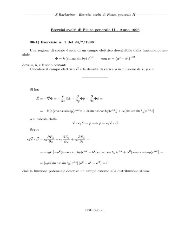 ———————— S.Barbarino - Esercizi svolti di Fisica generale II ———————— Esercizi svolti di Fisica generale II - Anno 1996 96-1) Esercizio n. 1 del 24/7/1996 Una regione di spazio é sede di un campo elettrico descrivibile dalla funzione potenziale: 1/2 Φ = k (sin ax sin by) eαz con α = a2 + b2 dove a, b, e k sono costanti. ~ e la densitá di carica ρ in funzione di x, y e z. Calcolare il campo elettrico E ——————— Si ha: ~ = −∇Φ ~ = − ∂ Φx̂ − ∂ Φŷ − ∂ Φẑ = E ∂x ∂y ∂z = −k [a(cos ax sin by)eαz x̂ + b(sin ax cos by)eαz ŷ + α(sin ax sin by)eαz ẑ] ρ si calcola dalla ~ · ǫ0 E ~ = ρ =⇒ ρ = ǫ0 ∇ ~ ·E ~ ∇ Segue ~ ·E ~ = ǫ0 ∂Ex + ǫ0 ∂Ey + ǫ0 ∂Ez = ǫ0 ∇ ∂x ∂y ∂z = −ǫ0 k −a2 (sin ax sin by)eαz − b2 (sin ax sin by)eαz + α2 (sin ax sin by)eαz = = [ǫ0 k(sin ax sin by)eαz ] (a2 + b2 − α2 ) = 0 cioè la funzione potenziale descrive un campo esterno alla distribuzione stessa. ESFIS96 - 1 ———————— S.Barbarino - Esercizi svolti di Fisica generale II ———————— 96-2) Esercizio n. 2 del 24/7/1996 Una sfera conduttrice di raggio a ha una carica Q distribuita uniformemente sulla sua superficie. Se la sfera é rivestita da uno strato sferico dielettrico, di costante dielettrica ǫr , di raggio interno a e raggio esterno b, calcolare la carica superficiale di polarizzazione sulla superficie interna e su quella esterna del dielettrico nonché la densitá volumica di carica di polarizzazione all’interno del dielettrico. ——————— ................................. . .............. ...... .............. ........ ...... ....... ...... .. ...... . . . . ...... .......... ... ... ... .... ..... ...... ...... .......... .......... .... . . . . . . . .... .. . .. . . ..... ..... ..... ... . . . . . . . . . . . . . . . . ... . ..... ... .. ... . . . . . . . . .. ..... .......... ...... ... .... ... ... ...... .... ............ . . . . . . . . . . . . .... ... ..... ..... ..... . ... ..... ... . ..... .. . ...... ..... . ..... . . . . . .... .......... .......... . . . .. ...... ....... ... . ... ... . .. . . . . ... .... ... ... ... ...... ... . . . . . . . . . . ... . .. .. ... ...... ...... ... ... ... ... ....... ... ........ ... ... . . . . . . . . . . . . . ... .. .... ........ ... ... ... ...... ...... .. .. ... .. ... .. ..... ... . ..... . ..... . . . ... ......... .. .. ....... ....... . . ..... . . . . . . . . . ...... ... ... ..... ..... ...... ...... .. .......... .... ............. ........ .... ............ ...... .. ............................................... ............... ........ ............ . . . ... ... ... a .... • ... . ... .. . .... b .... ....... .......................... Sia Q la carica libera distribuita uniformemente sulla superficie della sfera conduttrice. Calcoliamo il campo elettrico nello strato dielettrico applicando il teorema di Gauss: I ~ · n̂ da = Q =⇒ D4πr2 = Q D S ~ = E Q êr 4πǫr2 ǫ0 (ǫr − 1) P~ = Qêr 4πǫr2 Segue: ǫ0 (ǫr − 1) σP = P~ · (−êr ) = − Q 4πǫr2 Inoltre Q = −QP(r=b) ǫ − sulla sfera di raggio a, + su quella di raggio b. ~ dipendente Tenendo presente che in coordinate sferiche per una funzione vettoriale A solo dalla variabile r, si ha: ~ ·A ~ = 1 ∂ (r2 Ar ) ∇ r2 ∂r possiamo scrivere: 1 ∂ 2 ǫ0 (ǫr − 1) ~ ~ ̺P = −∇ · P = − 2 Q =0 r r ∂r 4πǫr2 QP(r=a) = −ǫ0 (ǫr − 1) ESFIS96 - 2 ———————— S.Barbarino - Esercizi svolti di Fisica generale II ———————— 96-3) Esercizio n. 3 del 24/7/1996 Una sfera di materiale magnetico, di permeabilitá magnetica relativa µr = 1000 e raggio a = 1 cm, é posta in un campo magnetico uniforme di modulo B0 = 1000 G; calcolare il momento magnetico indotto sulla sfera. ——————— .............. .. ..... ........................................... .... ... .... ... ...................... ..... ... . ... . ... . ..................... ..... ... . ... ... . .... . .... . .... ....................... .... .... ...... . ... ... .... . ................................................... .... ..... ...................... .... . ....... ... .... . . . ... . . . . ... . ..... . . . .... . . . . ..... ..... ...................... ..... .. . .. . ...... ...... ........................................ 0 ............... ... ~ B Sappiamo dalla teoria che: Bint. = 3µr B0 µr + 2 Segue M = χm Hint. = χm ma χm = µr − 1, quindi M= 3 H0 µr + 2 3(µr − 1) H0 µr + 2 Il momento magnetico indotto è: ~V m ~ =M m= 3(µr − 1) 4 3 B0 πa = 0.997A · m2 µr + 2 3 µ0 ESFIS96 - 3 ———————— S.Barbarino - Esercizi svolti di Fisica generale II ———————— 96-4) Esercizio n. 4 del 24/7/1996 Una calamita a forma di barra cilindrica, di lunghezza l = 5 cm e diametro d = 1 cm, é uniformemente magnetizzata nella direzione assiale e sia M = 103 A/m. Calcolare: a) il momento magnetico della barra; b) la densitá lineare della corrente superficiale di magnetizzazione; c) il modulo del vettore induzione magnetica al centro della calamita. ——————— .............................. ........... ...... ...... .... .... ... ..... . ........ ........ . . . . .. .......... ..................................... .... .. ... ... ... .. .. ... ..... . ... . . ... . ........ .. .... .. .. ... ... ... ... .. .. ... ... . ... .. ... .. ... . .. .... .... .... .... .... .... ..... .. .... ....... ... .. ... ... .... .... ....... ............... ...................... ....... ~ M Il momento magnetico della sbarra è: m = MV = Mπ d2 10−4 l = 103 π 5 · 10−2 = 3.93 · 10−3 A · m2 4 4 La densità della corrente superficiale di magnetizzazione è: ~ × n̂ ~jM = M il cui modulo è: |jM | = 103 A/m e la direzione è êφ . La barra è quindi equivalente ad un solenoide tale che In = jM Pertanto per il calcolo dell’induzione magnetica al centro della calamita basta 