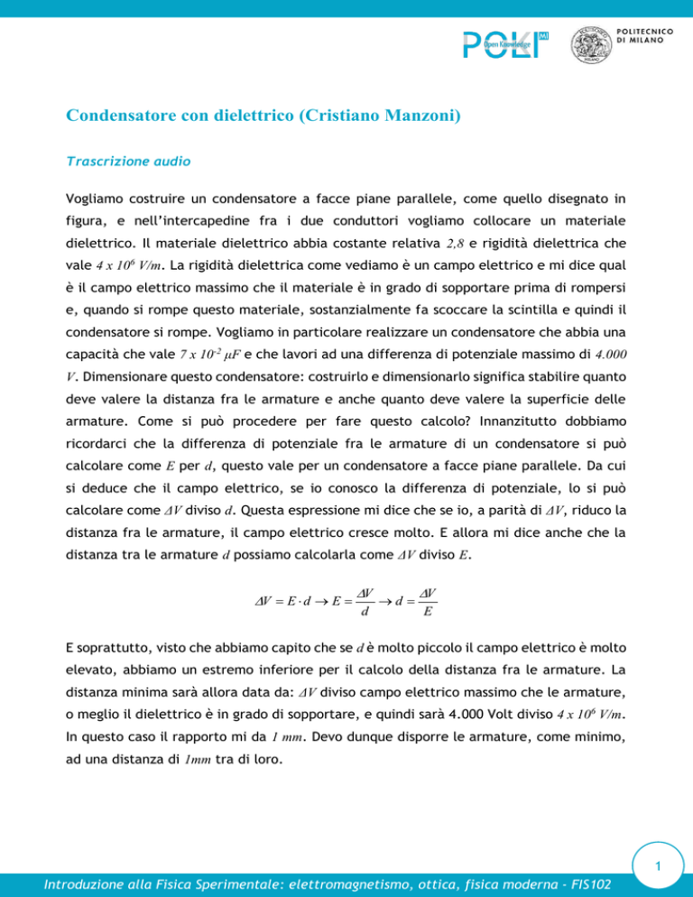 Condensatore con dielettrico (Cristiano Manzoni) Trascrizione audio Vogliamo costruire un condensatore a facce piane parallele, come quello disegnato in figura, e nell’intercapedine fra i due conduttori vogliamo collocare un materiale dielettrico. Il materiale dielettrico abbia costante relativa 2,8 e rigidità dielettrica che vale 4 x 106 V/m. La rigidità dielettrica come vediamo è un campo elettrico e mi dice qual è il campo elettrico massimo che il materiale è in grado di sopportare prima di rompersi e, quando si rompe questo materiale, sostanzialmente fa scoccare la scintilla e quindi il condensatore si rompe. Vogliamo in particolare realizzare un condensatore che abbia una capacità che vale 7 x 10-2 μF e che lavori ad una differenza di potenziale massimo di 4.000 V. Dimensionare questo condensatore: costruirlo e dimensionarlo significa stabilire quanto deve valere la distanza fra le armature e anche quanto deve valere la superficie delle armature. Come si può procedere per fare questo calcolo? Innanzitutto dobbiamo ricordarci che la differenza di potenziale fra le armature di un condensatore si può calcolare come E per d, questo vale per un condensatore a facce piane parallele. Da cui si deduce che il campo elettrico, se io conosco la differenza di potenziale, lo si può calcolare come ΔV diviso d. Questa espressione mi dice che se io, a parità di ΔV, riduco la distanza fra le armature, il campo elettrico cresce molto. E allora mi dice anche che la distanza tra le armature d possiamo calcolarla come ΔV diviso E. V E d E V d d V E E soprattutto, visto che abbiamo capito che se d è molto piccolo il campo elettrico è molto elevato, abbiamo un estremo inferiore per il calcolo della distanza fra le armature. La distanza minima sarà allora data da: ΔV diviso campo elettrico massimo che le armature, o meglio il dielettrico è in grado di sopportare, e quindi sarà 4.000 Volt diviso 4 x 106 V/m. In questo caso il rapporto mi da 1 mm. Devo dunque disporre le armature, come minimo, ad una distanza di 1mm tra di loro. 1 Introduzione alla Fisica Sperimentale: elettromagnetismo, ottica, fisica moderna - FIS102 d min V Emax 4000V 1mm 6 V 4 10 m Valutiamo adesso la superficie. Per saperlo dobbiamo ricordarci che la capacità di un condensatore, C, del dielettrico, è data da ε0 per εr per la superficie diviso la distanza. E allora in questo caso ecco che possiamo determinare quanto vale la superficie. La superficie S, varrà a questo punto: C per la distanza diviso ε0 per εr. E in particolar modo se noi adesso abbiamo calcolato quanto deve essere la distanza minima, è chiaro che il rapporto S su d deve essere fissato e quindi noi questo calcolo lo possiamo fare con le dimensioni minime, e quindi determinare la superficie minima necessaria per realizzare il nostro condensatore. Abbiamo dunque, mettendo tutte le informazioni del nostro problema, quindi la capacità, ε0, εr, riusciamo a determinare quanto deve valere l’area che è 2,82 m2. C 0 r C d min S S min 2,82m 2 d 0 r Sembra un’area gigantesca. Effettivamente è molto grande. Vuole dire che per realizzare questo materiale, questo condensatore, io posso prendere due fogli di materiale conduttore molto grandi, uno sopra l’altro e poi li arrotolo a formare un cilindro, e il cilindro risulterà quindi un condensatore molto compatto. 2 Introduzione alla Fisica Sperimentale: elettromagnetismo, ottica, fisica moderna - FIS102
