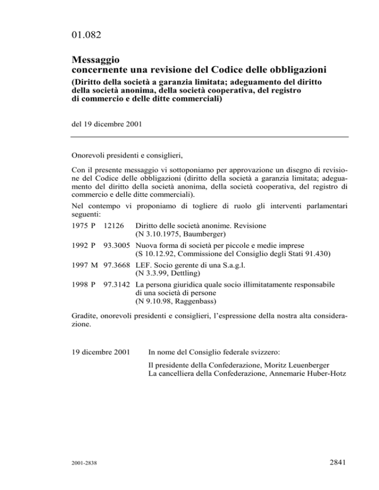 01.082 Messaggio concernente una revisione del Codice delle obbligazioni (Diritto della società a garanzia limitata; adeguamento del diritto della società anonima, della società cooperativa, del registro di commercio e delle ditte commerciali) del 19 dicembre 2001 Onorevoli presidenti e consiglieri, Con il presente messaggio vi sottoponiamo per approvazione un disegno di revisione del Codice delle obbligazioni (diritto della società a garanzia limitata; adeguamento del diritto della società anonima, della società cooperativa, del registro di commercio e delle ditte commerciali). Nel contempo vi proponiamo di togliere di ruolo gli interventi parlamentari seguenti: 1975 P 12126 Diritto delle società anonime. Revisione (N 3.10.1975, Baumberger) 1992 P 93.3005 Nuova forma di società per piccole e medie imprese (S 10.12.92, Commissione del Consiglio degli Stati 91.430) 1997 M 97.3668 LEF. Socio gerente di una S.a.g.l. (N 3.3.99, Dettling) 1998 P 97.3142 La persona giuridica quale socio illimitatamente responsabile di una società di persone (N 9.10.98, Raggenbass) Gradite, onorevoli presidenti e consiglieri, l’espressione della nostra alta considerazione. 19 dicembre 2001 In nome del Consiglio federale svizzero: Il presidente della Confederazione, Moritz Leuenberger La cancelliera della Confederazione, Annemarie Huber-Hotz 2001-2838 2841 Compendio La presente revisione ha lo scopo di conferire alla società a garanzia limitata (Sagl) gli attributi di una vera e propria società di capitali di carattere personale. Occorre colmare le lacune del diritto vigente, che risale al 1936, e aggiornare le disposizioni legali. La normativa proposta consente la costituzione di Sagl unipersonali. Il massimale del capitale sociale, attualmente fissato a due milioni di franchi, è soppresso poiché può frenare inutilmente la crescita di una società che necessità di capitale proprio. Il capitale sociale minimo (20 000 franchi) resta invece invariato. Deve tuttavia essere sempre integralmente liberato (il diritto vigente prevede invece un grado di liberazione minimo del 50%). In contropartita, la responsabilità solidale e sussidiaria dei soci fino all’importo totale del capitale sociale è soppressa. Contrariamente al diritto vigente, che consente a un socio di possedere soltanto una quota sociale, il disegno autorizza una ripartizione della partecipazione finanziaria di ciascun socio in più quote. Occorre allentare le prescrizioni formali cui è subordinata la cessione delle quote senza tuttavia abbandonare le ampie possibilità di limitarne il trasferimento caratteristiche di una società di capitali di carattere personale. Il disegno migliora la protezione dei soci minoritari, segnatamente il diritto di ottenere ragguagli e di consultare documenti e il diritto di opzione in caso di aumento del capitale sociale. Propone di meglio disciplinare il diritto di recesso e l’esclusione di un socio – due caratteristiche della Sagl – in numerosi punti (in particolare per quanto concerne l’indennità corrisposta al socio che lascia la società) al fine di assicurare una migliore attuazione del disciplinamento legale. Fornisce inoltre una risposta in merito a diverse questioni relative agli obblighi di effettuare versamenti suppletivi o di fornire prestazioni accessorie. In considerazione dei bisogni delle piccole imprese, non si è in genere previsto l’obbligo di far verificare il conto annuale da un ufficio di revisione. Soltanto le Sagl che soddisfano talune condizioni soggiacciono a quest’obbligo. A tal proposito il disegno si fonda su diversi criteri inerenti alle dimensioni dell’impresa. L’obbligo di verifica può inoltre risultare da disposizioni statutarie particolari. Per garantire l’unità e la coerenza del diritto delle società, occorre armonizzare la regolamentazione legale di altre forme giuridiche con le disposizioni rivedute del diritto della Sagl. Il disegno prevede gli adeguamenti necessari per la società anonima e la società cooperativa. Introduce quindi diversi miglioramenti (quale p. es. la costituzione di una società anonima unipersonale) anche per queste forme di società. Talune modifiche concernono infine il diritto del registro di commercio e quello delle ditte commerciali. Per un riassunto più circostanziato del messaggio, si rinvia al numero 1.3. 2842 Messaggio 1 Parte generale 1.1 Situazione iniziale La società a garanzia limitata (Sagl) è stata introdotta nel Codice delle obbligazioni (CO; RS 220) nell’ambito della revisione del 19361. Sino all’entrata in vigore della revisione del diritto della società anonima2, la Sagl non si è veramente affermata in Svizzera. Tra il 1992 e il 2001 il numero di Sagl iscritte nel registro di commercio è invece costantemente aumentato, passando da 2 964 (alla fine del 1992) a 52 395 (alla fine di ottobre del 1992). Nel medesimo lasso di tempo il numero delle società anonime ha registrato soltanto un lieve aumento (da 170 584 alla fine del 1992 a 173 320 alla fine di ottobre del 2001). Questa «riscoperta» della Sagl potrebbe essere in parte dovuta alle esigenze imposte alle società anonime nell’ambito della revisione del 1991: segnatamente l’aumento dell’importo minimo del capitale azionario da 50 000 a 100 000 franchi e l’obbligo di far verificare il conto annuale da un ufficio di revisione indipendente, hanno indotto le piccole imprese a scegliere sempre più regolarmente la Sagl. Va inoltre rilevato che (contrariamente a quanto accaduto nei Paesi vicini) la società anonima è stata per lungo tempo utilizzata in modo un po’ troppo disinvolto anche per società molto piccole; l’alternativa meno nota costituita dalla Sagl è invece stata trascurata. Dalla loro adozione, le disposizioni del diritto della Sagl non sono mai state modificate. Benché ampiamente ispirate al diritto tedesco dell’epoca, contengono alcune peculiarità elvetiche che non sono indispensabili. La normativa vigente prese