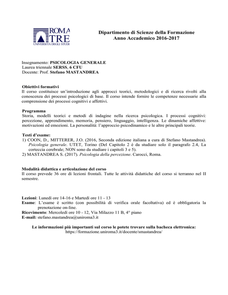 ROMA TRE Dipartimento di Scienze della Formazione Anno Accademico 2016-2017 UNIVERSITÀ DEGLI STUDI Insegnamento: PSICOLOGIA GENERALE Laurea triennale SERSS, 6 CFU Docente: Prof. Stefano MASTANDREA Obiettivi formativi Il corso costituisce un’introduzione agli approcci teorici, metodologici e di ricerca rivolti alla conoscenza dei processi psicologici di base. Il corso intende fornire le competenze necessarie alla comprensione dei processi cognitivi e affettivi. Programma Storia, modelli teorici e metodi di indagine nella ricerca psicologica. I processi cognitivi: percezione, apprendimento, memoria, pensiero, linguaggio, intelligenza. Le dinamiche affettive: motivazioni ed emozioni. La personalità: l’approccio psicodinamico e le altre principali teorie. Testi d’esame: 1) COON, D., MITTERER, J.O. (2016, Seconda edizione italiana a cura di Stefano Mastandrea). Psicologia generale. UTET, Torino (Del Capitolo 2 è da studiare solo il paragrafo 2.4, La corteccia cerebrale; NON sono da studiare i capitoli 3 e 5). 2) MASTANDREA S. (2017). Psicologia della percezione. Carocci, Roma. Modalità didattica e articolazione del corso Il corso prevede 36 ore di lezioni frontali. Tutte le attività didattiche del corso si terranno nel II semestre. Lezioni: Lunedì ore 14-16 e Martedì ore 11 - 13 Esame: L’esame è scritto (con possibilità di verifica orale facoltativa) ed è obbligatoria la prenotazione on-line. Ricevimento: Mercoledì ore 10 - 12, Via Milazzo 11 B, 4° piano E-mail: [email protected] Le informazioni più importanti sul corso le potete trovare sulla bacheca elettronica: https://formazione.uniroma3.it/docente/smastandrea/