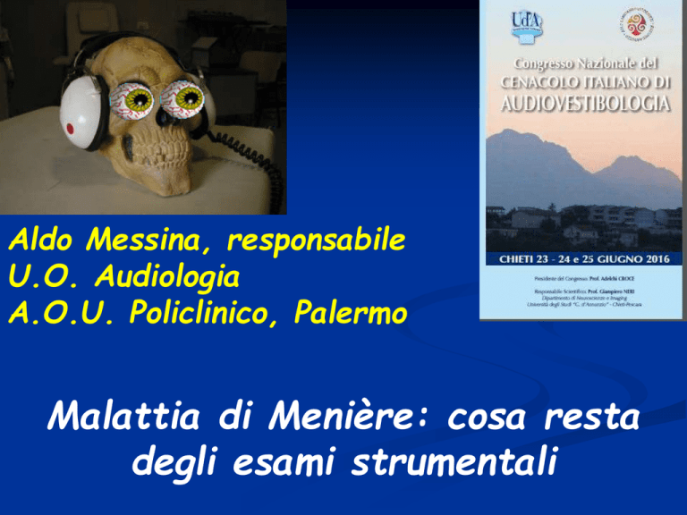 Aldo Messina, responsabile U.O. Audiologia A.O.U. Policlinico, Palermo Malattia di Menière: cosa resta degli esami strumentali Diagnostic criteria for Menière’s disease. Journal of Vestibular Research (2015) (Jose A. Lopez-Escamez, John Carey, Won-Ho Chung, Joel A. Goebel, Mans Magnusson, Marco Mandalà, David E. Newman-Toker, Michael Strupp, Mamoru Suzukii, Franco Trabalzini, Alexandre Bisdorff) Criteri diagnostici per la Malattia di Menière formulati in accordo dai Classification Committee di Bárány Society The Japan Society for Equilibrium Research The European Academy of Otology and Neurotology (EAONO) The Equilibrium Committee of the American Academy of Otolaryngology-Head and Neck Surgery (AAO-HNS) The Korean Balance Society. Diagnostic criteria for Menière’s disease La nuova classificazione include due soli aspetti della malattia: - 1) MdM definita 2) MdM probabile mdM “Probabile” Sintomi vestibolari episodici associati a sintomi uditivi fluttuanti che si protraggono da 20 minuti a 24 ore MdM definita 1. Due o più episodi vertiginosi spontanei della durata da 20 minuti a 12 ore - 2. Ipoacusia neurosensoriale unilaterale sulle frequenze basse/medie, documentata con audiometria , che identifichi l’orecchio affetto in almeno un’occasione prima, durante o dopo uno degli episodi vertiginosi - 3. Sintomi uditivi fluttuanti (sordità , acufeni , fullness) nell’orecchio affetto - 4. Esclusione di altra diagnosi vestibolare fulness deafness vertigo tinnitus UNILATERAL Pirodda et al. Hypotension and sensorineural hering loss: a possible correlation. Acta Otolaryngol (Stockh) 1999 Popolazione selezionata con “ipotensione essenziale” senza fattori di rischio vascolare conosciuti: frequente riscontro, in soggetti “asintomatici”, di curve audiometriche simili a quelle di una M. di Ménière in fase iniziale - Sindrome dell’a. cocleare comune O.K. coclea sacculo Menière Cocleare? La Valvola di Bast e le “ sindromi menieriformi” anteriori e posteriori. Solo che questa valvola è solo una plica e le s. menieriformi non esistono BILATERAL Ipoacusia in salita precoce Fluttuazione uditiva possibile Vertigini Deficit labirintico modesto iniziale Lermoyez possibile fase. Canalare Sordità a gobba , appesa , a V invertita Fluttuazione possibile ma persiste Florida deficit per toni acuti 2 vertigini settimana Deficit labirintico Molto ruota attorno all’idrope “Orecchio fragile (Rauch, 2010) Da questo momento, modificato l’assetto omeostatico dell’orecchio interno qualsiasi causa scatenante per altri insignificante diviene idonea a scatenare le crisi vertiginose MENIERE ( PAGNINI) SINTOMATOLOGIA L’andamento audiometrico sembra confermare l’ipotesi idropica della m di Menière. Il deficit uditivo inizia coinvolgendo le zone a minor calibro del labirinto interno ( Apice della coclea e csc) Membrane flaccide Sordità anche per i toni medi(giri medi con diametro cocleare di media ampiezza) Sordità anche per i toni acuti(Diametro cocleare ampio) Riflettiamo sull’anomala presenza di risposte a 1000 Hz per introdurre il concetto di Zone Morte cocleari Pattern di eccitazione nei soggetti ipoacusici Sono tuttora irrisolti molti aspetti della percezione uditiva negli ipoacusici (Scharf e Florentine, 1982; Humes, 1982; Durlach, 1981) La Percezione dei toni gravi negli ipoacusici “ Misurando le curve di sintonia psicofisica ed i pattern di mascheramento si è dimostrato che La severità della perdita per le basse frequenze può essere sottostimato anche di 30 dB”( Thornton e Abbas, 1980). E’ una conseguenza dell’estensione verso l’alto dell’eccitazione Questo avviene solo quando la frequenza del segnale è inferiore di un’ottava sotto il confine della ipoacusia e solo quando la pendenza della perdita è maggiore di 25 db PER OTTAVA Assenza di c.c.i. e sordità L’assenza di una risposta presentando un tono Però… puro ad elevata intensità è indice di una lesione delle cellule ciliate interne La presenza di una risposta presentando lo stesso tono alla stessa intensità non è sufficiente a dire che nello specifico giro cocleare le cellule siano integre ? Le zone Morte cocleari ( Moore, 2001, Vickers 2001, Baer, 2002, Mackersie,2004, Cairns, 2007..) L’estensione della vibrazione a tutta la membrana basilare fa si che uno stimolo possa essere percepito in una regione diversa da quella “ di sua pertinenza” ( off place listening), luogo di ascolto lontano ) con possibile eccitazione delle cci o dei neuroni afferenti alla zona integra più vicina Le zone Morte cocleari ( Moore, 2001, Vickers 2001, Baer, 2002, Mackersie,2004, Cairns, 2007..) L’estensione della vibrazione a tutta la membrana basilare fa si che uno stimolo possa essere percepito in una regione diversa da quella “ di sua pertinenza” ( off place listening), luogo di ascolto lontano ) con possibile eccitazione delle cci o dei neuroni afferenti alla zona integra più vicina Aldomes Off- frequency listening T.E.N. ( treshold equalized noise) = Rumore mascherante anche per frequenze distanti nello spettro uditivo con shift > 10 dB Aldomes TEN Test ( treshold equalized noise, soglia di rumore equiparata - Moore , 2001) Si somministra un rumore steady state centrato frequenzialmente e dotato del medesimo effetto mascherante anche per frequenze distanti, simile al rumore rosa (tipo 500 e 4000Hz) diversamente dall’abituale RBS. Il paz sordo con zone cocleari morte presenta una curva audiometrica falsata dall’effetto off play listening e la soglia ottenuta con TEN ha uno shift > 10 dB Realizzato un TEN in SPL ed uno in HL Aldomes T.E.N. Test Regioni morte cocleari e protesizzazione acustica Aldomes Le D.C. R. compromettono la percezione di frequenza Aldomes …e l’intellegibilità della parola Aldomes I sistemi in SPL e HL per evidenziare le D.C. R. Aldomes La sordità nei casi di z.m.c.( d.c.r.) Deficit superiore 90 dB per acuti e ai 75 dB per i gravi (Moore,2001) E riprendiamo anch
