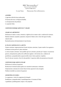 Programma esame a.s. 2014-15 classe 3C MATEMATICA I numeri relativi Proprietà' dei numeri relativi Confronto e rappresentazione grafica Le operazioni con i numeri relativi Addizione e sottrazione Somma algebrica Moltiplicazione Divisione Potenze Il calcolo letterale Espressioni letterali Monomi Polinomi Operazioni con i polinomi Prodotti notevoli Le equazioni Identità' ed equazioni Principi di equivalenza Risoluzione equazioni, verifica e discussione Grafici e funzioni Piano cartesiano Lunghezza di un segmento e punto medio Calcolo aree e perimetri nel piano cartesiano Traslazioni e simmetrie nel piano cartesiano Funzioni nel piano cartesiano: rette passanti e non passanti per l'origine Rette parallele e perpendicolari Iperbole equilatera Intersezione di rette Il calcolo delle probabilità Calcolo delle probabilità' Probabilità' totale e composta Statistica Statistica descrittiva Fase di un' indagine statistica Valori significativi I solidi e la geometria nello spazio Prisma e sviluppo nel piano Piramide e sviluppo nel piano I poliedri e le loro misure Parallelepipedo Cubo Prisma Piramide I solidi di rotazione e le loro misure Cilindro Cono Sfera Rotazione triangolo Rotazione trapezio Rotazione di una figura Solidi composti e cavi Invalsi Esercitazione prove SCIENZE Il corpo umano: la recezione e il controllo gli impulsi viaggiano nei neuroni il sistema nervoso la pelle e il senso del tatto il gusto e l'olfatto l'udito la vista il sistema endocrino le dipendenze il corpo umano: la riproduzione i gameti, le cellule riproduttive gli apparati riproduttori gli ormoni e la funzione riproduttiva adolescenza dal concepimento alla nascita la salute dell'apparato riproduttore il corpo umano: il codice della vita gli acidi nucleici dal DNA alle proteine biotecnologie il ciclo cellulare e la mitosi la meiosi e la formazione dei gameti il corpo umano: l'ereditarietà dei caratteri le leggi di Mendel Geni e caratteri ereditari la genetica umana la vita: l'evoluzione e l'adattamento all'ambiente gli organismi cambiano nel tempo i meccanismi dell'evoluzione gli organismi si adattano all'ambiente le prove a favore dell'evoluzione la Terra: le forze interne della Terra i vulcani i terremoti e i maremoti la struttura interna della Terra continenti alla deriva gli effetti dei movimenti delle placche la Terra: la Terra nell'Universo il cielo sopra di noi le stelle la nascita dell'Universo il Sole il Sistema solare i moti della terra La luna