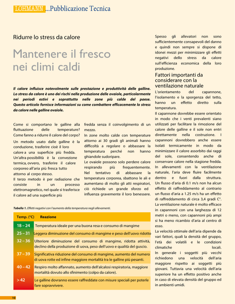 LOHMANN ...Pubblicazione Tecnica Ridurre lo stress da calore Mantenere il fresco nei climi caldi Il calore influisce notevolmente sulle prestazione e produttività delle galline. Lo stress da calore è uno dei rischi nella produzione delle ovaiole, particolarmente nei periodi estivi e soprattutto nelle zone più calde del paese. Questo articolo fornisce informazioni su come combattere efficacemente lo stress da calore nelle galline ovaiole. Spesso gli allevatori non sono sufficientemente consapevoli del danno e quindi non sempre si dispone di idonei mezzi per minimizzare gli effetti negativi dello stress da calore sull’efficienza economica della loro produzione. Fattori importanti da considerare con la ventilazione naturale L’orientamento del capannone, l’isolamento e la sporgenza del tetto, hanno un effetto diretto sulla temperatura. Il capannone dovrebbe essere orientato in modo che i venti prevalenti siano Come si comportano le galline alla fredda senza il coinvolgimento di un utilizzati per facilitare la rimozione del calore delle galline e il sole non entri fluttuazione delle temperature? mezzo. Come fanno a ridurre il calore del corpo? In zone molto calde con temperature direttamente nella costruzione. I Un metodo usato dalle galline è la attorno ai 30 gradi gli animali hanno capannoni dovrebbero anche essere difficoltà a regolare o abbassare la isolati termicamente in modo da conduzione, trasferire cioè il loro temperatura perché non hanno minimizzare il calore assorbito dai raggi calore a una superficie più fredda. del sole, consentendo anche di ghiandole sudoripare. Un’altra possibilità è la convezione Le ovaiole possono solo perdere calore conservare calore nella stagione fredda. termica, ovvero, trasferire il calore respirando più frequentemente. In allevamenti con la ventilazione corporeo all’aria più fresca tutto Nel tentativo di abbassare la naturale, l’aria deve fluire facilmente attorno al corpo stesso. Il terzo metodo è per radiazione che temperatura corporea, sbattono le ali e dentro e fuori dalla struttura. consiste in un processo aumentano di molto gli atti respiratori, Un flusso d’aria di 0.1 m/s non ha alcun effetto di raffreddamento al contrario elettromagnetico, nel quale si trasferisce ciò richiede un grande sforzo ed influenza gravemente il loro benessere. un flusso d’aria a 1.25 m/s ha un effetto il calore ad una superficie più di raffreddamento di circa 3,4 gradi C°. La ventilazione naturale è molto efficace Tabella 1. Effetti negativi con l’aumento della temperatura negli allevamenti. in capannoni con una larghezza di 12 metri o meno, con capannoni più ampi Temp. (°C) Reazione si ha meno ricambio d’aria al centro di 18 – 24 Temperatura ideale per una buona resa e consumo di mangime esso. 25 – 31 Leggera diminuzione del consumo di mangime e peso dell’uovo ridotto La velocità ottimale dell’aria dipende da vari fattori, quali la densità del gruppo, 32 – 36 Ulteriore diminuzione del consumo di mangime, ridotta attività, l’età dei volatili e le condizioni declino della produzione di uova, peso dell’uovo e qualità del guscio. climatiche locali. In generale i soggetti più vecchi 37 – 39 Significativa riduzione del consumo di mangime, aumento del numero richiedono una velocità dell’aria di uova rotte ed infine maggiore mortalità tra le galline più pesanti. maggiore rispetto ai soggetti più 40 – 42 Respiro molto affannato, aumento dell’alcalosi respiratoria, maggiore giovani. Tuttavia una velocità dell’aria mortalità dovuto allo sfinimento (colpo da calore). superiore ha un effetto positivo anche in caso di elevata densità del gruppo ed Le galline dovranno essere raffreddate con misure speciali per poterle > 42 in ambienti umidi. fare sopravvivere. 10 La ventilazione dovrebbe garantire: Una efficace ventilazione forzata: • Un approvvigionamento di aria costante per tutto il capannone senza produrre correnti Un’alternativa agli allevamenti aperti è fornito dall’allevamento chiuso, nel quale si usa l’aria condizionata. Questo sistema è molto più costoso come costruzione e mantenimento, ma allo stesso tempo è il più efficace. Le aziende avicole col sistema di ventilazione forzata sono progettate sia con un sistema a pressione positiva che negativa. Nei climi caldi i sistemi a pressione negativa sono molto usati, l’aria è estratta dall’allevamento dai ventilatori e la caduta di pressione conseguente consente all’aria di entrare attraverso apposite prese d’aria. Sono usati due differenti sistemi a pressione negativa, il sistema a tunnel nel quale l’aria entra nella testata del capannone e viene convogliata in fondo, dove i ventilatori la espellono (ventilazione longitudinale). In alternativa, l’aria fresca può essere presa lateralmente al capannone ed espulsa dalla parte opposta (ventilazione trasversale). Il primo sistema, ossia la ventilazione longitudinale, è considerata molto più efficiente perché un maggiore volume d’aria può essere spostato più rapidamente e ciò vuole dire che gli animali vengono raffreddati in modo significativamente migliore. L’importante è valutare se il ricambio d’aria è adeguato ai chili di carne presenti e se la velocità di transito dell’aria è uniforme in tutto l’allevamento. • Rimuovere l’aria umida del capannone e mantenere gli animali asciutti • Ridurre gli odori e gas nocivi del capannone • Un clima costante con il giusto flusso d’aria. Gli allevamenti con ventilazione naturale sono inoltre in grado di produrre un flusso d’aria che aumenta la convenzione del calore corporeo. La velocità dell’aria non solo ha un effetto sulla qualità della stessa, ma aumenta anche la resistenza delle galline allo stress da caldo, aiuta inoltre a ridurre la temperatura corporea attraverso il miglioramento della convenzione del calore, il cosi detto “fattore vento fresco” aiuta le galline a resistere al calore. Tutti i ve