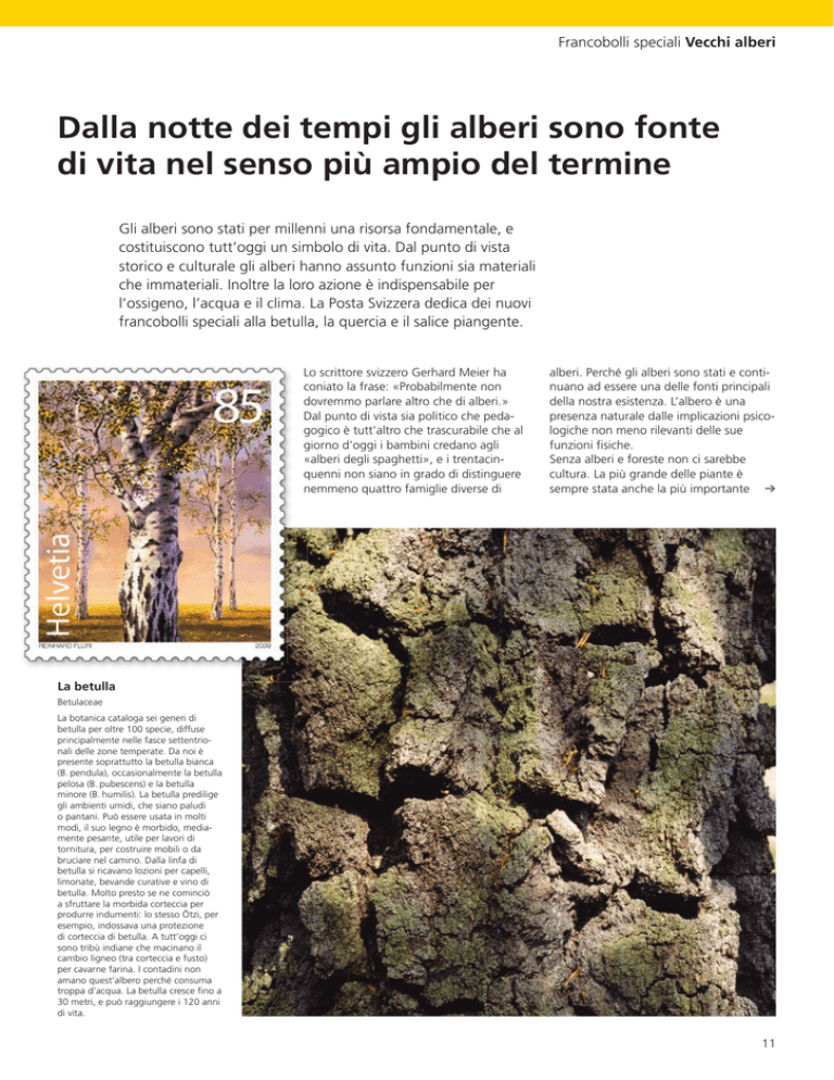 Francobolli speciali Vecchi alberi Dalla notte dei tempi gli alberi sono fonte di vita nel senso più ampio del termine Gli alberi sono stati per millenni una risorsa fondamentale, e costituiscono tutt’oggi un simbolo di vita. Dal punto di vista storico e culturale gli alberi hanno assunto funzioni sia materiali che immateriali. Inoltre la loro azione è indispensabile per l’ossigeno, l’acqua e il clima. La Posta Svizzera dedica dei nuovi francobolli speciali alla betulla, la quercia e il salice piangente. Lo scrittore svizzero Gerhard Meier ha coniato la frase: «Probabilmente non dovremmo parlare altro che di alberi.» Dal punto di vista sia politico che pedagogico è tutt’altro che trascurabile che al giorno d’oggi i bambini credano agli «alberi degli spaghetti», e i trentacinquenni non siano in grado di distinguere nemmeno quattro famiglie diverse di alberi. Perché gli alberi sono stati e continuano ad essere una delle fonti principali della nostra esistenza. L’albero è una presenza naturale dalle implicazioni psicologiche non meno rilevanti delle sue funzioni fisiche. Senza alberi e foreste non ci sarebbe cultura. La più grande delle piante è sempre stata anche la più importante ➔ La betulla Betulaceae La botanica cataloga sei generi di betulla per oltre 100 specie, diffuse principalmente nelle fasce settentrionali delle zone temperate. Da noi è presente soprattutto la betulla bianca (B. pendula), occasionalmente la betulla pelosa (B. pubescens) e la betulla minore (B. humilis). La betulla predilige gli ambienti umidi, che siano paludi o pantani. Può essere usata in molti modi, il suo legno è morbido, mediamente pesante, utile per lavori di tornitura, per costruire mobili o da bruciare nel camino. Dalla linfa di betulla si ricavano lozioni per capelli, limonate, bevande curative e vino di betulla. Molto presto se ne cominciò a sfruttare la morbida corteccia per produrre indumenti: lo stesso Ötzi, per esempio, indossava una protezione di corteccia di betulla. A tutt’oggi ci sono tribù indiane che macinano il cambio ligneo (tra corteccia e fusto) per cavarne farina. I contadini non amano quest’albero perché consuma troppa d’acqua. La betulla cresce fino a 30 metri, e può raggiungere i 120 anni di vita. 11 Francobolli speciali Vecchi alberi La quercia Fagaceae; genere: Quercus Con le sue 450 specie diffuse nell’emisfero nord la quercia è la più imponente delle latifoglie. Dalle nostre parti si segnala soprattutto la farnia (Q. robur), seguita dalla roverella (Q. pubescens) e dal rovere (Q. petraea). Le farnie prediligono gli ambienti umidi, se non direttamente acquatici. Per questo attirano i fulmini (dei del tuono). A reggere Venezia sono tra l’altro dei pali di quercia. Il legno della quercia è duro, pesante e solido. Con il faggio, la quercia è sempre stata l’albero più prezioso ed economicamente più rilevante. Viene utilizzata come legname da costruzione, oltre che per parchetti, mobili e cornici. Un tempo quello di quercia era il legno più diffuso anche per la costruzione di navi e traversine. Le querce sono l’habitat ideale per più di 700 specie di animali da cortile, uccelli e insetti. Possono raggiungere i 40 metri d’altezza e in singoli casi possono superare i mille anni di vita. ➔ delle risorse. In breve: ogni albero è un piccolo shopping center. In passato se ne mangiavano foglie, germogli, rami, fiori, frutti, corteccia e radici. Ghiande e pigne erano un mezzo di sostentamento fondamentale. Dagli alberi si sono ricavati indumenti e medicinali. Il legno è servito per capanne, case, carri, armi, navi, badili, forni, stufe, culle e bare. Le betulle davano la miglior legna da ardere, le querce il miglior legno da costruzione. I salici sono diventati armature, i loro rami legna da ceste e tralicci. Senza alberi non avremmo nemmeno carbone o vetro fuso. Grazie agli alberi ci si scalda, si cucina, si bolle, si distilla: 12 carbone, pece, resina, vetro, olio, unguenti, solventi, saponi, colle, esplosivi ecc. – dagli alberi è nata anche la petrolchimica. E il resto è finito in agricoltura. All’inizio del 17° secolo l’Europa era disboscata, le foreste continentali completamente distrutte. Di conseguenza la steppa avanzava, si moltiplicavano le siccità e la legna mancava dappertutto. Lo spavento fu immenso. Ne conseguì la promulgazione di leggi boschive e la nascita della scienza forestale. Eppure: se attorno al 1850 non fosse stato scoperto il petrolio – anch’esso un «prodotto ligneo» – gli alberi si sarebbero estinti. Chi non si sofferma pieno di rispetto di fronte a un albero vecchio e imponente? Chiamiamolo «sacro terrore» per l’inspiegabile. È così che ebbero inizio le rappresentazioni magiche: sulle pareti di una caverna, o come pittura rupestre. L’albero non è ancora una divinità, ma serba già in sé delle energie misteriose. Successivamente sarebbe diventato attributo o rappresentante del divino, un simbolo con diverse sfaccettature. Tra il 3000 e il 1000 a. C. le divinità egizie dei morti prendono forme arboree, mentre nell’antico Oriente e in Mesopotamia compaiono rami e palme divine. Presso i greci, i romani, i celti e i germani Motivo su busta primo giorno Il salice Salicaceae Del salice si distinguono due generi con circa 350 specie, concentrate soprattutto nell’emisfero nord. Possono formare arbusti o alberi. Distinguere esattamente le diverse specie è un’impresa difficile anche per gli intenditori. Dalle nostre parti spicca il salice bianco (S. alba), il salice fragile (S. fragilis), il salice delle capre (S. caprea) oltre al salice cenerino (S. cinerea). Il salice piangente (S. alba «Triste») è il perfezionamento artificiale di una mutazione naturale. Il legno di salice è morbido, leggero e adatto per produrre cellulosa, cartone da fibra e pannelli in truciolato. Nei salici è presente il glycosid salicin, dal quale si ricava un medicinale celebre in tutto il mondo: l’a