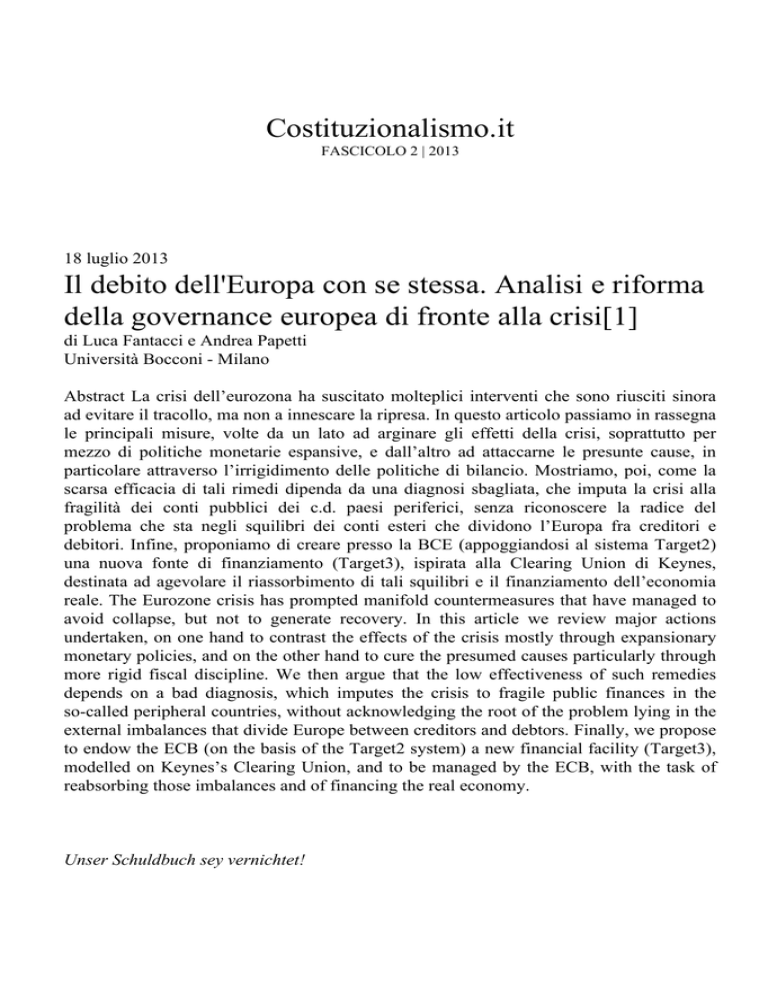Costituzionalismo.it FASCICOLO 2 | 2013 18 luglio 2013 Il debito dell'Europa con se stessa. Analisi e riforma della governance europea di fronte alla crisi[1] di Luca Fantacci e Andrea Papetti Università Bocconi - Milano Abstract La crisi dell’eurozona ha suscitato molteplici interventi che sono riusciti sinora ad evitare il tracollo, ma non a innescare la ripresa. In questo articolo passiamo in rassegna le principali misure, volte da un lato ad arginare gli effetti della crisi, soprattutto per mezzo di politiche monetarie espansive, e dall’altro ad attaccarne le presunte cause, in particolare attraverso l’irrigidimento delle politiche di bilancio. Mostriamo, poi, come la scarsa efficacia di tali rimedi dipenda da una diagnosi sbagliata, che imputa la crisi alla fragilità dei conti pubblici dei c.d. paesi periferici, senza riconoscere la radice del problema che sta negli squilibri dei conti esteri che dividono l’Europa fra creditori e debitori. Infine, proponiamo di creare presso la BCE (appoggiandosi al sistema Target2) una nuova fonte di finanziamento (Target3), ispirata alla Clearing Union di Keynes, destinata ad agevolare il riassorbimento di tali squilibri e il finanziamento dell’economia reale. The Eurozone crisis has prompted manifold countermeasures that have managed to avoid collapse, but not to generate recovery. In this article we review major actions undertaken, on one hand to contrast the effects of the crisis mostly through expansionary monetary policies, and on the other hand to cure the presumed causes particularly through more rigid fiscal discipline. We then argue that the low effectiveness of such remedies depends on a bad diagnosis, which imputes the crisis to fragile public finances in the so-called peripheral countries, without acknowledging the root of the problem lying in the external imbalances that divide Europe between creditors and debtors. Finally, we propose to endow the ECB (on the basis of the Target2 system) a new financial facility (Target3), modelled on Keynes’s Clearing Union, and to be managed by the ECB, with the task of reabsorbing those imbalances and of financing the real economy. Unser Schuldbuch sey vernichtet! 1. Introduzione L’Europa si è avvitata in una crisi da cui non sembra capace di uscire. L’Europa non cresce. E non perché si sia smesso di produrre, ma perché si è smesso di vendere ciò che si produce. È il calo della domanda, e non innanzi tutto della capacità produttiva, a provocare perdite, licenziamenti e disoccupazione. D’altro canto, quanto più la disoccupazione persiste, tanto più si finiscono per perdere davvero capacità produttiva e competenze. Ma il problema è finanziario prima che reale. L’Europa è soffocata da debiti, pubblici e privati, sempre più difficili da pagare, o anche soltanto da rifinanziare. Sono questi debiti che hanno innescato la crisi e che continuano a rappresentare una zavorra per ogni tentativo di ripresa. Le contromisure adottate finora, in effetti, hanno evitato il collasso, ma non sembrano in grado di segnare un deciso cambiamento di rotta verso il risanamento dell’economia europea. Manovre di espansione monetaria senza precedenti hanno ridato fiato, almeno temporaneamente, ai debitori in difficoltà. D’altro canto, le politiche di austerity, cui i piani di salvataggio sono stati subordinati, sono sempre più diffusamente accusate di avere depresso ulteriormente la domanda, con effetti controproducenti proprio sull’andamento di quel rapporto fra debito pubblico e PIL che si vorrebbe ridurre.[2] Le risposte alla crisi non hanno soltanto aggravato la recessione delle economie europee, ma hanno esacerbato le fratture interne dell’Europa. Per i paesi a rischio d’insolvenza, primo fra tutti la Grecia, gli aiuti finanziari dell’Europa sono stati soggetti a condizioni estremamente onerose in termini economici e sociali. Mentre agli occhi dei creditori, quegli aiuti hanno potuto apparire come una forma di assistenza indebita, ancorché necessaria, a favore di paesi troppo prodighi. Lo ha scritto recentemente l’Economist (2013): come una vecchia coppia disamorata, l’Europa è ormai tenuta assieme soltanto dai costi della separazione. Non è certo la migliore premessa per un’unione serena. Al contrario, la convivenza forzata non fa che esasperare gli animi. Crescono la diffidenza reciproca e lo spirito di rivalsa. I comportamenti devono essere regolati da norme sempre più intricate. I rapporti si contrattualizzano. I gradi di libertà si restringono. Una volta avviato il calcolo costi-benefici, arriva il momento in cui, a qualcuno se non a tutti, pare conveniente piuttosto separarsi. Nella prima parte di questo lavoro, cerchiamo di mostrare come si sia arrivati a questo punto, passando in rassegna le principali contromisure adottate, a partire dalla scoppio della crisi (sezione 2). Sta di fatto che, a dispetto degli appelli sempre più frequenti a rafforzare e accelerare il processo di unificazione, l’Unione Europea appare sempre meno unita. Lacerata da squilibri macroeconomici, tensioni politiche, nazionalismi montanti. Ma che cosa fa l’unità di un’Unione? Su quali basi si costruisce un progetto di federazione così ambizioso come quello che si proponeva di unire pacificamente popoli per secoli dilaniati dalla guerra? Nel processo d’integrazione europea un ruolo fondamentale e prioritario è stato assegnato all’unione economica e monetaria. Proprio questo fatto è spesso additato come il peccato originale dell’Europa unita: come si dice, si sarebbe unificata la moneta prima della politica; e, così facendo, si sarebbe partiti dalla dimensione più gretta e materiale, tralasciando la necessità di costruire l’unione su un piano più elevato, dei principi costituzionali e dell’identità culturale. Tuttavia, a nostro avviso, non è questo l’errore. Il problema non è aver fatto la moneta, e nemmeno averla fatta troppo presto, ma averla concepita 