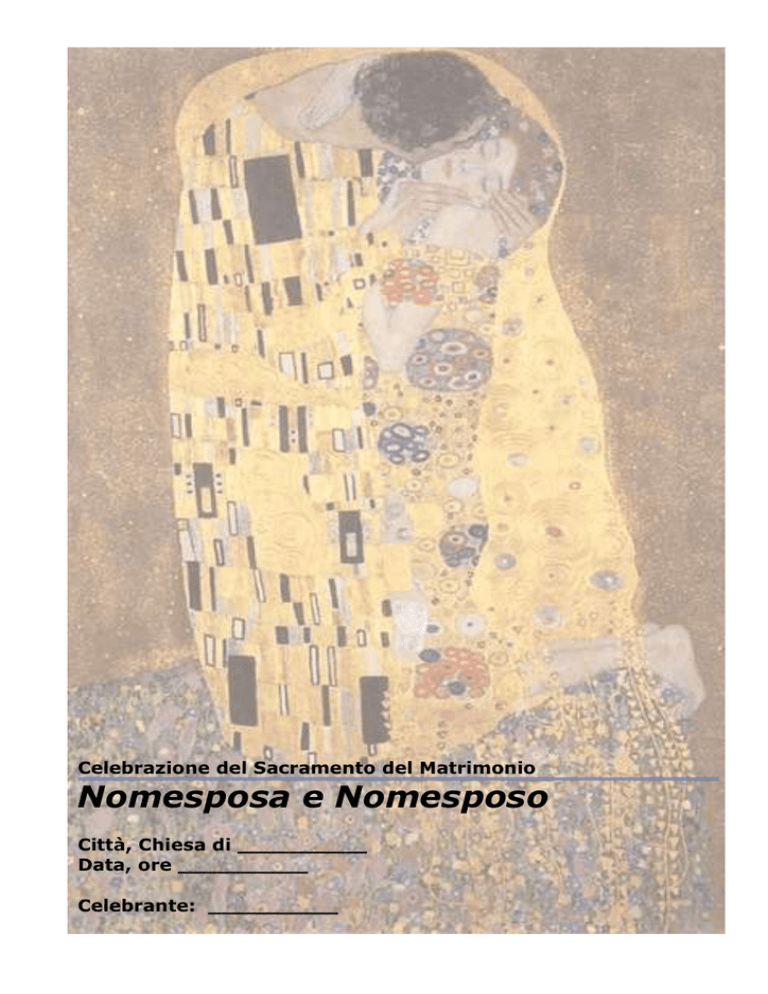 Celebrazione del Sacramento del Matrimonio Nomesposa e Nomesposo Città, Chiesa di __________ Data, ore __________ Celebrante: __________ RITI DI INTRODUZIONE Sac: Nel nome del Padre e del Figlio e dello Spirito Santo Tutti: Amen Sac: Il Signore che guida i nostri cuori nell'amore e nella pazienza di Cristo sia con tutti voi Tutti: E con il tuo spirito MEMORIA DEL BATTESIMO Sac: Fratelli ci siamo riuniti con gioia nella casa del Signore nel giorno in cui Nomesposa e Nomesposo intendono formare la loro famiglia. In quest’ora di particolare grazia siamo loro vicini con l’affetto, con l’amicizia e la preghiera fraterna. Ascoltiamo insieme con loro la Parola che Dio oggi ci rivolge. In unione con la santa Chiesa supplichiamo Dio Padre, per Cristo Signore nostro, perché benedica questi suoi figli che stanno per celebrare il loro matrimonio, li accolga nel suo amore e li costituisca in unità. Facciamo ora memoria del Battesimo, nel quale siamo rinati a vita nuova. Divenuti figli nel Figlio, riconosciamo con gratitudine il dono ricevuto, per rimanere fedeli all’amore a cui siamo stati chiamati. Sac: Padre, nel Battesimo del tuo Figlio Gesù al fiume Giordano hai rivelato al mondo l’amore sponsale per il tuo popolo. Tutti: Noi ti lodiamo e ti rendiamo grazie. Sac: Cristo Gesù, dal tuo costato aperto sulla Croce hai generato la Chiesa, tua diletta sposa. Tutti: Noi ti lodiamo e ti rendiamo grazie. Sac: Spirito Santo, potenza del Padre e del Figlio, oggi fai risplendere in Nomesposa e Nomesposo la veste nuziale della Chiesa. Tutti: Noi ti lodiamo e ti rendiamo grazie. Sac: Dio onnipotente, origine e fonte della vita, che ci hai rigenerati nell’acqua con la potenza del tuo Spirito, ravviva in noi la grazia del Battesimo, e concedi a Nomesposa e Nomesposo un cuore libero e una fede ardente perché, purificati nell’intimo, accolgano il dono del Matrimonio, nuova via della loro santificazione. Per Cristo nostro Signore. Tutti: Amen GLORIA A DIO -3- Tutti: Gloria a Dio nell'alto dei cieli e pace in terra agli uomini di buona volontà. Noi ti lodiamo, ti benediciamo, ti adoriamo, ti glorifichiamo, ti rendiamo grazie per la tua gloria immensa, Signore Dio, re del cielo, Dio Padre onnipotente. Signore, Figlio unigenito, Gesù Cristo, Signore Dio, Agnello di Dio, Figlio del Padre, tu che togli i peccati del mondo, abbi pietà di noi; tu che togli i peccati del mondo accogli la nostra supplica; tu che siedi alla destra del Padre, abbi pietà di noi. Perché tu solo il santo, tu solo il Signore, tu solo l'Altissimo, Gesù Cristo, con lo Spirito Santo nella gloria di Dio Padre. Amen. ALL'INIZIO DELL'ASSEMBLEA LITURGICA Sac: Preghiamo O Dio, che in questo grande sacramento hai consacrato il patto coniugale, per rivelare nell’unione degli sposi il mistero di Cristo e della Chiesa, concedi a Nomesposa e Nomesposo di esprimere nella vita il dono che ricevono nella fede. Per Gesù Cristo, tuo Figlio che è Dio, e vive e regna con te, nell'unità dello Spirito Santo, per tutti i secoli dei secoli. Tutti: Amen. LITURGIA DELLA PAROLA PRIMA LETTURA Dal libro della Genesi (Gen 2,18-24) Il Signore Dio disse: «Non è bene che l'uomo sia solo: gli voglio fare un aiuto che gli sia simile». Allora il Signore Dio plasmò dal suolo ogni sorta di bestie selvatiche e tutti gli uccelli del cielo e li condusse all'uomo, per vedere come li avrebbe chiamati: in qualunque modo l'uomo avesse chiamato ognuno degli esseri viventi, quello doveva essere il suo nome. Così l'uomo impose nomi a tutto il bestiame, a tutti gli uccelli del cielo e a tutte le bestie selvatiche, ma l'uomo non trovò un aiuto che gli fosse simile. Allora il Signore Dio fece scendere un torpore sull'uomo, che si addormentò; gli tolse una delle costole e rinchiuse la carne al suo posto. Il Signore Dio plasmò con la costola, che aveva tolta all'uomo, una donna e la condusse all'uomo. Allora l'uomo disse: «Questa volta essa è carne dalla mia carne e osso dalle mie ossa. La si chiamerà donna perché dall'uomo è stata tolta». Per questo l'uomo abbandonerà suo padre e sua madre e si unirà a sua moglie e i due saranno una sola carne. Parola di Dio -4- Tutti: Rendiamo grazie a Dio SALMO RESPONSORIALE (Sal 148) Tutti: Lodiamo insieme il Signore: sia benedetto il suo nome. Lodate il Signore dai cieli, lodatelo nell'alto dei cieli. Lodatelo, voi tutti, suoi angeli, lodatelo, voi tutte, sue schiere. Tutti: Lodiamo insieme il Signore: sia benedetto il suo nome. Lodatelo, sole e luna, lodatelo, voi tutte, fulgide stelle. Lodatelo, cieli dei cieli, voi acque al di sopra dei cieli. Tutti: Lodiamo insieme il Signore: sia benedetto il suo nome. Lodate il Signore dalla terra, monti e voi tutte, colline, alberi da frutto e tutti voi, cedri, voi fiere e tutte le bestie, rettili e uccelli alati. Tutti: Lodiamo insieme il Signore: sia benedetto il suo nome. I re della terra e i popoli tutti, i governanti e i giudici della terra, i giovani e le fanciulle, i vecchi insieme ai bambini lodino il nome del Signore: perché solo il suo nome è sublime. Tutti: Lodiamo insieme il Signore: sia benedetto il suo nome. La sua gloria risplende sulla terra e nei cieli. Egli ha sollevato la potenza del suo popolo. E` canto di lode per tutti i suoi fedeli, per i figli di Israele, popolo che egli ama. Tutti: Lodiamo insieme il Signore: sia benedetto il suo nome. SECONDA LETTURA Dalla lettera di san Paolo apostolo agli Efesini (Ef 5,1-2a.21-33) Fratelli, fatevi imitatori di Dio, quali figli carissimi, e camminate nella carità, nel modo che anche Cristo vi ha amato e ha dato se stesso per noi. Siate sottomessi gli uni agli altri nel timore di Cristo. -5- Le mogli siano sottomesse ai mariti come al Signore; il marito infatti è capo della moglie, come anche Cristo è capo della Chiesa, lui che è il salvatore del suo corpo. E come la Chiesa sta sottomessa a Cristo, così anche le mogli siano soggette ai loro mariti in tutto. E voi, mariti, amate le vostre mogli, come Cristo h