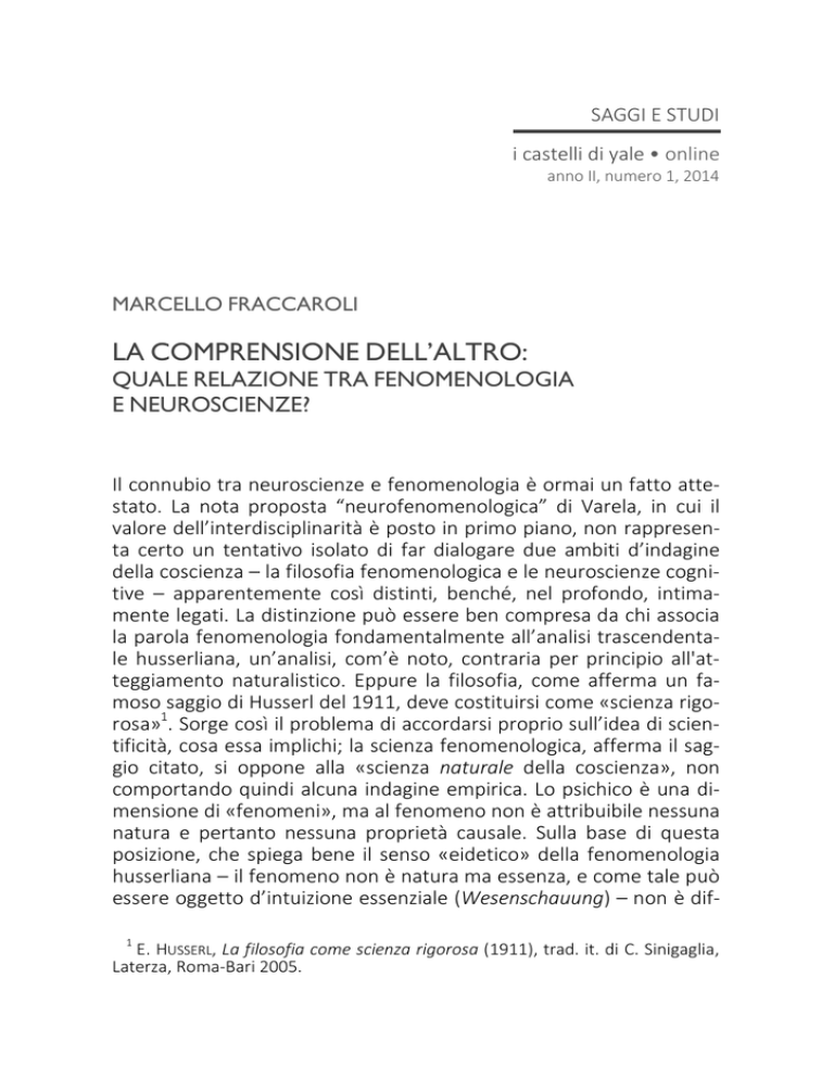SAGGI E STUDI i castelli di yale • online anno II, numero 1, 2014 MARCELLO FRACCAROLI LA COMPRENSIONE DELL’ALTRO: QUALE RELAZIONE TRA FENOMENOLOGIA E NEUROSCIENZE? Il connubio tra neuroscienze e fenomenologia è ormai un fatto attestato. La nota proposta “neurofenomenologica” di Varela, in cui il valore dell’interdisciplinarità è posto in primo piano, non rappresenta certo un tentativo isolato di far dialogare due ambiti d’indagine della coscienza – la filosofia fenomenologica e le neuroscienze cognitive – apparentemente così distinti, benché, nel profondo, intimamente legati. La distinzione può essere ben compresa da chi associa la parola fenomenologia fondamentalmente all’analisi trascendentale husserliana, un’analisi, com’è noto, contraria per principio all'atteggiamento naturalistico. Eppure la filosofia, come afferma un famoso saggio di Husserl del 1911, deve costituirsi come «scienza rigorosa»1. Sorge così il problema di accordarsi proprio sull’idea di scientificità, cosa essa implichi; la scienza fenomenologica, afferma il saggio citato, si oppone alla «scienza naturale della coscienza», non comportando quindi alcuna indagine empirica. Lo psichico è una dimensione di «fenomeni», ma al fenomeno non è attribuibile nessuna natura e pertanto nessuna proprietà causale. Sulla base di questa posizione, che spiega bene il senso «eidetico» della fenomenologia husserliana – il fenomeno non è natura ma essenza, e come tale può essere oggetto d’intuizione essenziale (Wesenschauung) – non è dif1 E. HUSSERL, La filosofia come scienza rigorosa (1911), trad. it. di C. Sinigaglia, Laterza, Roma-Bari 2005. i castelli di yale • online ficile comprendere lo scalpore che ogni tentativo di “naturalizzazione” della fenomenologia porta con sé. Tuttavia, il cammino verso una forma più o meno ampia – a seconda dei punti di vista – di naturalizzazione sembra essere oggi un fatto che dobbiamo accettare, senza abbandonare ovviamente una prospettiva critica. Fenomenologia e neuroscienze, abbiamo detto, come ambiti d’indagine intimamente legati; ebbene, questo legame emerge molto chiaramente se osserviamo l’interesse che le neuroscienze cognitive hanno rivolto, a partire dagli anni Novanta, alle ricerche di filosofi appartenenti al movimento fenomenologico, in particolare Merleau-Ponty, Edith Stein, oltre naturalmente a Husserl. Più precisamente, questo avvicinamento si inserisce all’interno di uno specifico – ma al tempo stesso estremamente vasto – dominio di ricerca, quello della cognizione sociale. Sembra strano che l’attuale ripresa della fenomenologia da parte di alcuni neuroscienziati provenga proprio da osservazioni basate su esperimenti strettamente empirici, eppure questi sono i fatti. La scoperta dei “neuroni specchio” (mirror neurones), i quali si attivano sia quando compiamo un’azione sia quando la vediamo compiuta da altri, non ha fatto altro che ricondurre l’interpretazione neuroscientifica alle analisi che i fenomenologi hanno elaborato attorno al tema dell’intersoggettività, al punto che, in un certo senso, queste analisi sembrano trovare proprio una conferma empirica in quegli studi sulla struttura e le attivazioni dell’apparato neuronale caratteristiche della cognizione sociale. In effetti, quello che emerge dall’osservazione dell’attività dei “mirror neurons” è una visione non-inferenziale e a-razionale della comprensione intersoggettiva, che contrasta con una delle posizioni che negli ultimi anni ha in parte dominato il dibattito filosofico-psicologico sulla natura delle relazioni sociali, ovvero la “teoria della teoria”. Secondo questa posizione la comprensione dell’altro ha carattere essenzialmente teorico, fondata sull’attribuzione all’altro soggetto di stati mentali. I teorici dei neuroni specchio, al contrario, hanno potuto rilevare, attraverso la visualizzazione neuronale in determinate situazioni, come l’origine dell’inter-relazione abbia un carattere prevalentemente non-teorico e radicato nelle capacità motorie e sensoriali del soggetto, mettendo così in primo piano il ruolo del corpo. Del primato somatologico, sia nella costituzione del soggetto per se stesso, sia nell’esperienza dell’altro, è certamente consapevole chiunque si interessi all’intersoggettività da un punto di vista fenomenologico. Come Husserl ci ha mostrato, la costituzione dell’alter ego non può 106 Marcello Fraccaroli La comprensione dell’altro essere concepita senza un riferimento originario al corpo vissuto, il Leib; con ciò, non è difficile comprendere come taluni teorici delle neuroscienze abbiano potuto intravedere un accordo tra i dati offerti dagli esperimenti sui neuroni specchio e la concezione husserliana dell’esperienza altrui2. Nelle pagine seguenti non intendo affrontare la difficile questione della naturalizzazione della fenomenologia – presupponendo tuttavia che una naturalizzazione “totale” eliminerebbe il senso autentico della ricerca fenomenologica3; vorrei piuttosto presentare in maniera più dettagliata la concezione husserliana di “empatia”, in quanto relazione essenzialmente intercarnale – idea richiamata di continuo negli articoli sui “mirror neurons”, ma spesso in modo assolutamente 2 Cfr. E. THOMPSON, Empathy and Consciousness, «Journal of Consciousness Studies», 8/5-7, 2001, p. 9; V. GALLESE, The Roots of Empathy: The Shared Manifold Hypothesis and the Neural Basis of Intersubjectivity, «Psychopathology», 36, 2003, pp. 175-76; De Preester, da una prospettiva filosofica, afferma: «According to mirror neuron theorists, we understand actions when the visual representation of the observed action is mapped onto our motor representation of that action. This can easily be reformulated in Husserlian terminology: the visual perception of the body of the other is mapped onto our own kinaesthetic representation, or the Körper is mapped onto the Lei