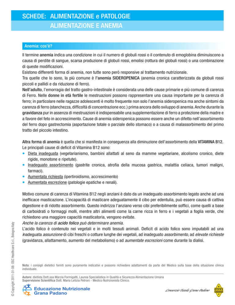 SCHEDE: ALIMENTAZIONE e PATOLOGIE ALIMENTAZIONE E ANEMIA Anemia: cos’è? Il termine anemia indica una condizione in cui il numero di globuli rossi o il contenuto di emoglobina diminuiscono a causa di perdite di sangue, scarsa produzione di globuli rossi, emolisi (rottura dei globuli rossi) o una combinazione di queste modificazioni. Esistono differenti forma di anemia, non tutte sono però responsive al trattamento nutrizionale. Tra quelle che lo sono, la più comune è l’anemia SIDEROPENICA (anemia cronica caratterizzata da globuli rossi piccoli e pallidi e da riduzione di ferro). Nell’adulto, l’emorragia del tratto gastro-intestinale è considerata una delle cause primarie e più comune di carenza di Ferro. Nelle donne in età fertile le mestruazioni possono rappresentare una causa importante per la carenza di ferro; in particolare nelle ragazze adolescenti è molto frequente non solo l’anemia sideropenica ma anche sintomi da carenza di ferro (stanchezza, difficoltà di concentrazione ecc.) prima ancora dello sviluppo di anemia. Anche durante la gravidanza pur in assenza di mestruazioni è indispensabile una supplementazione di ferro a protezione della madre e a favore del feto in accrescimento. Cause di anemia sideropenica possono essere anche un difetto nell’assorbimento del ferro dopo gastrectomia (asportazione totale o parziale dello stomaco) o a causa di malassorbimento del primo tratto del piccolo intestino. © Copyright 2011-31-08- OSC Healthcare S.r.l., Bologna Italy Altra forma di anemia è quella che si manifesta in conseguenza alla diminuzione dell’assorbimento della VITAMINA B12. Le principali cause di deficit di Vitamina B12 sono: l Dieta inadeguata (vegetarianismo, bambini allattati al seno da mamme vegetariane, alcolismo cronico, diete rigide, monotone e ripetute). l Inadeguato assorbimento (gastrite cronica, atrofia della mucosa gastrica, malattia celiaca, tumori maligni, farmaci). l Aumentata richiesta (ipertiroidismo, accrescimento) l Aumentata escrezione (patologie epatiche e renali). Motivo comune di carenza di Vitamina B12 negli anziani è dato da un inadeguato assorbimento legato anche ad una inefficace masticazione. L’incapacità di masticare adeguatamente il cibo per edentulia, può essere causa di cattiva digestione e di ridotto assorbimento. Questo indirizza l’anziano verso cibi preferibilmente soffici, come quelli a base di carboidrati o formaggi molli, mentre altri alimenti come la carne ricca in ferro e i vegetali a foglia verde, che richiedono una maggiore capacità masticatoria, vengono evitate. Anche la carenza di acido folico può determinare anemia. L’acido folico è contenuto nei vegetali e in molti tessuti animali. Deficit di acido folico sono imputabili ad una inadeguata assunzione di cibi freschi o cotture lunghe dei vegetali, ad inadeguato assorbimento, ad elevate richieste (gravidanza, allattamento, aumento del metabolismo) o ad aumentate escrezioni come durante la dialisi. Nota: i consigli dietetici forniti sono puramente indicativi e possono richiedere adattamenti da parte del Medico sulla base della situazione clinica individuale. Autore: dietista Dott.ssa Marzia Formigatti, Laurea Specialistica in Qualità e Sicurezza Alimentazione Umana Supervisione Scientifica Dott. Maria Letizia Petroni - Medico Nutrizionista Clinico. SCHEDE: ALIMENTAZIONE e PATOLOGIE ALIMENTAZIONE E ANEMIA Da alcuni semplici parametri dosabili mediante prelievo di sangue il Medico Curante potrà fare la corretta diagnosi di anemia da cause nutrizionali, individuare la carenza o le carenze (ferro, vitamina B12, e/acido folico) e suggerire dosaggio e durata di eventuali integrazioni. Dal momento che sia la carenza di vitamina B12 che di acido folico danno entrambe luogo ad aumento di volume dei globuli rossi (anemia macrocitica) e che spesso queste due carenze si associano è sempre opportuno integrare contemporaneamente con entrambi questi fattori nutrizionali, dal momento che la normalizzazione del volume globulare con la somministrazione del solo acido folico potrebbe mascherare un deficit di B12 potenzialmente pericoloso. Raccomandazioni dietetiche: Nella prevenzione dell’anemia sideropenica è fondamentale un’alimentazione ricca di ferro. Generalmente invece, è difficile con la sola alimentazione assumere una quantità di ferro sufficiente al ripristino delle scorte, quindi non si può contare solo sull’apporto alimentare nel caso in cui la diagnosi di sideropenia sia già certa, ma una volta ripristinate le scorte mediante supplementazione, sarà più facile mantenerle con una adeguata alimentazione. L’assunzione minima raccomandata di ferro negli adulti è di 10 mg al giorno nei maschi e nelle donne in menopausa e di 18 mg al giorno nelle donne in età fertile. Il ferro che si trova negli alimenti di origine animale (carni rosse magre, tacchino, pollo, pesci come tonno, merluzzo, salmone ecc) è il ferro eme che viene assorbito più facilmente dal nostro intestino. Negli alimenti di origine vegetale troviamo il ferro non eme (cereali, legumi, verdure). Alimenti ricchi di ferro in forma facilmente assorbibile: Contenuto di ferro Tra 2 e 5 mg pesci ALIMENTI carni DI ORIGINE ANIMALE Contenuto di ferro Contenuto di ferro Tra 5 e 8 mg Maggiore di 8 mg salsiccia bresaola frattaglie carne di cavallo uova (tuorlo) salumi © Copyright 2011-31-08- OSC Healthcare S.r.l., Bologna Italy Valori riferiti a 100 g di alimento crudo, già pulito e pronto per il consumo Nota: i consigli dietetici forniti sono puramente indicativi e possono richiedere adattamenti da parte del Medico sulla base della situazione clinica individuale. Autore: dietista Dott.ssa Marzia Formigatti, Laurea Specialistica in Qualità e Sicurezza Alimentazione Umana Supervisione Scientifica Dott. Maria Letizia Petroni - Medico Nutrizionista Clinico. SCHEDE: ALIMENTAZIONE e PATOLOGIE ALIMENTAZIONE E ANEMIA Alimenti ricchi di ferro in forma meno assorbibile: Contenuto di ferro Tra 2 e 5 