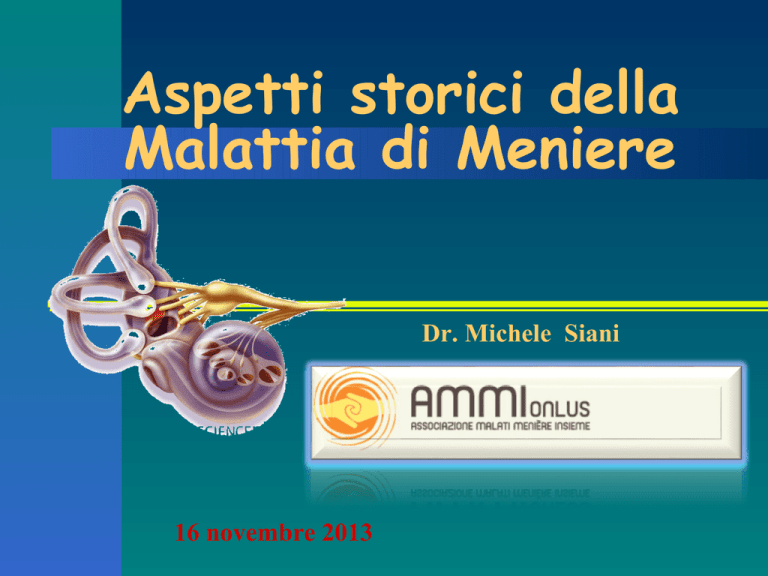 Aspetti storici della Malattia di Meniere Dr. Michele Siani 16 novembre 2013 MALATTIA di MENIERE J. Shea che descrisse la complessità della Meniere utilizzando la frase di W. Churchill sulla Cina: "A mistery within a riddle within a paradox“ un mistero in un enigma in un paradosso. MALATTIA di MENIERE • UNIVERSITA’ • OSPEDALE • SPECIALISTICA TERRITORIALE • MEDICO DI BASE • PAZIENTE MALATTIA di MENIERE Il ruolo della timpanometria posizionale nella sindrome di Meniere. M. Siani et al. Nuova Clinica Otorinolaringoiatrica. Vol. XLV, n.1, 1993. MALATTIA di MENIERE L’applicazione clinica delle DPOAEs può fornire informazioni sulle regioni cocleari interessate da processi degenerativi, soprattutto nelle prime fasi della malattia ove le alterazioni funzionali possono prevalere rispetto a quelle organiche. MALATTIA di MENIERE I potenziali evocati vestibolari miogenici (VEMPs) rappresentano una nuova metodica vestibolare che permette di studiare una risposta vestibolare degli organi otolitici principalmente del sacculo ed accessoriamente dell’utricolo tale risposta è ottenuta attraverso la registrazione di una particolare tipologia di potenziali muscolari dei muscoli sternocleidomastoidei a seguito di una stimolazione meccanico-vibratoria sul cranio o di un intensa stimolazione acustica MALATTIA di MENIERE Tema La storia della Malattia MALATTIA di MENIERE … e la Malattia di Meniere nella storia ? MALATTIA di MENIERE “Quum caput circumagi videtur, vertigo vocatur affectio” MALATTIA di MENIERE “non par goot ni par choix, mais par occasion et par devoir” (non per gusto né per scelta, ma per caso e per dovere) MALATTIA di MENIERE La prima osservazione di questa malattia fu pubblicata nel 1861 da Prospero Ménière il quale documento' il caso clinico di una giovane donna che accuso' sordita' improvvisa, vertigine e vomito e che mori' pochi giorni dopo. L'autopsia mise in evidenza una congestione emorragica diffusa intralabirintica, escludendo qualsiasi compartecipazione del sistema nervoso centrale MALATTIA di MENIERE La malattia di Ménière è una affezione idiopatica dell’orecchio interno caratterizzata da vertigine, ipoacusia, acufeni e pienezza auricolare (fullness). Secondo le indicazioni della Commissione sull’udito e sull’equilibrio della American Academy of Ophthalmology and Otolaryngology (AAOO) (1995), la diagnosi può essere posta soltanto quando la sintomatologia è completa. I termini dell’attuale definizione escludono le forme parziali cocleari e vestibolari. MALATTIA di MENIERE Il substrato istopatologico è un idrope endolinfatico, cioè la distensione di tutto il labirinto membranoso per accumulo progressivo di endolinfa, dovuto a una disfunzione del sacco endolinfatico. MALATTIA di MENIERE In realtà esiste ancora una grande zona d’ombra relativa alla causa che provoca il ristagno di endolinfa MALATTIA di MENIERE XCII CONGRESSO NAZIONALE di OTORINOLARINGOIATRIA Roma, 23-25 Giugno 2005 RELAZIONE UFFICIALE CLINICA DELLE LABIRINTOPATIE PERIFERICHE STORIA MEDICA DELLA VERTIGINE LABIRINTICA D. Celestino, G. Ralli MALATTIA di MENIERE “... pour toute lésion le canaux semicirculaires remplis d’ u ne matière rouge, plastique, sorte d’exsudation sanguine dont on apercevait à peine quelques traces dans le vestibule, et qui n’existait pas dans le limaçion” (... unica alterazione i canali semicircolari pieni di sostanza rossa, plastica, una specie di essudazione sanguigna di cui si scorgevano appena alcune tracce nel vestibolo e che era del tutto assente nella coclea). E opportuno notare che, nel passo citato, non si parla di emorragia ma di “exsudation sanguine” e che, molto probabilmente, da una lettura superficiale di esso è derivata l’attribuzione dell’eponimo di Ménière ad una manifestazione clinica diversa da quella descritta (Cherubino, 1952). MALATTIA di MENIERE Il primo annuncio della sua scoperta Ménière lo diede all’Accademia Imperiale di Medicina. 1) l’apparato uditivo può essere sede di turbe funzionali quali gli acufeni e l’ipoacusia; 2) queste turbe possono associarsi a vertigine, vomito ed incertezza nella marcia cioè a sintomi considerati cerebrali; 3), queste manifestazioni sono intermittenti e sono seguite da una ipoacusia sempre più grave fino alla sordità; 4) tutto lascia credere che la lesione responsabile dei disturbi sia localizzata nei canali semicircolari. MALATTIA di MENIERE G. Portmann (1926), autore di ricerche anatomiche e fisiologiche sul sacco endolinfatico, fu convinto assertore della dipendenza della triade menierica da uno stato ipertensivo dell’endolinfa e ripropose l’analogia della malattia di Ménière con il glaucoma MALATTIA di MENIERE Hallpike e Cairns (1938 ) ed il giapponese Yamakawa fornirono la dimostrazione istologica dell’ esistenza dell’idrope endolinfatico in pazienti affetti da sintomatologia menierica (Stahle, 1926). MALATTIA di MENIERE ……non è possibile chiudere il discorso sull’istopatologia della malattia di Ménière senza far cenno al contributo di Wittmaack la cui opera conclusiva, redatta durante la seconda guerra mondiale, fu pubblicata postuma soltanto nel 1956. MALATTIA di MENIERE Egli descrisse numerosi casi di idrope enfolinfatico nell’uomo distinguendone tre tipi fondamentali: 1) Idrope da ritenzione, causato da ostacoli al riassorbimento dell’endolinfa all’esterno del dotto e del sacco endolinfatico; (fibrosi) 2) Idrope secretivo, dovuto a eccessiva produzione di endolinfa; (lue labirintica) 3) Idrope da insufficienza, secondario a difetti di riassorbimento da parte degli epiteli a ciò deputati. MALATTIA di MENIERE Studi anatomici hanno confermato una osservazione tanto comune da divenire quasi un segno patognomonico dei pazienti affetti da Meniere: il seno laterale è procidente in avanti verso la parete posteriore del condotto uditivo esterno e situato più medialmente rispetto ad un orecchio normale. Paparella e Sajjadi (1989) un