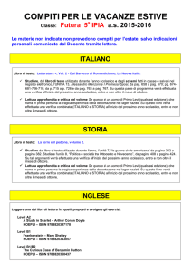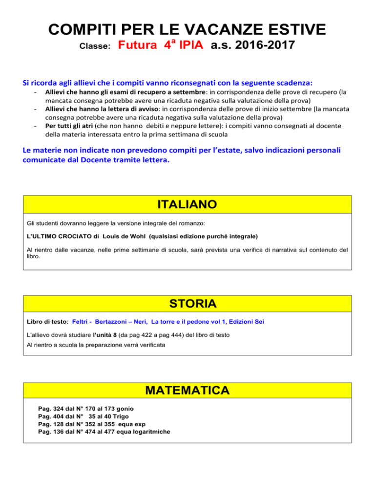 COMPITI PER LE VACANZE ESTIVE Classe: Futura 4a IPIA a.s. 2016-2017 Si ricorda agli allievi che i compiti vanno riconsegnati con la seguente scadenza: - Allievi che hanno gli esami di recupero a settembre: in corrispondenza delle prove di recupero (la mancata consegna potrebbe avere una ricaduta negativa sulla valutazione della prova) Allievi che hanno la lettera di avviso: in corrispondenza delle prove di inizio settembre (la mancata consegna potrebbe avere una ricaduta negativa sulla valutazione della prova) Per tutti gli atri (che non hanno debiti e neppure lettere): i compiti vanno consegnati al docente della materia interessata entro la prima settimana di scuola Le materie non indicate non prevedono compiti per l’estate, salvo indicazioni personali comunicate dal Docente tramite lettera. ITALIANO Gli studenti dovranno leggere la versione integrale del romanzo: L’ULTIMO CROCIATO di Louis de Wohl (qualsiasi edizione purché integrale) Al rientro dalle vacanze, nelle prime settimane di scuola, sarà prevista una verifica di narrativa sul contenuto del libro. STORIA Libro di testo: Feltri - Bertazzoni – Neri, La torre e il pedone vol 1, Edizioni Sei L’allievo dovrà studiare l’unità 8 (da pag 422 a pag 444) del libro di testo Al rientro a scuola la preparazione verrà verificata MATEMATICA Pag. 324 dal N° 170 al 173 gonio Pag. 404 dal N° 35 al 40 Trigo Pag. 128 dal N° 352 al 355 equa exp Pag. 136 dal N° 474 al 477 equa logaritmiche INGLESE Libro di testo: un libro di lettura a scelta tra quelli proposti Gli allievi dovranno scegliere uno dei libri di lettura fra i tre proposti. I testi si differenziano per difficoltà: livello A2, il più semplice, A2/B1, livello pre-intermedio e B1, livello intermedio. E’ obbligatorio svolgere gli esercizi di comprensione proposti nel testo. Al rientro dalle vacanze verrà sottoposta agli studenti una prova per valutare la comprensione del testo. Level A2 The Hound of the Baskerville – Arthur Conan Doyle HOEPLI – ISBN 9788820343071 Level A2/B1 The Canterville Ghost – Oscar Wilde HOEPLI – ISBN 9788820350406 Level B1 Frankenstein – Mary Shelley HOEPLI – ISBN 9788820343057 TMA: TECNOLOGIE MECCANICHE e APPLICAZIONI Libro di testo: Pasquinelli – “Tecnologie Meccaniche e Applicazioni” – Ed. Cappelli – Vol. 1° e 2° Dispensa “Cicli di lavorazione alle Macchine Utensili tradizionali” Dispensa “C.N.C. ISO Tornio” Ripassare i concetti base dei Cicli di lavorazione alle Macchine Utensili tradizionali riportati sull’apposita dispensa; Riguardare i cicli di lavorazione redatti in classe nel corso dell’anno scolastico: tutti i dubbi relativi ai disegni, alla scelta degli utensili, attrezzi, strumenti di misura, parametri di taglio e calcolo dei tempi di passata e di fase, vanno scritti su un foglio a parte e saranno argomento di discussione e chiarimento nelle prime lezioni del prossimo anno scolastico; Ripassare, sul libro di testo, i principali concetti relativi ai materiali usati nel settore meccanico ed ai trattamenti termici come riportato sulla fotocopia del “programma svolto” consegnata in classe dal docente; Ripassare i concetti base del CNC ISO Tornio riportati sull’apposita dispensa; Riguardare gli esercizi di CNC ISO Tornio redatti in classe nel corso dell’anno scolastico: tutti i dubbi relativi ai disegni, alla scelta degli utensili, alla stesura del ciclo, alla stesura del programma, vanno scritti su un foglio a parte e saranno argomento di discussione e chiarimento nelle prime lezioni del prossimo anno scolastico. Riesaminare i concetti base di tolleranza e rugosità nonché di quotatura delle principali lavorazioni meccaniche sulla base dei complessivi e delle tavole di particolare realizzate quest’anno. TEE: TECNOLOGIE ELETTRICO-ELETTRONICHE ed APPLICAZ. Libro di testo: A. Gallotti-A. Rondinelli “Tecnologie elettrico-elettroniche e applicazioni” Vol.1 Hoepli Facendo riferimento al libro di testo Ripassare i seguenti argomenti Unità A1: Richiami di fisica. L’atomo e le sue proprietà elettriche. Conduttori, isolanti, semiconduttori. Unità A2: Grandezze principali dell’ambito elettrico. Differenza di potenziale e corrente elettrica. Energia e potenza elettrica. Campo elettrico. Grandezze fondamentali in corrente alternata. Unità A3: Componenti elettrici. Generatori. Resistenza e resistori. Unità B: Il circuito elettrico. Collegamento tra componenti. Generatori reali. Unità B2: Metodi per la risoluzione dei circuiti. Partitore di tensione e di corrente. Leggi di Kirchhoff. Metodo di Milmann. Svolgere i seguenti esercizi Pag.44 es.A1, A2, A3; pag. 90 es.B1 b - B2 a,b,d,e; pag.91 es.B3 a,b,c; pag. 93 es. B10 a,c. TIM: TECNOLOGIE E TECNICHE DI INSTALLAZIONE E DI MANUTENZIONE Libro di testo: Pilone S. “Tecnologie e Tecniche di Installazione e di Manutenzione” 1 HOEPLI Ripassare i principali argomenti svolti quest’anno: Grandezze fisiche e pneumatiche, unità di misura ed equivalenze. Leggi dei Gas Perfetti Caratteristiche e proprietà dell’aria compressa. Gruppo FRL Nomenclatura e linguaggio tecnico specifico: cilindri, valvole distributrici, valvole ausiliarie. Lettura e interpretazione circuiti pneumatici. Algebra Booleana e funzioni logiche. Sequenze pneumatiche. Segnali bloccanti e tecnica dei collegamenti. Risolvere le seguenti sequenze pneumatiche (realizza: diagramma di fase, analisi e definizione dei segnali, circuito completo) A-B-C+A+B+CA-B-C-B+C+A+ A+B-C+A-C-B+ A+B+C-B-A-C+