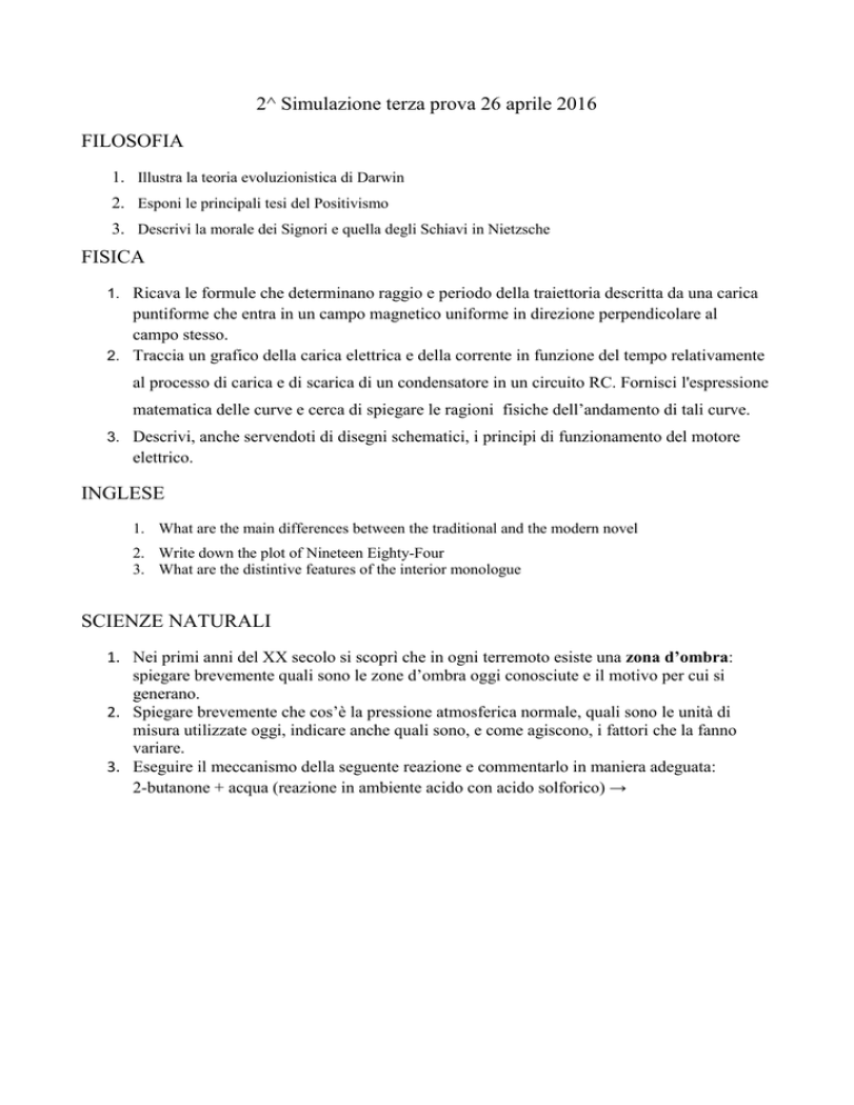 2^ Simulazione terza prova 26 aprile 2016 FILOSOFIA 1. Illustra la teoria evoluzionistica di Darwin 2. Esponi le principali tesi del Positivismo 3. Descrivi la morale dei Signori e quella degli Schiavi in Nietzsche FISICA 1. Ricava le formule che determinano raggio e periodo della traiettoria descritta da una carica puntiforme che entra in un campo magnetico uniforme in direzione perpendicolare al campo stesso. 2. Traccia un grafico della carica elettrica e della corrente in funzione del tempo relativamente al processo di carica e di scarica di un condensatore in un circuito RC. Fornisci l'espressione matematica delle curve e cerca di spiegare le ragioni fisiche dell’andamento di tali curve. 3. Descrivi, anche servendoti di disegni schematici, i principi di funzionamento del motore elettrico. INGLESE 1. What are the main differences between the traditional and the modern novel 2. Write down the plot of Nineteen Eighty-Four 3. What are the distintive features of the interior monologue SCIENZE NATURALI 1. Nei primi anni del XX secolo si scoprì che in ogni terremoto esiste una zona d’ombra: spiegare brevemente quali sono le zone d’ombra oggi conosciute e il motivo per cui si generano. 2. Spiegare brevemente che cos’è la pressione atmosferica normale, quali sono le unità di misura utilizzate oggi, indicare anche quali sono, e come agiscono, i fattori che la fanno variare. 3. Eseguire il meccanismo della seguente reazione e commentarlo in maniera adeguata: 2-butanone + acqua (reazione in ambiente acido con acido solforico) →