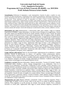 Università degli Studi del Sannio C.d.L. Ingegneria Energetica Programma del Corso di Fisica Generale (B) (86405) - a.a. 2013/2014 Proff. Stefania Petracca/Arturo Stabile Oscillatori Somma di moti armonici semplici sullo stesso asse. Moto oscillatore armonico smorzato. Moto oscillatore armonico smorzato forzato. Fenomeno della risonanza. Elettrostatica nel vuoto Quantizzazione e conservazione della carica elettrica. Legge di Coulomb. Esperimento di Millikan. Campo elettrostatico e sue linee di forza. Principio di sovrapposizione. Calcolo del campo elettrico per distribuzioni discrete di cariche elettriche. Densità di carica. Calcolo del campo elettrico prodotto da densità di carica in particolari configurazioni (filo di lunghezza finita ed infinita, disco carico con densità superficiale costante e dipendente dal punto, sovrapposizione di distribuzioni di carica di segno opposto). Applicazioni della legge di Coulomb sul moto di particelle cariche (pendolo, oscillatore armonico). Natura conservativa del campo elettrostatico. Potenziale elettrostatico. Superfici equipotenziali. Energia potenziale di un sistema di cariche. Dipolo elettrico. Azione meccanica ed energia potenziale di un dipolo. Legge di Gauss. Applicazione della legge di Gauss a varie configurazioni di densità di carica elettrica (costante e dipendente dal punto) con simmetria rettangolare, cilindrica e sferica. Densità di energia del campo elettrostatico. Teorema della divergenza (dimostrazione) e della circuitazione (solo enunciato). Prima e seconda equazione di Maxwell in forma integrale e differenziale. Equazione di Poisson per il potenziale elettrostatico. Calcolo del gradiente, divergenza, rotore e laplaciano. Campo elettrico nella materia Punto di vista microscopico: polarizzazione di un dielettrico e costante dielettrica. Densità di polarizzazione di volume e di superficie. Vettore polarizzazione elettrica. Vettore induzione elettrica e modifica della prima equazione di Maxwell. Legge di Gauss in un dielettrico omogeneo ed isotropo. Energia elettrostatica nei dielettrici. Condizioni di raccordo del campo elettrico nel passaggio tra due materiali dielettrici diversi. Conduttori e correnti Induzione elettrostatica. Schermo elettrostatico. Teorema di Coulomb. Capacità. Condensatore piano, cilindrico e sferico. Energia immagazzinata in un condensatore. Forza tra le armature di un condensatore. Oscilloscopio. Condensatori in serie e parallelo. Azione meccanica su un dielettrico in un condensatore. Intensità e densità di corrente. Equazione di continuità in regime stazionario. Modello microscopico della conduzione elettrica nei solidi. Prima e seconda legge di Ohm. Resistenza e resistività di un conduttore. Potenza associata ad una corrente. Legge di Joule. Resistenze in serie ed in parallelo. Concetto di nodo e di maglia in un circuito elettrico. Prima e seconda legge di Kirchhoff. Forza elettromotrice e generatore elettrico. Concetto di batteria. Fenomeno di carica e scarica di un condensatore. Analisi dinamica del circuito RC ed equivalenza con il moto di un corpo in un mezzo viscoso. Magnetostatica nel vuoto Magneti artificiali e permanenti. Forza di Lorentz: campo di induzione magnetica. Moto di una carica in un campo di induzione magnetica uniforme. Forza magnetica su un filo percorso da corrente. Forza tra due correnti. Forze e momenti meccanici su circuiti piani. Applicazione della legge di Lorentz (bilancia magnetica, acceleratori di particelle, ciclotrone e betatrone). Formula di Laplace. Campo di induzione magnetica prodotto da correnti costanti in particolari configurazioni di circuito (filo di lunghezza finita ed infinita, spira circolare e rettangolare, disco uniformemente carico in rotazione, solenoide rettilineo di lunghezza finita ed infinita, solenoide toroidale). Legge di Ampere. Applicazione della legge di Ampere a varie configurazioni di densità di corrente elettrica (costante e dipendente dal punto). Campo d’induzione magnetica generato da una spira: il dipolo magnetico. Teorema di equivalenza di Ampere. Densità di energia del campo d’induzione magnetica. Il potenziale vettore. Terza e quarta equazione di Maxwell in forma integrale e differenziale. Equazione di Poisson per il potenziale vettore. Proprietà magnetiche della materia Punto di vista microscopico: magnetizzazione di un materiale. Vettore di magnetizzazione. Concetto di campo magnetico e modifica della quarta equazione di Maxwell. Cenni sui materiali paramagnetici, diamagnetici e ferromagnetici. Permeabilità e suscettività magnetica. Azione meccanica su un materiale magnetico in un solenoide rettilineo. Ciclo di isteresi. Regime dinamico Legge di Faraday-Neumann dell’induzione elettromagnetica. Modifica dell’equazione di continuità in regime dinamico. Sbarra conduttrice in moto in un campo di induzione magnetica uniforme. Circuito in moto in un campo di induzione magnetica uniforme. Spire in un campo di induzione magnetica variabile. Applicazione della legge di Faraday-Newman (trasformatore di tensione, dinamo). Coefficiente di autoinduzione in un circuito e di mutua induzione tra due circuiti. Calcolo del coefficiente di autoinduzione e di mutua induzione per particolari configurazione di circuiti (spira circolare e rettangolare, solenoide rettilineo e toroidale). Corrente di spostamento. Circuito LC ed RLC. Analogia meccanica dei circuiti elettrici. Modifica delle equazioni di Maxwell in regime dinamico. Proprietà generali delle onde elettromagnetiche. Gauge di Coulomb. Deduzione equazione e soluzione dell’onda piana. Riferimenti bibliografici R. A. Serway, J. W. Jewett Jr. G. Cantatore, L. Vitale C. Mencuccini, V. Silvestrini P. Mazzoldi, M. Nigro, C. Voci R. Resnik, D. Halley, K. Krane P. Mazzoldi, M. Nigro, C. Voci C. Kittel, W. D. Knight, M. A. Ruderman P. A. Tipler, G. Mosca R. P. Feynman L. Lovitch, S. Rosati E. Amaldi, R. Bizzarri, G. Pizzella M. Nigro, C. Voci L. Lovitch, S. Rosati S. Focardi Fisica per s