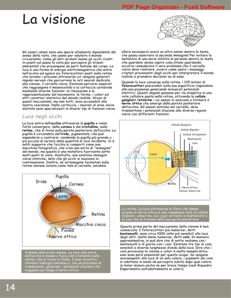 PDF Page Organizer - Foxit Software La visione Gli esseri umani sono una specie altamente dipendente dal senso della vista, che usano per valutare il mondo circostante. Come gli altri primati hanno gli occhi rivolti in avanti ed usano la vista per percepire gli stimoli ambientali che provengono da parti lontane dal corpo. La luce è una forma di energia elettromagnetica che entra nell’occhio ed agisce sui fotorecettori posti sulla retina che avviano i processi attraverso cui vengono generati impulsi nervosi che percorrono le reti neurali dedicate alla visione, il cervello visivo. Esistono percorsi separati che raggiungono il mesencefalo e la corteccia cerebrale mediando diverse funzioni: la rilevazione e la rappresentazione del movimento, le forme, i colori ed altri caratteri distintivi del mondo visibile. Alcuni di questi meccanismi, ma non tutti, sono accessibili alla nostra coscienza. Nella corteccia, i neuroni di aree visive distinte sono specializzati in diversi tipi di funzioni visive. Luce negli occhi La luce entra nell’occhio attraverso la pupilla e viene fatta convergere, dalla cornea e dal cristallino, sulla retina, che si trova sulla parete posteriore dell’occhio. La pupilla è circondata dall’iride, pigmentata, che può espandersi o contrarsi, rendendo la pupilla più grande o più piccola al variare della quantità di luce incidente. Si è soliti supporre che l’occhio si comporti come una macchina fotografica, che crea una sorta di “immagine” del mondo, ma questa è una metafora fuorviante sotto molti punti di vista. Anzitutto, non esistono immagini visive statiche, dato che gli occhi si muovono in continuazione. Inoltre, se un’immagine formatasi sulla retina venisse inviata come tale al cervello, sarebbe allora necessario avere un altro omino dentro la testa, che possa osservare la seconda immagine! Per evitare la metafora di una serie infinita di persone dentro la testa che guardano senza capire cosa stiano guardando, occorre considerare il vero problema che il cervello visivo deve risolvere, ovvero come usare i messaggi criptati provenienti dagli occhi per interpretare il mondo visibile e prendere decisioni su di esso. Quando la luce converge sulla retina, i 125 milioni di fotorecettori posizionati sulla sua superficie rispondono alla sua presenza generando minuscoli potenziali elettrici. Questi segnali passano per via sinaptica in una rete cellulare posta nella retina, attivando le cellule gangliari retiniche i cui assoni si uniscono a formare il nervo ottico che emerge dalla parete posteriore dell’occhio. Gli assoni entrano nel cervello, dove trasmettono i potenziali d’azione alle diverse regioni visive con differenti funzioni. Cellule Gangliari Cellule Bipolari Cellule Orizzontali Bastoncelli Coni Luce Pupilla Iride Cornea Retina Nervo ottico Cellule Amacrine Lente Retina Macchia cieca Fovea Nervo ottico Schema dell’occhio umano. La luce che entra nell’occhio è messa a fuoco dal cristallino sulla retina, che si trova in fondo. I suoi recettori rilevano l’energia luminosa e, con un processo di trasduzione, generano i potenziali d’azione che viaggiano poi lungo il nervo ottico. 14 La retina. La luce attraversa le fibre che danno origine al nervo ottico e una complessa rete di cellule (bipolari, amacrine, ecc.) per arrivare ai bastoncelli e ai coni che si trovano nella sua parte posteriore Questa prima parte del meccanismo della visione è ben conosciuta. I fotorecettori più numerosi, detti bastoncelli, sono circa 1000 volte più sensibili alla luce degli altri, molto meno numerosi, detti coni. In maniera approssimativa, si può dire che di notte vediamo con i bastoncelli e di giorno con i coni. Esistono tre tipi di coni, sensibili a diverse lunghezze d’onda della luce. Dire che i coni provocano la visione a colori è molto semplicistico, essi sono però essenziali per questo scopo. Se vengono sovraesposti alla luce di un solo colore, i pigmenti dei coni si adattano in modo da percepire subito dopo quel colore in minor misura anche se per breve tempo (vedi Riquadro Esperimento sull’adattamento ai colori). PDF Page Organizer - Foxit Software Negli ultimi 25 anni, si sono fatte importanti scoperte sul processo di fototrasduzione (la conversione della luce in segnali elettrici nei bastoncelli e nei coni), sulle basi genetiche della cecità ad alcuni colori (dovuta alla mancanza di alcuni pigmenti), sul funzionamento delle connessioni retiniche e sulla presenza di due diversi tipi di cellule gangliari. Circa il 90% di queste cellule sono molto piccole, mentre un altro 5% è costituito da cellule più grandi, dette di tipo M, o magnocellulari. Vedremo in seguito come le anomalie nelle cellule di tipo M possano essere all’origine di alcune casi di dislessia (Capitolo 9). Un esperimento sull’adattamento ai colori Fissa lo sguardo sulla piccola croce che si trova in mezzo ai due cerchi più grandi, per almeno 30 secondi. Poi trasferisci lo sguardo sulla croce più in basso. I due cerchi “gialli” sembreranno di colori diversi. Sai spiegartelo? Campo visivo sinistra destra nervo ottico chiasma ottico nucleo genicolato laterale vie dirette alla corteccia corteccia visiva Le vie nervose che dall’occhio conducono al cervello. Le sue cellule sono organizzate in colonne. Un concetto importante circa la capacità reattiva delle cellule è quello di campo recettivo: la porzione di retina in cui le cellule rispondono ad un tipo specifico di immagine. In V1, dove avviene il primo stadio dell’elaborazione corticale, i neuroni rispondono meglio alla visione di linee o margini con un particolare orientamento. È stato scoperto che tutti i neuroni che compongono ogni singola colonna rispondono maggiormente a linee o margini con un specifico orientamento, mentre la colonna adiacente risponde meglio a linee o margini con un orientamento leggermente diverso dal precedente, e così via in tutta la superficie di V1. Questo significa che le cellule della 