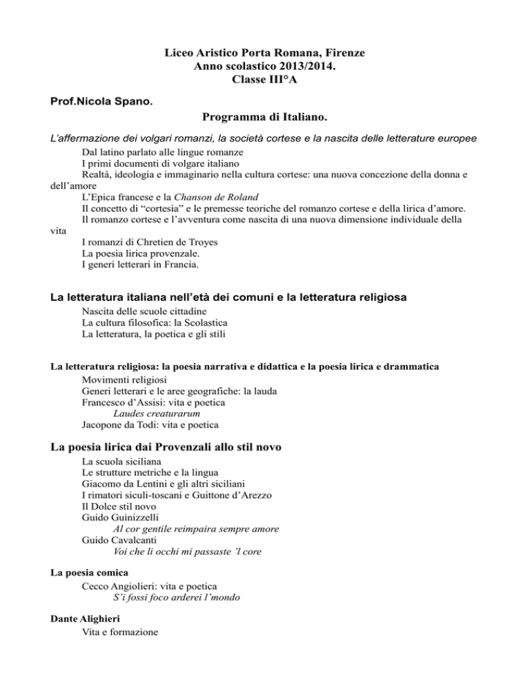 Liceo Aristico Porta Romana, Firenze Anno scolastico 2013/2014. Classe III°A Prof.Nicola Spano. Programma di Italiano. L’affermazione dei volgari romanzi, la società cortese e la nascita delle letterature europee Dal latino parlato alle lingue romanze I primi documenti di volgare italiano Realtà, ideologia e immaginario nella cultura cortese: una nuova concezione della donna e dell’amore L’Epica francese e la Chanson de Roland Il concetto di “cortesia” e le premesse teoriche del romanzo cortese e della lirica d’amore. Il romanzo cortese e l’avventura come nascita di una nuova dimensione individuale della vita I romanzi di Chretien de Troyes La poesia lirica provenzale. I generi letterari in Francia. La letteratura italiana nell’età dei comuni e la letteratura religiosa Nascita delle scuole cittadine La cultura filosofica: la Scolastica La letteratura, la poetica e gli stili La letteratura religiosa: la poesia narrativa e didattica e la poesia lirica e drammatica Movimenti religiosi Generi letterari e le aree geografiche: la lauda Francesco d’Assisi: vita e poetica Laudes creaturarum Jacopone da Todi: vita e poetica La poesia lirica dai Provenzali allo stil novo La scuola siciliana Le strutture metriche e la lingua Giacomo da Lentini e gli altri siciliani I rimatori siculi-toscani e Guittone d’Arezzo Il Dolce stil novo Guido Guinizzelli Al cor gentile reimpaira sempre amore Guido Cavalcanti Voi che li occhi mi passaste ’l core La poesia comica Cecco Angiolieri: vita e poetica S’i fossi foco arderei l’mondo Dante Alighieri Vita e formazione La Vita nuova, tema, struttura , metrica, capitoli: Il primo incontro con Beatrice La donna – schermo Il saluto di Beatrice La lode di Batrice Le Rime Guido, io vorrei che tu e Lapo ed io Il Convivio La Commedia Medioevo e rinnovamento umanistico L’organizzazione della cultura: università, corti, cenacoli La trasformazione degli intellettuali Giovanni Boccaccio. Vita e poetica. Le opere del periodo napoletano Commedia delle ninfe fiorentine Elegia di Donna Fiammetta Il Decameron Contenuti e struttura generale Il proemio e l’introduzione alla prima giornata Le novelle della prima giornata: la novella di Ciappelletto Le novelle della seconda giornata: Andreuccio da Perugina. Le novelle della terza giornata: lo stalliere di re Agilulfo Le novelle della quarta giornata: Ghismunda e Tancredi e Elisabetta da Messina. Le novelle della quinta giornata: Nastagio degli Onesti Le novelle della sesta giornata: Chichibio e la gru Le novelle della settima giornata: Arriguccio geloso Novelle della Ottava giornata: Calandrino e l’elitropia Novelle della nona giornata: la Badessa e le brache Novella della decima giornata: Griselda Petrarca La vita e le opere. L’Epistolario. Il Canzoniere: linguaggio, struttura, contenuti e poetica: Sonetto premiale: Voi ch’ascoltate in rime sparse il suono Era il giorno ch’al sol si scoloraro Chiare, fresche et dolci acque Pace non trovo, et non ò da far guerra I Trionfi La civiltà Umanistico-rinascimentale. I concetti, i tempi e i luoghi. Il letterato, il cortigiano e il chierico; l’organizzazione della cultura. La letteratura umanistica nell’età di Lorenzo il Magnifico. Macchiavelli Vita e opere. Il pensiero. Lettera a Francesco Vettori Il Principe: composizione, struttura e contenuti. Lettera dedicatoria Sesto capitolo il ruolo della violenza storica Il settimo capitolo: Cesare Borgia Il nono capitolo: la strategia del consenso La Mandragola. Durante il corso sono stati frequenti i riferimenti alla tipologia espositiva in forma di “saggio breve” e di “analisi del testo”. Dante Alighieri, La Divina Commedia. L’Inferno: lettura e commento dei seguenti canti: I, III, IV, V, VI, X, XIII Testo utilizzato: M. Santagata, L. Carotti, A. Casadei, M. Tavoni, I tre libri della letteratura. Origini Seicento, vol. I°, ed. Laterza. Studenti Prof. Nicola Spano. Liceo Artistico Porta Romana, Firenze Anno scolastico 2013/2014. Classe III°A Prof.Nicola Spano. Programma di Storia IL Feudalesimo Il sistema feudale negli stati normanni La nascita della cavalleria L’origine dei comuni dell’Italia centro settentrionale Federico Barbarossa La lotta per le investiture Innocenzo III Federico II di Svezia L'Occidente nel tardo Medioevo L'Europa Medievale La cultura dei mercanti e del banchiere Il potere pontificio Il potere monarchico Il villaggio e la città medioevale Declino del potere imperiale La monarchia francese Il papato ad Avignone La monarchia inglese Il regno di Sicilia La grande peste La crisi del '300 Le rivolte dei contadini La rivolta dei Ciompi La guerra dei Cent'anni Il ducato di Borgogna L'ascesa della monarchia francese La guerra delle due Rose La debolezza dell'Impero La Chiesa dopo il papato avignonese Nascita delle signorie Il ducato di Milano La repubblica fiorentina La repubblica di Venezia I regni di Napoli e Sicilia Le guerre italiane L'impero Ottomano La caduta dell'impero Bizantino L'era delle scoperte e le civiltà precolombiane Gli imperi coloniali La dottrina luterana La riforma in Italia Il concilio di Trento La fine dell'equilibrio Francia e Spagna alla conquista dell'Italia L'ascesa di Carlo V Il sacco di Roma La dissoluzione dell'Impero Testo in adozione: G. De Luna, M. Meriggi, Il segno della storia. Dall’XI secolo alla età del Seicento, vol. I°, Ed. Paravia. Studenti. Prof. Nicola Spano. LICEO ARTISTICO ISTITUTO STATALE D’ARTE di Porta Romana PROGRAMMA FINALE a.s. 2013/2014 Materia di insegnamento: CHIMICA Docente: MONICA FAUSTI Classe: 3° sez. A TRASFORMAZIONI CHIMICHE, LA QUANTITÀ CHIMICA - Sostanze pure, elementi e composti; teoria atomica di Dalton; simbologia chimica e significato delle formule. Simboli degli elementi. - La massa atomica relativa, la massa molecolare. - La mole e calcoli relativi. LE PARTICELLE DELL’ATOMO - La natura elettrica della materia; la scoperta dell’elettrone e le altre particelle subatomiche; esperienza di Ruther
