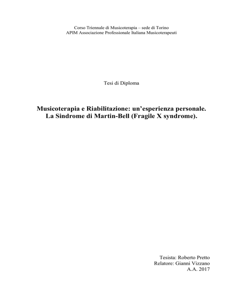 Corso Triennale di Musicoterapia – sede di Torino APIM Associazione Professionale Italiana Musicoterapeuti Tesi di Diploma Musicoterapia e Riabilitazione: un’esperienza personale. La Sindrome di Martin-Bell (Fragile X syndrome). Tesista: Roberto Pretto Relatore: Gianni Vizzano A.A. 2017 La musica può proporci quindi un mondo ideale, armoniosamente definito, ma può altresì raffigurare il conflitto, la tensione senza offricene una risoluzione; la musica può indicarci un divenire, un’idea di progresso e di evoluzione, ma può anche proporci la fissità, la rigidità della ripetizione fine a sé stessa, priva di direzione, introduzione ad un mondo congelato, coartato; la musica può introdurci nell’evolversi di un dramma, può rappresentare un evento tragico che nel suo acme catarticamente si risolve e si acquieta ma anche la lenta agonia verso una fine preannunciata ma mai raggiunta; la musica può porsi come pura costruzione formale quasi a metafora di un pensiero incontaminato da aspetti emotivi ma può dar voci quasi concretamente al corpo e al caos delle pulsioni, la musica può consolare nostalgicamente l’assenza dell’oggetto amato ma può altresì farcene sentire l’irrimediabile perdita, può essere profondamente anticonsolatoria e farci intravedere il nulla1. A. Guzzoni L’ascolto in musicoterapia in Manuale di Musicoterapia di G. Manarolo, Edizioni Cosmopolis, Torino, 2006, pag 286. 1 Indice Introduzione ......................................................................................................................p. 1. Musicoterapia e riabilitazione: considerazioni generali ...................................p. 1.1 Alcuni accenni storici: il panorama estero ........................................................p. 1.1.1 Il panorama italiano ..............................................................................p. 1.2 Presupposti teorici-metodologici della musicoterapia ......................................p. 1.3 Premesse scientifiche ........................................................................................p. 1.4 I modelli della musicoterapia ............................................................................p. 1.5 Gli ambiti applicativi della musicoterapia ........................................................p. 1.5.1 L’ambito riabilitativo ............................................................................p. 1.6 Musicoterapia nella riabilitazione dei disturbi psicofisici dell’età evolutiva: lo stato dell’arte in Italia ..................................................................p. 1.6.1 Lo stato dell’arte all’estero ...................................................................p. 1 2 2 4 5 6 8 12 13 16 17 2. La sindrome Martin-Bell (X Fragile Syndrome) ...............................................p. 2.1 Aspetti generali .................................................................................................p. 2.1.1 Le caratteristiche psichiche e comportamentali ....................................p. 2.1.2 Il profilo cognitivo ................................................................................p. 2.1.3 Il linguaggio .......................................................................................... p. 2.1.4 Le caratteristiche fisiche ........................................................................p. 2.1.5 Le caratteristiche sensoriali ...................................................................p. 2.2 Considerazioni educative ..................................................................................p. 19 19 20 21 22 22 23 23 3. Presentazione del caso .......................................................................................... p. 3.1 Il caso: A. ...........................................................................................................p. 3.1.1 L’ambiente famigliare ..........................................................................p. 3.1.2 Il Gruppo Appartamento .......................................................................p. 3.2 Le osservazioni mirate ......................................................................................p. 3.3 L’anamnesi sonoro musicale ............................................................................p. 3.3.1 Il questionario .......................................................................................p. 3.3.2 Le sedute osservative ............................................................................p. 3.3.3 La seduta di ascolto delle musiche del cuore .......................................p. 3.3.4 La seduta di manipolazione libera ........................................................p. 3.3.5 La seduta con il musicoterapista ........................................................... p. 25 25 26 27 28 30 30 34 34 39 42 4. Il progetto di intervento .......................................................................................p. 45 4.1 La fase ermeneutica .......................................................................................... p. 45 4.2 Gli obiettivi .......................................................................................................p. 48 5. L’intervento: le sedute ......................................................................................... p. 50 6. La valutazione dell’intervento .............................................................................p. 72 7. Valutazione personale del percorso ....................................................................p. 77 Bibliografia ............................................................................................................p. 79 Sitografia ...............................................................................................................p. 81 Appendice: Una prospettiva neuroscientifica sulla musicoterapia, di Stefan Koelsch ....................................................................