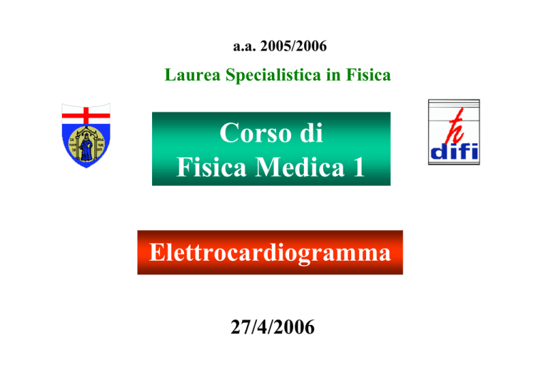a.a. 2005/2006 Laurea Specialistica in Fisica Corso di Fisica Medica 1 Elettrocardiogramma 27/4/2006 Cos’è? L’elettrocardiogramma è la registrazione grafica dell’attività elettrica cardiaca Il cuore, durante il suo funzionamento, produce un campo elettrico che può essere facilmente registrato sulla periferia del corpo umano (pelle) L’insorgere e il procedere dell’eccitamento nel miocardio sono caratterizzati dallo stabilirsi, alla superficie membranale delle fibrocellule di differenze di potenziale tra le zone in attività e quelle in riposo Perché? Dal punto di vista elettrico il cuore si comporta come un unico “generatore” elettrico di polarità variabile in relazione ai diversi momenti del suo ciclo di attività Generatore di rilevante potenza, per l’estensione delle porzioni miocardiche, che assumono potenziale elettrico di volta in volta diverso Ne consegue che il cuore è sorgente di correnti elettriche così intense da raggiungere, fluendo nei tessuti, anche la superficie del corpo Come funziona? Ponendo allora due elettrodi metallici (elettrodi derivanti) a contatto della pelle ad una certa distanza tra di loro si possono raccogliere differenze di potenziale proporzionali a quelle correnti di origine cardiaca, che fluiscono nei tessuti superficiali interposti tra i due elettrodi derivanti Queste differenze di potenziale, opportunamente amplificate e registrate, costituiscono l’ECG (elettrocardiogramma) Gli albori Il tracciato elettrocardiografico è stato studiato in modo approfondito per la prima volta da Einthoven (premio Nobel nel 1925) egli realizzò anche il primo strumento atto alla sua registrazione: il galvanometro a corda Attualmente è sostituito dall’elettrocardiografo, strumento nel quale i segnali provenienti dagli elettrodi vengono amplificati (circa 104 volte) e poi registrati graficamente con un dispositivo a penna (scrive su un nastro di carta che scorre con velocità convenzionalmente stabilita di 25 mm/s) Onde elettromagnetiche L’elettrocardiogramma è un tracciato complesso, non direttamente comparabile con il semplice potenziale d’azione delle fibrocellule cardiache Si tratta di una misura del campo di correnti elettriche che il cuore induce nei tessuti a maggiore o minore distanza da esso Quindi sia la polarità che l’ampiezza del segnale raccolto dagli elettrodi nei successivi istanti della rivoluzione cardiaca saranno diverse a seconda della posizione e della distanza che essi hanno dal cuore Tracciato elettrocardiografico Costituito da una successione di onde di diversa ampiezza (∼ qualche mV) e di segno diverso contrassegnate con le lettere dell’alfabeto P, Q, R, S, T Spiegazione del tracciato L’ECG comincia con un’onda P di piccola ampiezza, che accompagna la sistole atriale ed è la manifestazione elettrica dell’attivazione della muscolatura atriale All’onda P segue un breve tratto isoelettrico (nel quale non si misurano evidenti differenze di potenziale), che corrisponde al passaggio dell’eccitamento dagli atri ai ventricoli quindi inizia il complesso ventricolare dell’ECG, costituito dalle onde Q, R, S, T, che accompagnano l’attività dei ventricoli Sistole atriale Nel tratto isoelettrico le zone attive del cuore sono limitate al sistema di conduzione atrioventricolare (nodo AV e fascio di His) mancanza di evidenti differenze di potenziale in questo periodo del tracciato (poco tessuto attivo!) La durata dell’intero intervallo P-R ha notevole significato: una buona misura del tempo di conduzione atrio-ventricolare di norma compreso tra 0.12 e 0.20 s ed è maggiore solo se la conduzione nel nodo atrio-ventricolare o nel fascio di His è rallentata Complesso ventricolare Tre onde ampie e di breve durata (Q, R, S) fase di invasione dei due ventricoli • onda Q: attivazione del setto interventricolare • onde R e S: completamento dell’attivazione un’onda lenta (T) fine dell’eccitamento ventricolare (onda ripolarizzazione) Tra il complesso QRS e l’onda T vi è un lungo tratto, approssimativamente isoelettrico corrispondente al periodo in cui tutto il miocardio ventricolare si trova in stato di attività Tracciato elettrocardiografico Si osservano onde di elevata ampiezza solo quando sono presenti simultaneamente nel cuore ampie zone attive (negative) ed ampie zone in riposo (positive) elevata ampiezza del complesso QRS (invasione dei ventricoli) e dell’onda T (fine dell’attivazione) nel tratto S-T non si registrano variazioni di potenziale perché tutto il miocardio ventricolare è in attività (e quindi isoelettrico) Riflessione della durata del plateau nel potenziale d’azione di fibrocellule miocardiche ventricolari Modello chimico-fisico Il cuore si trova immerso nel torace, struttura costituita da altri tessuti in un ambiente liquido con sali disciolti in esso Il torace può essere considerato come una sorta di vasca elettrolitica che contiene il cuore, che periodicamente manifesta d.d.p sulla sua superficie (pila elettrica immersa in una vasca di acqua e sale) Simulazione: una vasca piena di acqua salata con una concentrazione di sale (NaCl) allo 0.9% con immesa una pila stilo da 1.5 V sospesa mediante un filo isolante al centro della vasca Leggi fisiche Principio della conservazione di carica tutta la carica che entra nel volumetto è esattamente uguale a quella che ne esce nello stesso tempo ⎡ ∂j x ∂j x ⎞⎤ ⎛ ⎢( j x ) − ⎜ j x + ∂x dx ⎟⎥ dydz = ∂x dτ ⎝ ⎠⎦ ⎣ jx densità di corrente entrante nella faccia x ∂j x jx + dx ∂x densità di corrente uscente da x+dx e la legge di Ohm