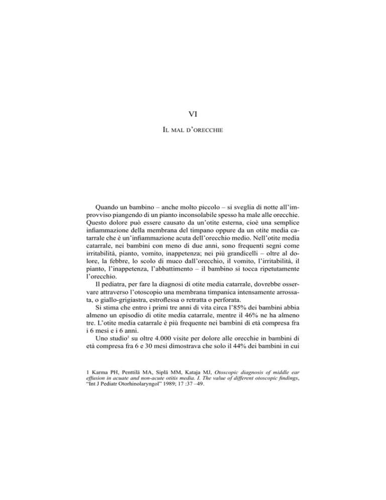 VI Il mal d’orecchie Quando un bambino – anche molto piccolo – si sveglia di notte all’improvviso piangendo di un pianto inconsolabile spesso ha male alle orecchie. Questo dolore può essere causato da un’otite esterna, cioè una semplice infiammazione della membrana del timpano oppure da un otite media catarrale che è un’infiammazione acuta dell’orecchio medio. Nell’otite media catarrale, nei bambini con meno di due anni, sono frequenti segni come irritabilità, pianto, vomito, inappetenza; nei più grandicelli – oltre al dolore, la febbre, lo scolo di muco dall’orecchio, il vomito, l’irritabilità, il pianto, l’inappetenza, l’abbattimento – il bambino si tocca ripetutamente l’orecchio. Il pediatra, per fare la diagnosi di otite media catarrale, dovrebbe osservare attraverso l’otoscopio una membrana timpanica intensamente arrossata, o giallo-grigiastra, estroflessa o retratta o perforata. Si stima che entro i primi tre anni di vita circa l’85% dei bambini abbia almeno un episodio di otite media catarrale, mentre il 46% ne ha almeno tre. L’otite media catarrale è più frequente nei bambini di età compresa fra i 6 mesi e i 6 anni. Uno studio1 su oltre 4.000 visite per dolore alle orecchie in bambini di età compresa fra 6 e 30 mesi dimostrava che solo il 44% dei bambini in cui 1 Karma PH, Penttilä MA, Siplä MM, Kataja MJ, Otoscopic diagnosis of middle ear effusion in acuate and non-acute otitis media. I. The value of different otoscopic findings, “Int J Pediatr Otorhinolaryngol” 1989; 17 :37 –49. 54 Bambini e (troppe) medicine il pediatra aveva avanzato il sospetto diagnostico tramite l’otoscopia, aveva di fatto un’otite media catarrale. Di solito in Italia quando viene fatta questa diagnosi a questi bambini vengono senza indugio prescritti antibiotici, antistaminici, gocce nasali decongestionanti e antidolorifici. Come trattare il mal d’orecchie A partire dall’inizio degli anni ’80 in Olanda, riconoscendo al bambino sano una buona capacità di autoguarigione, si è iniziato a praticare la cosiddetta “strategia di vigile attesa”2, che consiste nel: • non somministrare l’antibiotico per 48-72 ore dal momento della diagnosi; • somministrare solo un antidolorifico (paracetamolo) per il controllo del dolore; • fornire informazioni anche scritte ai genitori o a chi si prende cura del bambino sull’evoluzione e gestione dell’otite media catarrale; • garantire un controllo dopo 48-72 ore; • somministrare l’antibiotico se dopo 48-72 ore i sintomi non si sono risolti o sono peggiorati. Nei bambini con età compresa fra i 6 e i 12 mesi in buone condizioni generali e in tutti i bambini di età superiore all’anno (a meno che non presentino sintomi gravi o scolo dall’orecchio) è consigliabile attendere la reazione del bambino prima di somministrare l’antibiotico, utilizzando la prescrizione solo nel caso in cui i sintomi (dolore e febbre) non migliorino ovvero peggiorino dopo 48-72 ore. Qualora l’antibiotico si renda necessario per la gestione dell’otite media acuta, il farmaco di prima scelta è l’amoxicillina, il più economico e con minor effetti collaterali. Questa strategia3 è stata più volte verificata e si è sempre dimostrata 2 Damoiseaux , Antibiotic treatment for acute otitis media: time to think again, “CMAJ” 2005 March 1; 172(5): 657–658. 3 David M. Spiro, MD, MPH; Khoon-Yen Tay, MD; Donald H. Arnold, MD, MPH; James D. Dziura, PhD; Mark D. Baker, MD; Eugene D. Shapiro, MD, Wait-and-See Prescription for the Treatment of Acute Otitis Media, “JAMA” 2006;296:1235-1241 . 6 - Il mal d’orecchie 55 utile nella gestione dell’otite media catarrale, con tassi di guarigione in assenza di assunzione di antibiotico che variavano dal 62% al 76% in diversi contesti (ambulatorio di pediatria, dipartimento di emergenza, ambulatori universitari). Nei casi trattati con strategia di vigile attesa non si sono riscontrati aumenti di complicanze a breve termine come la mastoidite, né a lungo termine, come la riduzione dell’udito, la difficoltà nello sviluppo del linguaggio e delle relazioni sociali. Esistono poi delle raccomandazioni che i genitori dovrebbero ricevere dal pediatra sin dalla prima visita per prevenire l’insorgenza dell’otite: • allattare al seno per i primi sei mesi in modo esclusivo • non esporre il bambino al fumo di sigaretta • non utilizzare ciucci e/o biberon. Gli interventi preventivi proposti sono attuabili e utili anche per la promozione del benessere generale del bambino e della sua famiglia, ma vengono spesso trascurati dai pediatri che sottovalutano la prevenzione primaria, poco amata anche dalle case produttrici di farmaci e vaccini, le quali preferiscono i trattamenti antibiotici ­– spesso inutili, costosi e/o inappropriati – oppure consigliano a scopo preventivo la vaccinazione antipneumococcica o antinfluenzale, che non risulta apportare alcun sostanziale beneficio nella prevenzione dell’otite media acuta. Nel 40% circa degli episodi di otite media catarrale nell’orecchio medio residua del catarro sterile, che può richiedere anche un mese per riassorbirsi completamente (nel 10% dei casi l’essudato può perdurare fino a tre mesi) e anche in questo caso l’utilizzo di decongestionanti, antistaminici o cortisonici, spesso prescritti singolarmente o in combinazione, ha frequenti effetti collaterali dannosi e nessuna efficacia. Cosa fare Per calmare il mal d’orecchio, riscaldare leggermente qualche goccia d’olio in un cucchiaio o in un pentolino di acciaio e, con l’aiuto di un contagocce lasciar cadere una o due gocce di olio caldo nel condotto uditivo. L’azione antidolorifica è data dal cromo rilasciato dall’acciaio nell’olio sottoposto a riscaldamento. 56 Bambini e (troppe) medicine Tonsille e adenoidi Quando in un bambino le otiti si ripetono più volte nell’anno in assenza di serie complicazioni, invece di tranquillizzare i genitori – 