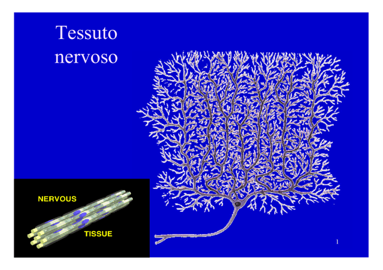 Tessuto nervoso Created by G. Papaccio 1 Il sistema nervoso… • Fornisce informazioni sull’ambiente interno ed esterno • Integra le informazioni sensoriali • Coordina le attività volontarie e involontarie • Regola e controlla le strutture e gli apparati periferici • E’ sede della cognizione, delle emozioni, della memoria, ecc. Created by G. Papaccio 2 Funzioni del Sistema Nervoso • Input sensoriali: Monitora stimoli interni ed esterni (cambiamenti) – Tatto, odore, Suono, Visione, Gusto, pressione sanguigna, temperatura corporea. • Integrazione. Input sensoriali del cervello e dei processi spinali del midollo ed avviamento delle risposte. • Output motori: Controllo dei muscoli e delle ghiandole. • Omeostasi. Regola e coordina la fisiologia. • Attività mentale. Coscienza, pensiero, memoria, emozione. 11-3 Effettori SN somatico SNC Efferenze SN autonomo Muscolo scheletrico Muscolo liscio Muscolo cardiaco Ghiandole integrazione Recettori altri organi Afferenze Created by G. Papaccio ambiente esterno4 Suddivisione anatomica generale • Sistema nervoso centrale (SNC) – Encefalo (racchiuso nella cavità cranica) – Midollo spinale (racchiuso nel canale vertebrale) • Sistema nervoso periferico (SNP) – Tutto il tessuto nervoso al di fuori del SNC (nervi e gangli nervosi) Created by G. Papaccio 5 Created by G. Papaccio 6 Sistema Nervoso Periferico • Fuori dal Sistema Nervoso Centrale • Diviso in – Sensoriale – Motorio • Divisione sensoriale – Utilizza i neuroni sensoriali per trasmettere impulsi nervosi verso il cervello ed il midollo spinale. – Recettori in varie parti del corpo reagiscono agli stimoli (tatto, pressione, calore, luce, tensione) ed innescano un impulso nervoso. • Divisione motoria – Utilizza motoneuroni per trasmettere impulsi nervosi dal cervello e dal midollo spinale. – Stimola gli effettori (muscoli e ghiandole). 11-7 Suddivisione del SNP • Sensoriale (afferente): trasmette impulsi nervosi dai recettori al CNS. • Motorio (efferente): trasmette impulsi nervosi dal CNS agli effettori (muscoli, ghiandole) 11-8 Tipi di Informazioni sensoriali e motorie 11-9 Divisione Sensoriale del PNS • Trasmette impulsi nervosi attraverso i neuroni sensoriali al CNS dai recettori • Recettori sono classificati: – Recettori somatici – quelli che si trovano nella pelle, articolazioni, muscoli scheletrici ed organi di senso. • Rispondono al tatto, pressione, calore, tensione, dolore, luce – Recettori viscerali – localizzati nelle pareti dei visceri • Rispondono all’allungamento, dolore, temperatura, stimoli chimici (CO2) 11-10 Divisione motoria del PNS • Trasmette impulsi dal CNS agli effettori – Effettore – tutti I muscoli o ghiandole • Sistema nervoso somatico: – Regola la contrazione dei muscoli scheletrici. – Sotto il nostro controllo volontario - • Sistema nervoso autonomo (ANS) – Regola la contrazione del muscolo liscio, cardiaco e ghiandole (organi viscerali) – Subconscio o controllo involontario. – Divisione del ANS • Simpatico. Prepara il corpo all’attività fisica. • Parasimpatico. Regola il riposo o le funzioni vegetative, come la digestione del cibo o lo svuotamento della vescica urinaria.. 11-11 Istologia del Tessuto Nervoso • Contiene due tipi di cellule: – Neuroni – specializzati nella conduzione di impulsi elettrici che: • trasportano informazioni da una regione del corpo all’altra • integrano ed elaborano tali informazioni – Nevroglia – Glia o cellule gliali. Cellule “non nervose” • mezzo interno per gli scambi nutritivi e gassosi • sostegno strutturale • attività di riparazione di lesioni • funzione di “isolamento” elettrico • Immunità (microglìa) • La Nevroglia prevale sui neuroni 10 a 1. 12 Embriogenesi del tessuto nervoso Created by G. Papaccio 13 • Caratteristiche speciali: Neuroni – Longevità – possono vivere e funzionare tutta la vita – Non si dividono (amitotici) – I neuroni fetali perdono la loro capacità di subire mitosi le cellule staminali neurali sono rare – Alto tasso metabolico – richiedono abbondante ossigeno e glucosio • Possono essere divisi in grandi regioni: due • Corpo Cellulare • Processi – Dendriti (informazioni in entrata) – Assone (informazioni in uscita) 11-14 parti del neurone dendrite arborizzazione terminale guaina soma o corpo mielinica cellulare nucleo con nucleolo Created by G. Papaccio assone o neurite 15 Parti del Neurone • Corpo Cellulare. Soma o Pirenoforo – Contiene di solito organelli più altre strutture • Corpi di Nissl = sostanza cromatofila = R.E.R.: sito primario di sintesi proteica • Citoscheletro di neurofilamenti e neurotubuli • No centrioli (da qui la sua natura amitotica) – Importante centro di biosintesi – La maggior parte dei corpi cellulari dei neuroni sono • Localizzati nel CNS • Gangli - clusters di corpi cellulari che si trovano lungo i nervi nel PNS – Cono d’emergenza forma l’assone 11-16 Created by G. Papaccio 17 Citoscheletro e zolle di Nissl Impregnazione argentica Created by G. Papaccio Coloranti basici 18 Processi del Neurone • Dendriti. brevi, spesso molto ramificati. – Regioni recettive del neurone • Assone. Lungo processo citoplasmatico in grado di propagare l’impulso nervoso. – Ogni neurone ne ha uno solo – Trasmette l’impulso lontano dal soma – Cono d’emergenza: segmento iniziale – Pochi rami in lunghezza – Più rami a fine assone • Rami terminali (telodendria) – A fine gli assoni terminali (ovvero terminali sinaptici, bulbi, bottoni sinaptici) » Contengono vescicole con neurotrasmettitori (NT) 11-19 Dendriti Assone • Abbondanti ribosomi, reticolo endoplasmico • Superficie punteggiata da “spine” • Più corti e ramificati nei pressi del soma Created by G. Papaccio • Assenza di componenti associate a sintesi proteica • Abbondanti mitocondri • Speciali strutture citoscheletriche • Superfi