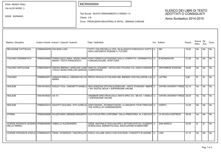MCRI040004 IPSIA RENZO FRAU VIA ALDO MORO, 3 ELENCO DEI LIBRI DI TESTO ADOTTATI O CONSIGLIATI Anno Scolastico 2014-2015 Tipo Scuola: NUOVO ORDINAMENTO II GRADO 1-2 62028 SARNANO Classe: 2 B Corso: PRODUZIONI INDUSTRIALI E ARTIG. - BIENNIO COMUNE Materia / Disciplina Codice Volume Autore1 / Autore2 / Autore3 RELIGIONE CATTOLICA 9788805029792 SOLINAS LUIGI ITALIANO GRAMMATICA Titolo / Sottotitolo Vol. Editore Nuova Da Cons. Adoz. Acq. SEI 19,20 No No No 9788842446958 FERRALASCO ANNA / MOISO ANNA PUNTI FERMI PLUS EDIZIONE GIALLA COMPATTA / GRAMMATICA, U MARIA / TESTA FRANCESCO COMUNICAZIONE, SCRITTURA B.MONDADORI 21,00 No No No ITALIANO ANTOLOGIE 9788879525015 SIMONA BRENNA / MARILENA CAIMI ANNI DA LEGGERE / ANTOLOGIA ITALIANA VOL.UNICO+AGENDA U / PAOLO SENNA PIERLUISA SEREGNI COMPETENZE ARCHIMEDE EDIZIONI 25,80 No No No ITALIANO 9788880425571 ASNAGHI EMILIA / ASNAGHI SILVIA PROVA INVALSI DI ITALIANO NEL BIENNIO CON SOLUZIONI (LA) U MARIA LATTES 8,90 Si Si No INGLESE 9780194795333 RADLEY PAUL / SIMONETTI DANIELA NEW HORIZONS OPTIONS ELEMENTARY - MISTO STANDARD / SB&PB U + MY DIGITAL BOOK + ESPANSIONE ONLINE OXFORD UNIVERSITY PRESS 22,10 No No No INGLESE 9780194706322 AA VV OXFORD UNIVERSITY PRESS 26,50 No No No INGLESE 9788820334314 SGUOTTI GIULIANA / ZITO AURELIA HAIR FASHION - STUDENT'S BOOK / A LINGUISTIC TOUR THROUGH U THE WORLD OF HAIRDRESSERS HOEPLI 21,00 No No No STORIA 9788835026099 PALAZZO MARIO / BERGESE MARGHERITA CLIO FOCUS PER LA RIFORMA / DALLA PREISTORIA AL X SECOLO U LA SCUOLA EDITRICE 28,50 No No No SAN MARCO 23,50 Si Si No LINX 21,10 No No No SCIENZE INTEGRATE (SCIENZA 9788884880680 GABALLO ALESSANDRA DELLA TERRA) TUTTI I COLORI DELLA VITA / IN ALLEGATO FASCICOLO CIOTTI, U NON LASCIAMOCI RUBARE IL FUTURO Prezzo GRAMMAR SPECTRUM GOLD: MISTO SPEC S/C / BK S/C + MDB2.0 U + ESPANSIONE ONLINE IGIENE, ANATOMIA E FISIOLOGIA PER IL SETTORE ESTETICO / ELEMENTI U DI BIOLOGIA, DERMATOLOGIA, EDUCAZIONE ALIMENTARE SCIENZE INTEGRATE (FISICA) 9788863640274 FRANK / WYSESSION / YANCOPOULOS FISICA VOLUME UNICO CON DVD-ROM / CONCETTI IN AZIONE U Pag. 1 di 2 MCRI040004 IPSIA RENZO FRAU VIA ALDO MORO, 3 ELENCO DEI LIBRI DI TESTO ADOTTATI O CONSIGLIATI Anno Scolastico 2014-2015 Tipo Scuola: NUOVO ORDINAMENTO II GRADO 1-2 62028 SARNANO Classe: 2 B Corso: PRODUZIONI INDUSTRIALI E ARTIG. - BIENNIO COMUNE Materia / Disciplina Codice Volume Autore1 / Autore2 / Autore3 Titolo / Sottotitolo Vol. Editore Prezzo Nuova Da Cons. Adoz. Acq. SCIENZE INTEGRATE (CHIMICA) 9788808211262 BAGATTI FRANCO / CORRADI ELIS CHIMICA INDISPENSABILE (LA) (LME LIBRO MISTO ESSENZIALE) U / DESCO A. ROPA C. ZANICHELLI 22,60 No No No MATEMATICA 9788849417487 SASSO LEONARDO NUOVA MATEMATICA A COLORI - EDIZIONE GIALLA - ALGEBRA 1 E GEOMETRIA 1 / + PALESTRA INVALSI PETRINI 24,10 No No No MATEMATICA 9788849417494 SASSO LEONARDO NUOVA MATEMATICA A COLORI - EDIZIONE GIALLA - ALGEBRA 2 E GEOMETRIA 2 PETRINI 24,10 No Si No TECNOLOGIA DELL'INFORMAZIONE 9788874853007 FIUMETTI MARIA / CASINI ROPA ALESSANDRA INFORMATICA EASY - VOLUME UNICO E DELLA COMUNICAZIONE U JUVENILIA 21,65 No No No DIRITTO ED ECONOMIA DIRITTI ALLA META U PARAVIA 20,40 No No No TECNOLOGIE E TECNICHE DI RAPPRESENTAZIONE GRAFICA U ATLAS 19,00 No No No LA SCUOLA EDITRICE 9,90 No No No 9788839533937 CATTANI MARIA RITA TECNOLOGIE E TECNICHE DI 9788826815961 PINOTTI ANNIBALE RAPPRESENT.GRAFICA CITTADINANZA E COSTITUZIONE 9788835025825 RONGA LUIGI / GENTILE GIANNI / SANVITO CITTADINANZA & COSTITUZIONE / CITTADINANZA & COSTITUZIONE U FRANCESCA Pag. 2 di 2