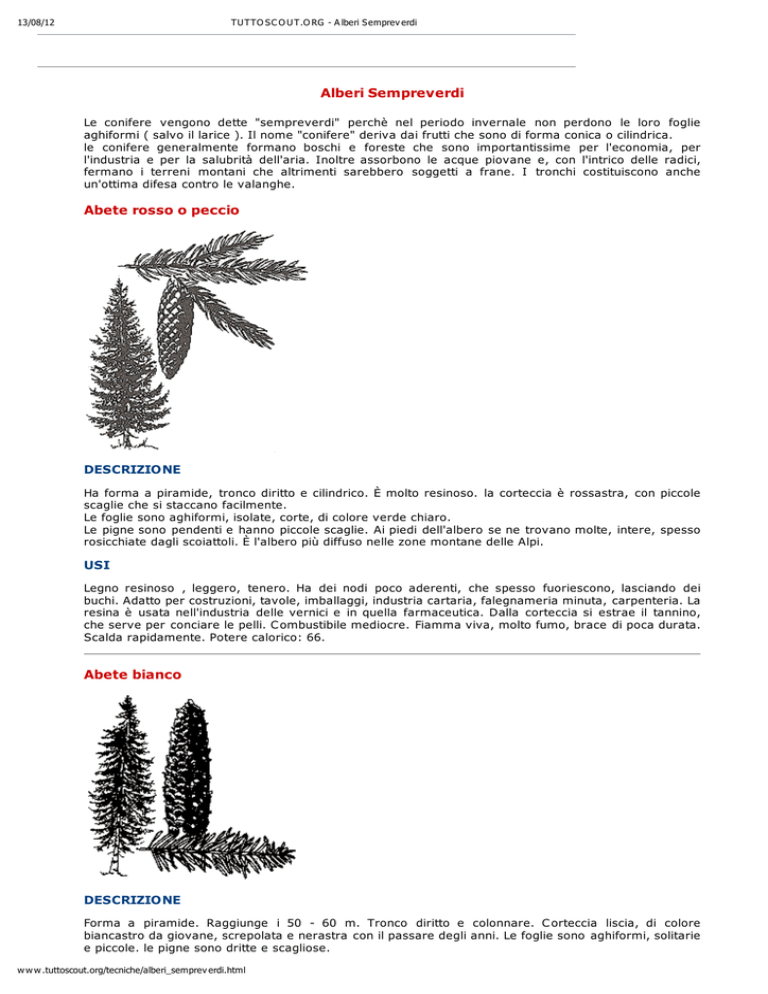13/08/12 TU TTO S C O U T.O RG - A lberi S emprev erdi Alberi Sempreverdi Le conifere vengono dette "sempreverdi" perchè nel periodo invernale non perdono le loro foglie aghiformi ( salvo il larice ). Il nome "conifere" deriva dai frutti che sono di forma conica o cilindrica. le conifere generalmente formano boschi e foreste che sono importantissime per l'economia, per l'industria e per la salubrità dell'aria. Inoltre assorbono le acque piovane e, con l'intrico delle radici, fermano i terreni montani che altrimenti sarebbero soggetti a frane. I tronchi costituiscono anche un'ottima difesa contro le valanghe. Abete rosso o peccio DESCRIZIONE Ha forma a piramide, tronco diritto e cilindrico. È molto resinoso. la corteccia è rossastra, con piccole scaglie che si staccano facilmente. Le foglie sono aghiformi, isolate, corte, di colore verde chiaro. Le pigne sono pendenti e hanno piccole scaglie. Ai piedi dell'albero se ne trovano molte, intere, spesso rosicchiate dagli scoiattoli. È l'albero più diffuso nelle zone montane delle Alpi. USI Legno resinoso , leggero, tenero. Ha dei nodi poco aderenti, che spesso fuoriescono, lasciando dei buchi. Adatto per costruzioni, tavole, imballaggi, industria cartaria, falegnameria minuta, carpenteria. La resina è usata nell'industria delle vernici e in quella farmaceutica. Dalla corteccia si estrae il tannino, che serve per conciare le pelli. C ombustibile mediocre. Fiamma viva, molto fumo, brace di poca durata. Scalda rapidamente. Potere calorico: 66. Abete bianco DESCRIZIONE Forma a piramide. Raggiunge i 50 - 60 m. Tronco diritto e colonnare. C orteccia liscia, di colore biancastro da giovane, screpolata e nerastra con il passare degli anni. Le foglie sono aghiformi, solitarie e piccole. le pigne sono dritte e scagliose. w w w .tuttoscout.org/tecniche/alberi_semprev erdi.html 13/08/12 TU TTO S C O U T.O RG - A lberi S emprev erdi Habitat : montagna ( da 800 a 1.800 m ). USI Mobili, tavole, carpenteria, travi, industria cartaria. Dalla distillazione delle foglie si estrae la tremetina, utilizzata nell'industria delle vernici. Mediocre combustibile, brucia rapidamente con molto fumo. Potere calorifico: 70. Larice DESCRIZIONE Forma a piramide stretta, alto fino a 50 - 60 m. Tronco eretto e slanciato. Molto longevo e di rapida crescita. C orteccia liscia e grigia quando è giovane, poi, con gli anni, diviene sempre più ruvida, spessa, solcata profondamente e di colore bruno rossastro. Foglie aghiformi sottili e tenere, di colore verde chiaro, raggruppate a ciuffi di 20 - 40. Pigne piccole e di colore grigio bruno, che rimangono diversi anni sui rami. È l'unica conifera che perde le foglie in inverno. Habitat: montagna. Ha bisogno di molta luce. È l'albero che raggiunge le altitudini più elevate e che sopporta meglio gelo e venti impetuosi. USI Legno resistente, solido, elastico. È resistentissimo all'umidità. Utilizzato per carpenteria e per falegnameria: infissi, serramnti, pavimenti, rivetimenti. Dalla resina si ricava la trementina che viene utilizzata nell'industria delle vernici. C ombustibile mediocre. Fiamma viva, molto fumo. Brace di poca durata. Potere calorifico: 66. Pino silvestre DESCRIZIONE Forma a piramide alta. Arriva fino a 30 - 40 m. Molto resinoso. C orteccia squamosa, spessa, screpolata, da giovane è rossiccia poi diviene grigio-bruna. Foglie a forma aghiforme. Pigna dritta. Ha bisogno di molta luce. Predilige le valli secche e soleggiate. Vive spontaneo sulle Alpi e in alcune zone dell'Appennino settentrionale. È molto usato nei rimboscimenti. USI Legno tenero e di facile lavorazione. Utilizzato per falegnameria, taole e travi. Dalla distillazione del legno si ricava la pece nera, usata per calafatare le imbarcazioni, e il nero fumo, utilizzato per gli w w w .tuttoscout.org/tecniche/alberi_semprev erdi.html 13/08/12 TU TTO S C O U T.O RG - A lberi S emprev erdi inchiostri. Dalla resina si ricava la trementina che viene impiegata nell'industria delle vernici. C ombustibile mediocre. Fiamma viva, calore intenso ma non duraturo. Potere calorifico: 67. Pino cembro o cirmolo DESCRIZIONE Raggiunge i 15 - 20 m, è a lento accrescimento ed è molto longevo. È molto robusto e vive fino a un'altitudine di 2.500 m. Foglie riunite in mazzetti di 5. USI Il suo legno è pregiato. È odoroso e non viene attaccato dai tarli. Per questa sua proprietà è molto richiesto per lavori di falegnameria e di intaglio. Pino domestico DESCRIZIONE Forma a ombrello. Alto fino a 25 - 30 m. Tronco eretto, ramificato in alto a disegnare una corona a forma di ombrello. C ortecia scagliosa, rosso-bruna da giovane, poi diventa grigia, divisa in grandi placche. Molto resinoso. Foglie aghiformi lunghe ma non pungenti. Habitat: pianura e costa. C resce fino ad altitudini di 500 - 800 m. USI Legno tenero e resinoso, non molto p regiato. Utilizzato in falegnameria, per travi, paleria, nell'industria cartaria. I frutti, pinoli, vengono adoperati nell'industria dolciaria e in quella farmaceutica. Dalla corteccia si estrae il tannino che serve per conciare le pelli. Fiamma viva, colore intenso ma poca brace. Potere calorifico: 67. Tasso w w w .tuttoscout.org/tecniche/alberi_semprev erdi.html 13/08/12 TU TTO S C O U T.O RG - A lberi S emprev erdi DESCRIZIONE Forma a piramide tozza. Raggiunge i 15 - 20 metri di altezza. Tronco eretto e ramoso fino dalla base. C orteccia rossastra liscia, che con l'età si squama. È di lento accrescimento ed è molto longevo ( fino a 2.000 anni ). Foglie aghiformi tenere, piatte, acute ma non pungenti. Foglie e semi sono velenosi. Habitat: vive isolato in montagna, in luoghi ombrosi e umidi e lungo il corso di torrenti di collina. USI Legno durissimo, pesante. Utilizzato per ebanisteria e lavori di tornio. | indice © 1996-2003 TUTTOSC OUT.ORG. All Rights Reserved. Testi di Attilio Grieco - TUTTOSC OUT - Editrice PIEMME: Informazioni sull'edizione. w w w .tuttoscout.org/tecniche/alberi_semprev erdi.html