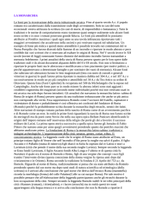 I° Re: Romolo (753-716 a.C.) Il primo re fu naturalmente Romolo. Tracciato il solco ed eliminato il fratello, il problema più incombente era di trovare le donne per il suo territorio, senza donne non era possibile alcuna discendenza e nessun futuro glorioso avrebbe segnato la sorte di Roma. A questo punto Romolo decise ancora una volta di risolvere la questione con l'inganno: lo stratagemma passò alla storia come il ratto delle sabine. Il piano era di invitare a una festa il vicino popolo dei sabini con le donne al seguito, e al momento opportuno, sfruttando la sorpresa, rapire quante più fanciulle possibile. Il piano riuscì alla perfezione: il bottino fu di seicentottantatre ragazze vergini, meno una, Ersilia, rapita per errore, che diventò la sposa di Romolo. Al ratto seguì l'inevitabile guerra tra romani e sabini che finì soltanto grazie al provvidenziale intervento di Ersilia: ella si fece portavoce delle sabine rapite supplicando i contendenti di mettere fine a quella inutile carneficina che avrebbe rischiato di uccidere i padri dei loro figli. A quanto pare le sabine si erano abituate (o rassegnate) ai rapitori. Fatta la pace, Tito Tazio, re dei sabini, divenne monarca alla pari di Romolo e si stabilì con il suo popolo sul Quirinale (Tito era originario di Curi e i suoi vennero chiamati quiriti). A Romolo si attribuisce la prima divisione sociale delle genti romane: il popolo venne diviso in tre etnie (o tribù): I Ramnes (o Ramini) di Romolo, I Tities (o Tizi) di Tito Tazio e i Luceres (o Luceri), tribù che raggruppava le genti di origine etrusca. Romolo decise poi di formare un senato (Curia) composto da 100 (poi ampliato a 200) patres (padri fondatori) nominati dal re, ad esclusione dei Luceri. Anche l'esercito fu diviso in milites e celeres, i primi fanti e i secondi cavalieri. I due reggenti decisero poi di bonificare l'area del Campidoglio e costruire un Foro, ovvero uno spazio attorno al quale si sarebbero affacciati la Curia, i templi delle divinità maggiori, i mercati e le botteghe degli artigiani; il centro politico, religioso ed economico della città romana. Accade però che Tito Tazio morì in seguito a un'imboscata forse tesagli da qualche città sabina limitrofa e Romolo si trovò solo a fronteggiare una popolazione spaccata in due: per arginare la crisi si profuse in una nuova divisione della popolazione. Si decise di dividere i romani in patrizi (i patres, i fondatori storici) e plebei (tutti gli altri). Ai primi spettavano i compiti religiosi ed amministrativi, ai secondi l'artigianato, il commercio e il lavoro nei campi. I matrimoni tra cittadini di classi diverse furono proibiti. La morte di Romolo è avvolta nel mito: scomparve in una notte di tempesta durante un'eclissi, il suo corpo non fu mai ritrovato. Si dice che salì in cielo sul carro di Marte per diventare il protettore dei romani col nome di Quirino (ma forse fu solo vittima di un complotto). 1 II° Re: Numa Pompilio, il pio (716-672 a.C.) Dopo la morte di Romolo seguì un periodo di confusione in cui si susseguirono alla guida di Roma dieci patrizi, mentre le stirpi sabine e romane lottavano tra loro per la supremazia. Alla fine si decise di eleggere a reggente Numa Pompilio, di stirpe sabina e marito di Tazia, la figlia del defunto re sabino. Numa Pompilio era un uomo al di sopra delle parti: era molto religioso e poco portato alla frenesia della vita politica tanto che alla responsabilità del governo preferì in principio la calma di Curi. Ma i romani lo convinsero dicendogli che governando avrebbe reso un servizio a Dio. Il suo regno fu contraddistinto dalle riforme religiose: introdusse riti meno sanguinari, riformò il calendario portandolo da 10 a 12 mesi (aggiunse Gennaio, in onore di Giano Bifronte, e Febbraio, in precedenza l'anno seguiva il ciclo lunare e cominciava da Marzo, consacrato a Marte), i giorni dell'anno passarono da 304 a 355. A lui si attribuisce anche la fondazione del collegio dei pontefici, massime cariche religiose, e la suddivisione della popolazione per mestieri (fabbri, vasai, carpentieri e orefici). Fu un re ben voluto dalla plebe e molto popolare. Morì a ottantanni senza aver mai fatto una guerra, quando già le due stirpi riappacificate gli avevano eretto un mausoleo sul Gianicolo. III° Re: Tullo Ostilio, il distruttore di Alba (672-640 a.C.) Tullo Ostilio, di origine latina, era assai diverso dal suo predecessore: Il suo nome venne associato alla distruzione di Albalonga. Per avere un casus belli che giustificasse la guerra come giusta agli occhi degli dei istituì il collegio dei feziali, i quali avevano il compito di trovare un pretesto per ogni belligeranza. La guerra con Alba fu lunga e spietata (è qui che si svolse l'episodio degli Orazi e Curiazi). La città fu distrutta e la sua popolazione deportata sul monte Celio; Il suo re, Mezio Fufezio, fu sventrato atrocemente, legato mani e piedi a quattro quadrighe con cavalli partite in direzioni opposte. Gli ultimi anni del suo regno videro la costruzione di una nuova sede senatoriale (Curia Hostilia) e la sconfitta degli Etruschi di Veio, nonché una terribile epidemia di peste. Morì in un incendio provocato da un fulmine scagliato da Giove, il quale pare non avesse gradito un rito sacro a lui dedicato. 2 IV° Re: Anco Marzio, il fondatore di Ostia (640-616 a.C.) Anco Marzio, di stirpe sabina e marito di una figlia di Numa Pompilio, divenne il IV° re di Roma. Dopo aver conquistato il terreno che separava la città dalla costa, fondò Ostia, così anche Roma, come si disse, poté avere il suo Pireo (il porto di Atene). Fornita Roma di uno sbocco marittimo e migliorata la navigabilità del Tevere, aumentarono i commerci, soprattutto del sale, per estrarre il quale si scavarono nuove saline e si costruirono per conservarlo dei magazzini lungo il fiume. Il re ordinò poi la distribuzione gratuita del prodotto, cosa che risultò gradita alla popolazione, che lo usava per conservare i cibi. Le barche ris